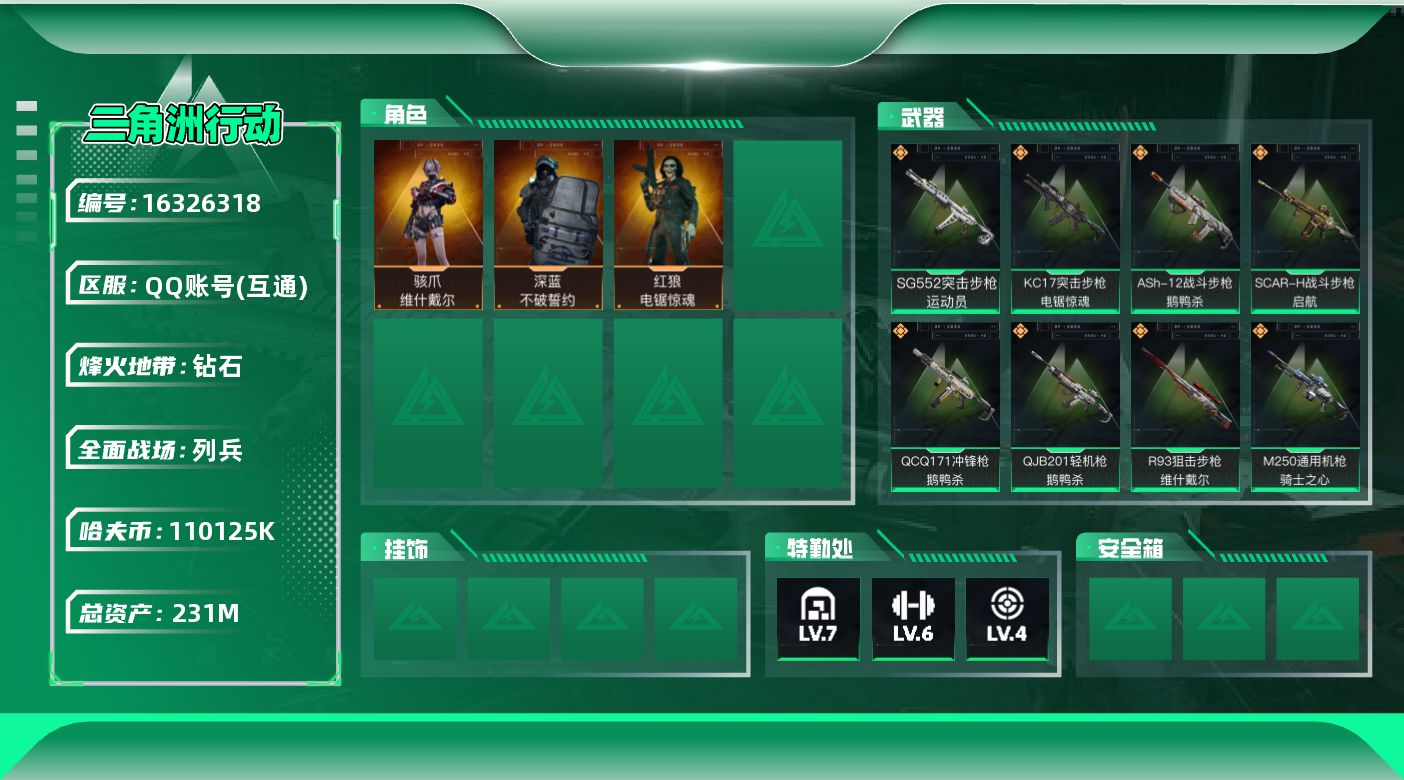 [16326318]110125k哈伏币-209m流动资产-60烽火等级-钻石-11战场等级-列兵 【干员外观】:骇爪-维什戴尔,深蓝-不破誓约,红狼-电锯惊魂 【近战皮肤】:近战-黑鹰 【传说外观】:M4A1突击步枪-阿米娅,ASh-12战斗步枪-鹅鸭杀,SG552突击步枪-运动员,SCAR-H战斗步枪-启航,KC17突击步枪-电锯惊魂,QCQ171冲锋枪-鹅鸭杀,M250通用机枪-骑士之心,QJB201轻机枪-鹅鸭杀,R93狙击步枪-维什戴尔 【史诗外观】:ASh-12战斗步枪-无极限,AUG突击步枪-蝮蛇,G3战斗步枪-流沙送葬,AS Val突击步枪-百步穿杨,K437突击步枪-守护者,MP5冲锋枪-战术竞备,MP5冲锋枪-竞技风,勇士冲锋枪-工业狂潮,MP7冲锋枪-守护者,Mini-14射手步枪-守护者,SV-98狙击步枪-囚徒,SV-98狙击步枪-猎鳄行动,AWM狙击步枪-无极限,复合弓-守护者 【稀有外观】:M7战斗步枪-天际线,AKM突击步枪-战术演练,AKM突击步枪-肃杀,QBZ95-1突击步枪-公平竞技,ASh-12战斗步枪-繁盛,K416突击步枪-酷炫狂拽,M7战斗步枪-捣蛋鬼,SCAR-H战斗步枪-荣耀列队,SCAR-H战斗步枪-黄昏,G3战斗步枪-战术演练,G3战斗步枪-主宰,腾龙突击步枪-冰天雪地,MP5冲锋枪-哈夫克卫队,P90冲锋枪-黄昏,P90冲锋枪-捣蛋鬼,Vector冲锋枪-先锋,UZI冲锋枪-亚特兰蒂斯,SMG-45-行动开启,SMG-45冲锋枪-幻影结构,勇士冲锋枪-主宰,勇士冲锋枪-冰天雪地,S12K霰弹枪-战术演练,QJB201轻机枪-黄昏,QJB201轻机枪-哈夫克卫队,Mini-14射手步枪-荣耀列队,SKS射手步枪-弄臣,SR-25射手步枪-开拓,G18-星链科技,G18-哈夫克航天 【普通外观】:腾龙突击步枪-古铜,M4A1突击步枪-粉色涂装,M4A1突击步枪-高雅黑,M4A1突击步枪-海色,QBZ95-1突击步枪-高雅黑,QBZ95-1突击步枪-海浪,QBZ95-1突击步枪-海色,QBZ191突击步枪-三角洲力量,K416突击步枪-几何迷彩,K416突击步枪-高雅黑,M16A4突击步枪-高雅黑,AUG突击步枪-浅蓝涂装,M7战斗步枪-红色涂装,SG552突击步枪-浅蓝涂装,AK-12突击步枪-变色龙,SCAR-H战斗步枪-数码迷彩