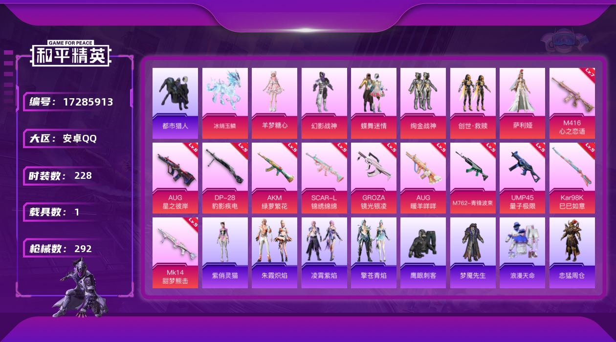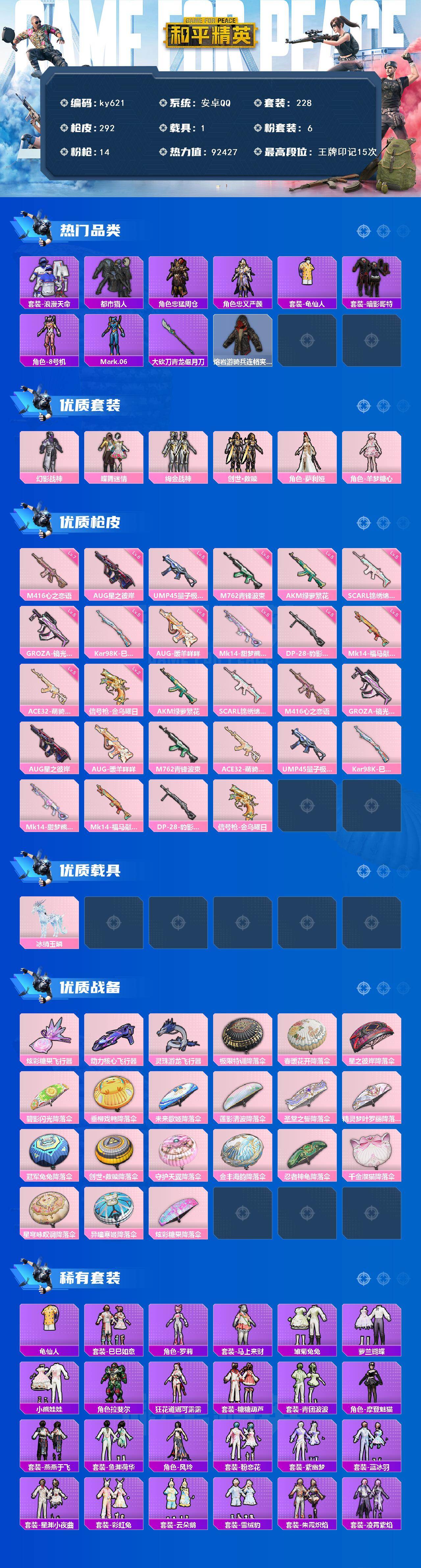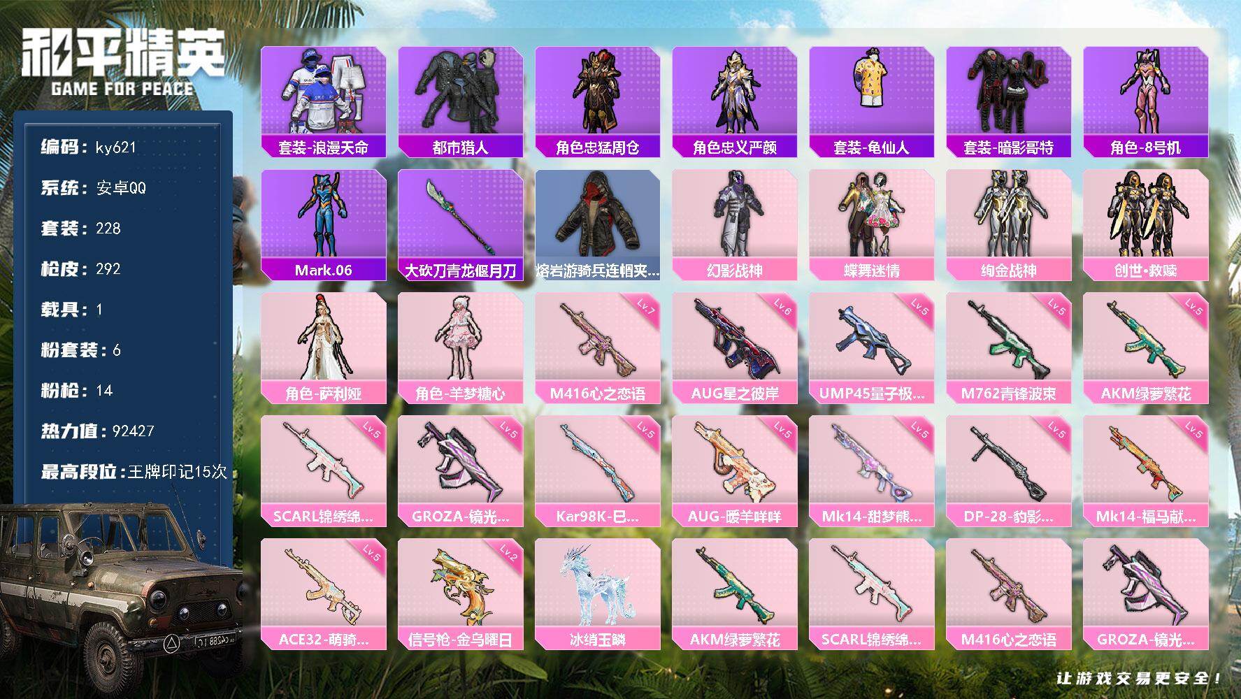 [17285913]安卓 手Q-6粉装-14特效枪-1载具-6粉色飞行器-92427热力值-15王牌印记-228套装-292枪皮