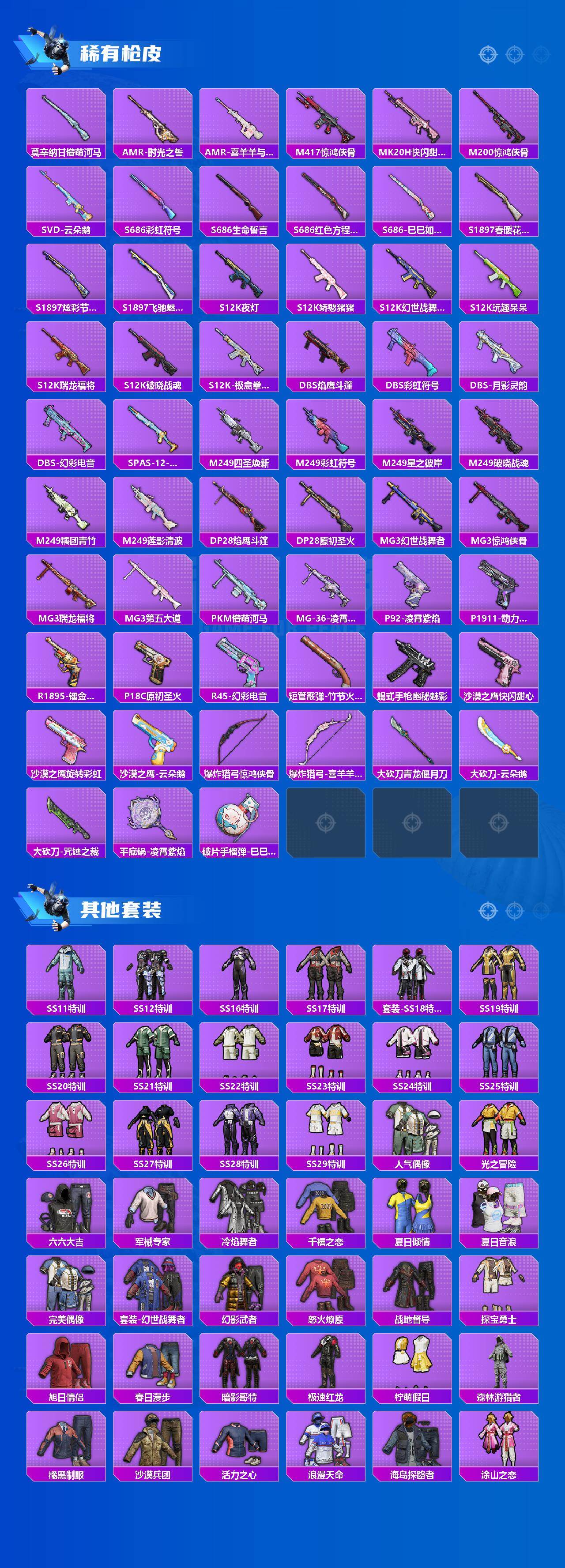 AKM-绿萝繁花,SCAR-L-锦绣绵绵,M416-心之恋语,GROZA-镜光银凌,AUG-星之彼岸,AUG-暖羊咩咩,M762-青锋波束,UMP45-量子极限,Kar98K-巳巳如意