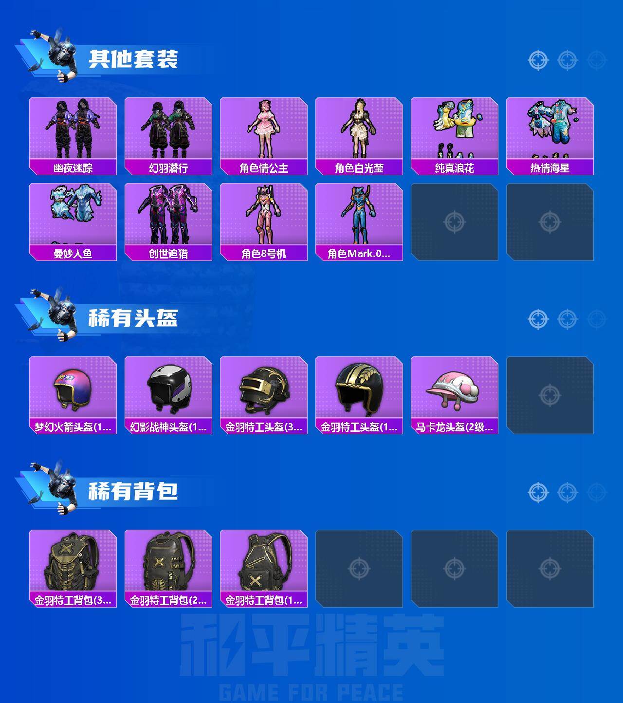 - [12846207]苹果 手Q-1粉装-4特效枪-0载具-0粉色飞行器-55803热力值-21王牌印记-142套装-181枪皮 【热门品类】:套装-浪漫天命,套装-深海小丑鱼,套装-小丑鱼,套装-奇异狩猎者,套装-忍者信条,套装-龟仙人,套装-暗影哥特,小恶魔头饰,M416-星际漫游 【粉色套装】:粉装-数码大师 【粉色枪皮等级】:M416-五爪金龙(七级),Vector-绯穹魔姬(七级),Kar98K-巳巳如意(五级),DP-28-豹影疾电(四级) 【粉色枪皮】:M416-五爪金龙,Vector-绯穹魔姬,Kar98K-巳巳如意,DP-28-豹影疾电 【粉色降落伞】:百万伏特降落伞,未来战士降落伞,潮汐统领降落伞,香水柠檬降落伞,幻影飞狐降落伞 【稀有套装】:套装-龟仙人 【稀有枪皮】:AKM-冰凉西瓜,AKM-夜灯,AKM-奇异狩猎者,AKM-生命誓言,AKM-百万伏特,AKM-破晓战魂,AKM-缤纷海域,AKM-龙的传人,M16A4-幻世战舞者,M16A4-星际漫游,M16A4-红色方程式,SCAR-L-炫彩节奏,SCAR-L-红色方程式,SCAR-L-雷霆特警,SCAR-L-黄金龙骨,M416-星际漫游,M416-绯红前夜,M416-蓝色火焰,GROZA-影袭,GROZA-治愈之星,GROZA-田园牧歌,GROZA-银河战甲,GROZA-雷霆特警,AUG-天降萌叽,AUG-耀粉歌者,QBZ-原初圣火,QBZ-彩虹符号,M762-天降萌叽,M762-奇异狩猎者,M762-牛气冲天,M762-瑞龙福将,M762-生命誓言,M762-绯红前夜,M762-镭射皇者,Mk47-百万伏特,G36C-时空追击者,AC-VAL-天降萌叽,蜜獾-天降萌叽,蜜獾-娇憨猪猪,UZI-天降萌叽,UZI-娇憨猪猪,UZI-幻影战神,UZI-影袭,UZI-炫彩节奏,UMP45-夜灯,UMP45-时空追击者,UMP45-星际漫游,UMP45-生命誓言,Vector-彩虹符号,Vector-治愈之星,Vector-生命誓言,Vector-田园牧歌,汤姆逊-天降萌叽,汤姆逊-奇异狩猎者,汤姆逊-幻影战神,汤姆逊-耀粉歌者,P90-巳巳如意,Kar98K-彩虹符号,Kar98K-炫彩节奏,Kar98K-王子的夏天,Kar98K-红色方程式,M24-治愈之星,M24-冰封烈焰,M24-奇异狩猎者,AWM-不夜海上