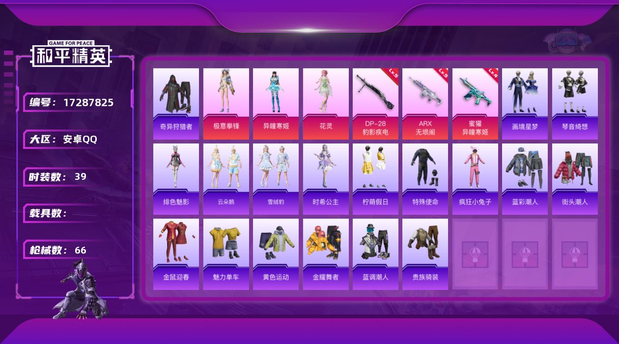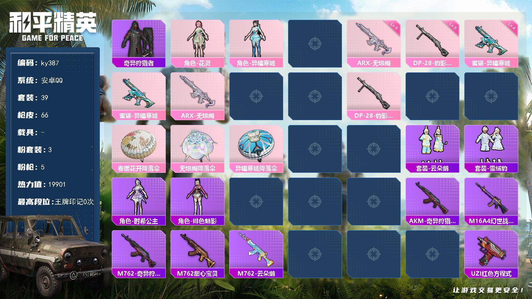 [17287825]安卓 手Q-3粉装-5特效枪-0载具-2粉色飞行器-19901热力值-2王牌印记-39套装-66枪皮