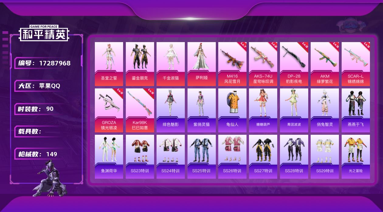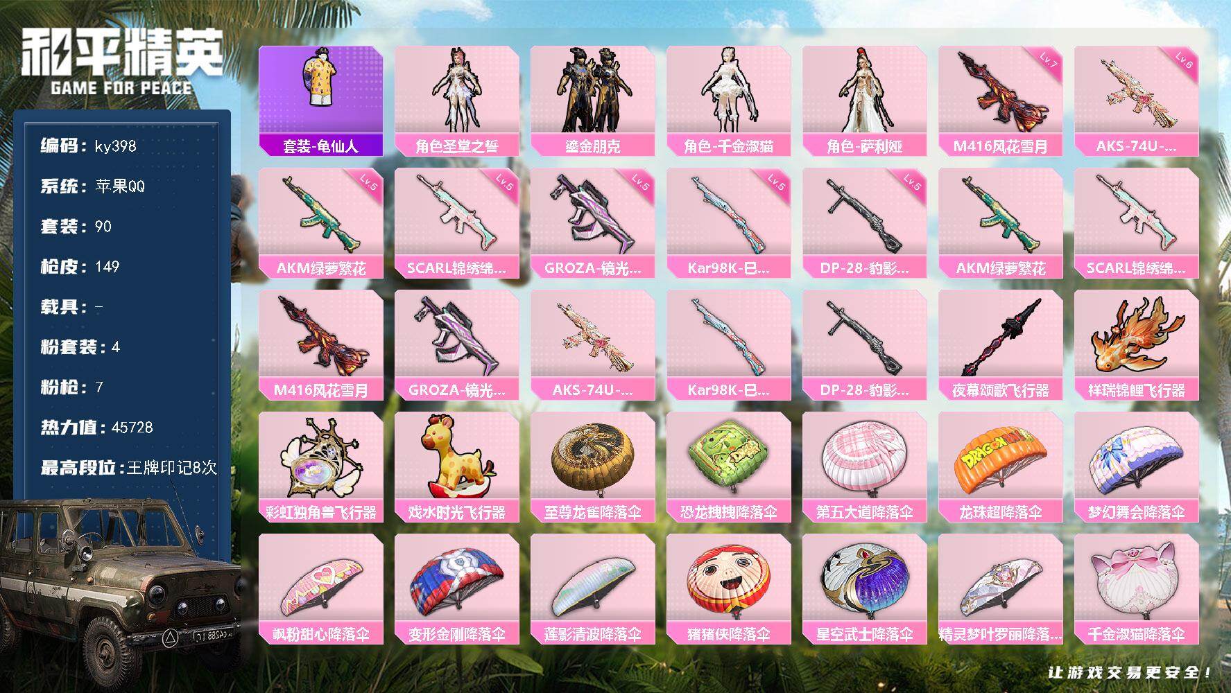 [17287968]苹果 手Q-4粉装-7特效枪-0载具-4粉色飞行器-45728热力值-8王牌印记-90套装-149枪皮