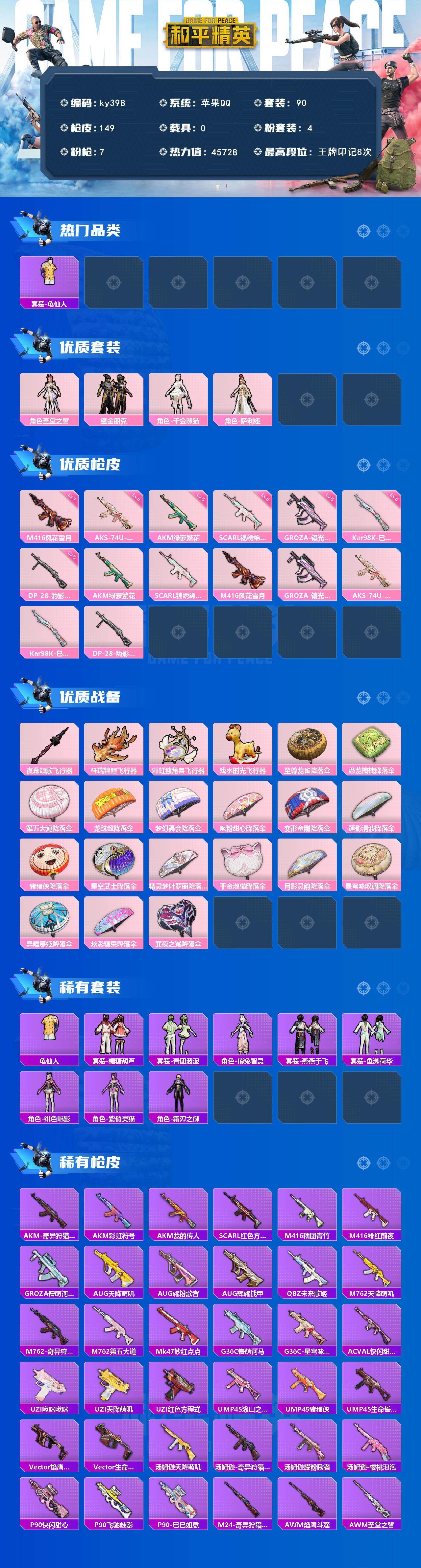 [17287968]苹果 手Q-4粉装-7特效枪-0载具-4粉色飞行器-45728热力值-8王牌印记-90套装-149枪皮 【热门品类】:套装-龟仙人 【粉色套装】:角色-圣堂之誓,粉装-鎏金朋克,角色-千金淑猫,角色-萨利娅 【粉色枪皮等级】:AKM-绿萝繁花(五级),SCAR-L-锦绣绵绵(五级),M416-风花雪月(七级),GROZA-镜光银凌(五级),AKS-74U-星穹咏叹调(六级),Kar98K-巳巳如意(五级),DP-28-豹影疾电(五级) 【粉色枪皮】:AKM-绿萝繁花,SCAR-L-锦绣绵绵,M416-风花雪月,GROZA-镜光银凌,AKS-74U-星穹咏叹调,Kar98K-巳巳如意,DP-28-豹影疾电 【粉色飞行器】:夜幕颂歌飞行器,祥瑞锦鲤飞行器,彩虹独角兽飞行器,戏水时光飞行器 【粉色降落伞】:至尊龙雀降落伞,恐龙拽拽降落伞,第五大道降落伞,龙珠超降落伞,梦幻舞会降落伞,飒粉甜心降落伞,变形金刚降落伞,莲影清波降落伞,猪猪侠降落伞,星空武士降落伞,精灵梦叶罗丽降落伞,千金淑猫降落伞,月影灵韵降落伞,星穹咏叹调降落伞,异瞳寒姬降落伞,炫彩糖果降落伞,罪夜之冕降落伞 【稀有套装】:套装-龟仙人,套装-糖糖葫芦,套装-青团波波,角色-俏兔智灵,套装-燕燕于飞,套装-鱼渊荷华,角色-绯色魅影,角色-紫俏灵猫,角色-霜刃之御 【稀有枪皮】:AKM-奇异狩猎者,AKM-彩虹符号,AKM-龙的传人,SCAR-L-红色方程式,M416-糯团青竹,M416-绯红前夜,GROZA-懵萌河马,AUG-辉耀战甲,AUG-天降萌叽,AUG-耀粉歌者,QBZ-未来歌姬,M762-天降萌叽,M762-奇异狩猎者,M762-第五大道,Mk47-妙红点点,G36C-懵萌河马,G36C-星穹咏叹调,AC-VAL-快闪甜心,UZI-啾咪啾咪,UZI-天降萌叽,UZI-红色方程式,UMP45-涂山之恋,UMP45-猪猪侠,UMP45-生命誓言,Vector-焰鹰斗篷,Vector-生命誓言,汤姆逊-天降萌叽,汤姆逊-奇异狩猎者,汤姆逊-耀粉歌者,汤姆逊-樱桃泡泡,P90-快闪甜心,P90-飞驰魅影,P90-巳巳如意,M24-奇异狩猎者,AWM-焰鹰斗篷,AWM-圣堂之誓,SKS-炫彩节奏,VSS-彩虹符号,Mini14-涂山之恋,Mini14-熔岩统帅,Mini14-耀粉歌者,Mk14-治愈之星,