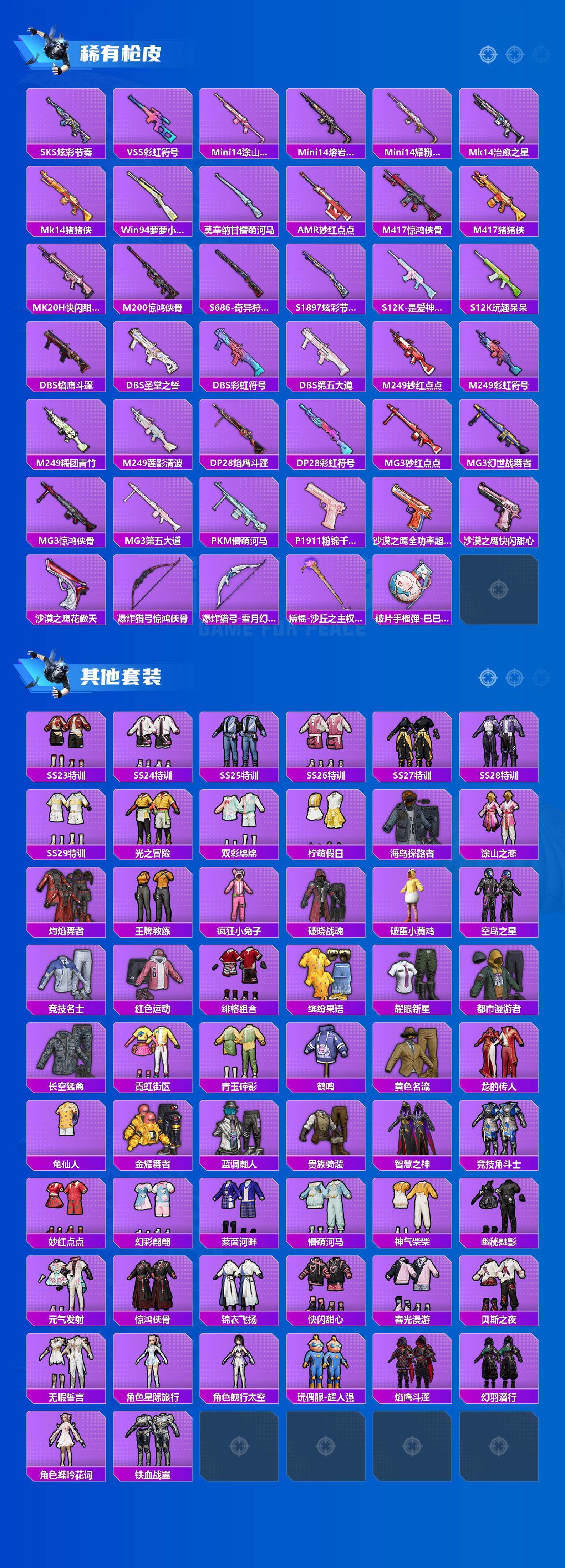【稀有枪皮】:AKM-奇异狩猎者,AKM-彩虹符号,AKM-龙的传人,SCAR-L-红色方程式,M416-糯团青竹,M416-绯红前夜,GROZA-懵萌河马,AUG-辉耀战甲,AUG-天降萌叽,AUG-耀粉歌者,QBZ-未来歌姬,M762-天降萌叽,M762-奇异狩猎者,M762-第五大道,Mk47-妙红点点,G36C-懵萌河马,G36C-星穹咏叹调,AC-VAL-快闪甜心,UZI-啾咪啾咪,UZI-天降萌叽,UZI-红色方程式,UMP45-涂山之恋,UMP45-猪猪侠,UMP45-生命誓言,Vector-焰鹰斗篷,Vector-生命誓言,汤姆逊-天降萌叽,汤姆逊-奇异狩猎者,汤姆逊-耀粉歌者,汤姆逊-樱桃泡泡,P90-快闪甜心,P90-飞驰魅影,P90-巳巳如意,M24-奇异狩猎者,AWM-焰鹰斗篷,AWM-圣堂之誓,SKS-炫彩节奏,VSS-彩虹符号,Mini14-涂山之恋,Mini14-熔岩统帅,Mini14-耀粉歌者,Mk14-治愈之星,