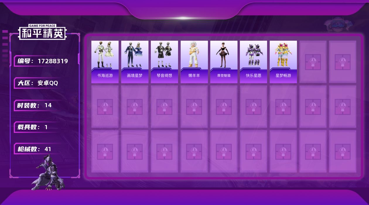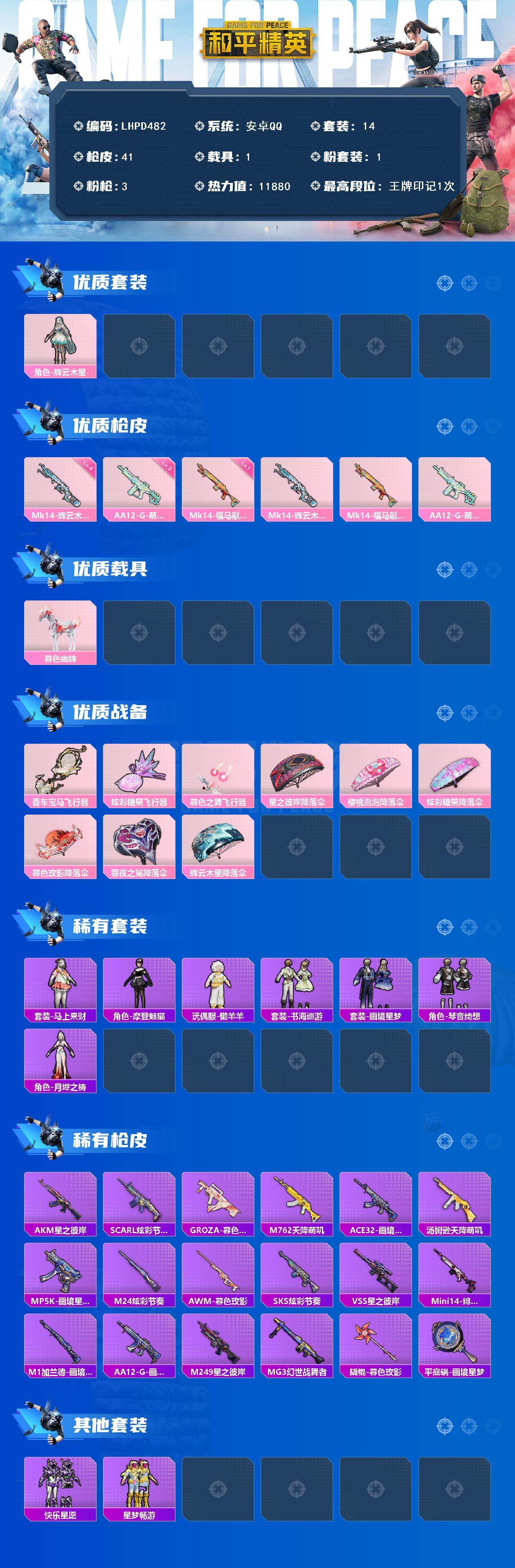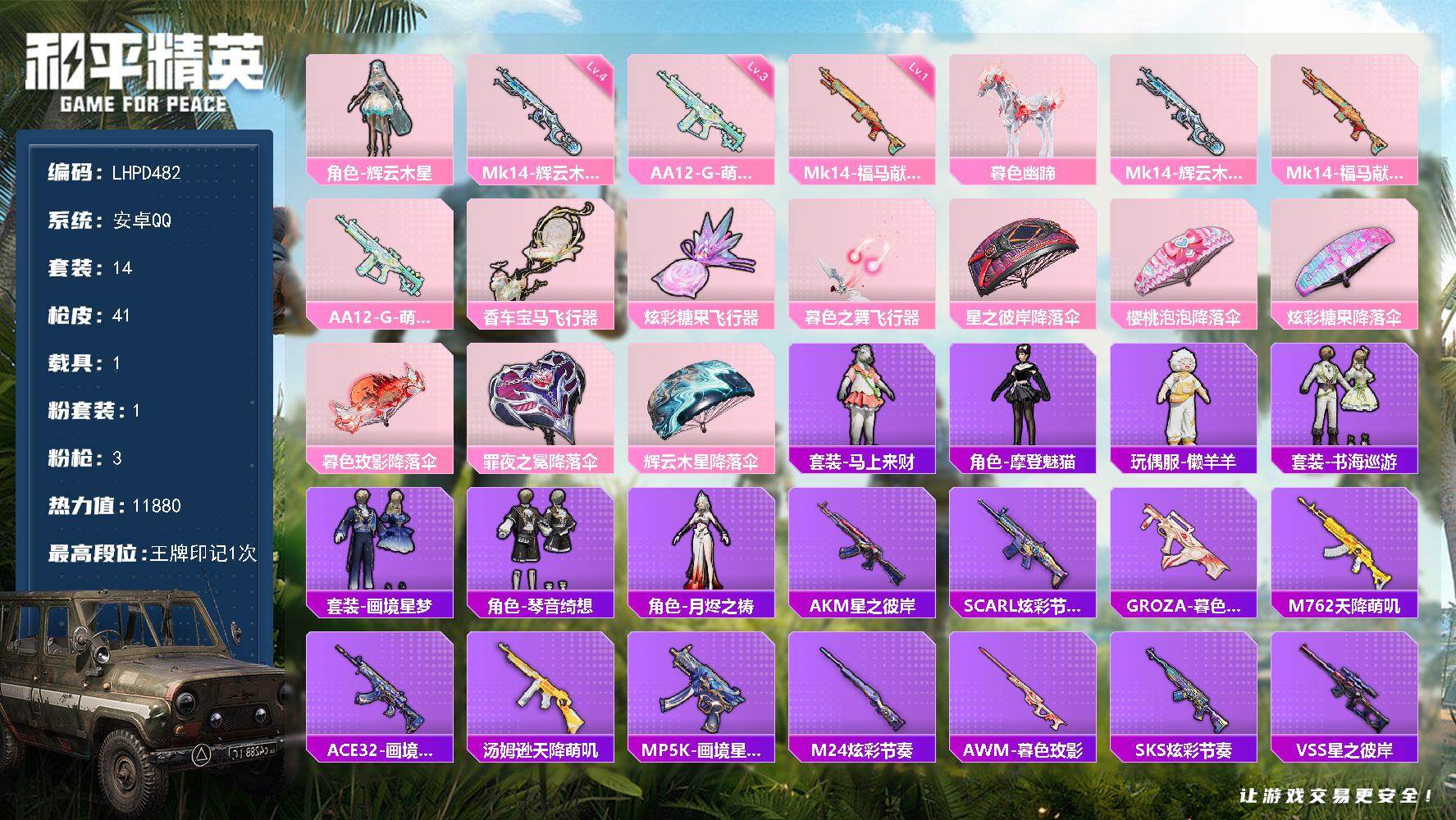[17288319]【特价出售/店主推荐】安卓 手Q-1粉装-3特效枪-1载具-3粉色飞行器-11880热力值-1王牌印记-14套装-41枪皮 【粉色套装】:角色-辉云木星 【粉色枪皮等级】:Mk14-辉云木星(四级),Mk14-福马献瑞(一级),AA12-G-萌骑幻想(三级) 【粉色载具】:暮色幽蹄 【粉色枪皮】:Mk14-辉云木星,Mk14-福马献瑞,AA12-G-萌骑幻想 【粉色飞行器】:香车宝马飞行器,炫彩糖果飞行器,暮色之舞飞行器 【粉色降落伞】:星之彼岸降落伞,樱桃泡泡降落伞,炫彩糖果降落伞,暮色玫影降落伞,罪夜之冕降落伞,辉云木星降落伞 【稀有套装】:套装-雪国风尚,套装-马上来财,角色-摩登魅猫,玩偶服-懒羊羊,套装-书海巡游,套装-画境星梦,套装-琴音绮想,角色-月烬之祷 【稀有枪皮】:AKM-星之彼岸,SCAR-L-炫彩节奏,GROZA-暮色玫影,M762-天降萌叽,ACE32-画境星梦,汤姆逊-天降萌叽,MP5K-画境星梦,M24-炫彩节奏,AWM-暮色玫影,SKS-炫彩节奏,VSS-星之彼岸,Mini14-绯穹魔姬,M1加兰德-画境星梦,AA12-G-画境星梦,M249-星之彼岸,MG3-幻世战舞者,撬棍-暮色玫影,平底锅-画境星梦 【其他套装】:套装-快乐星愿,套装-星梦畅游 【营地ID】:1042735630