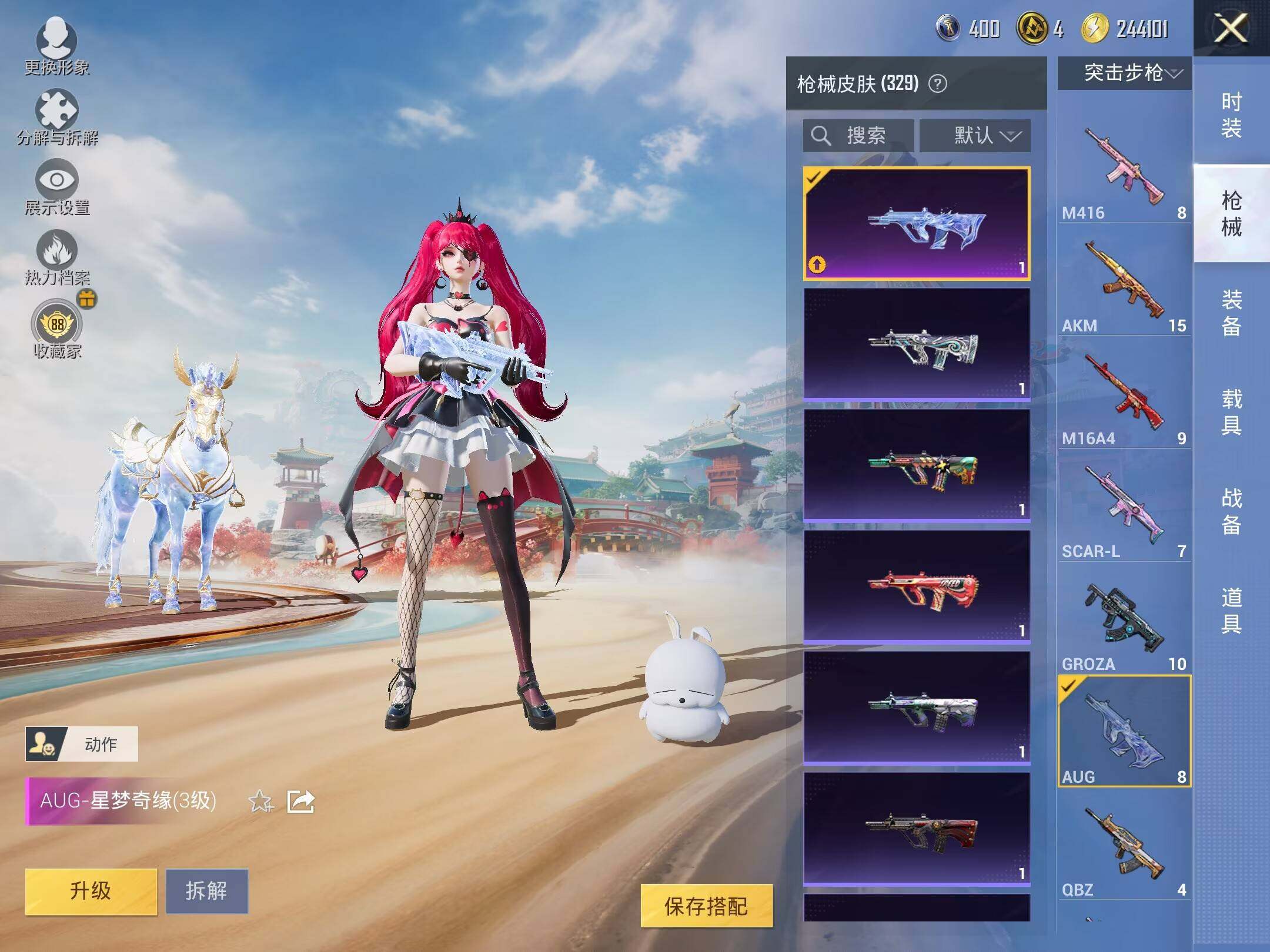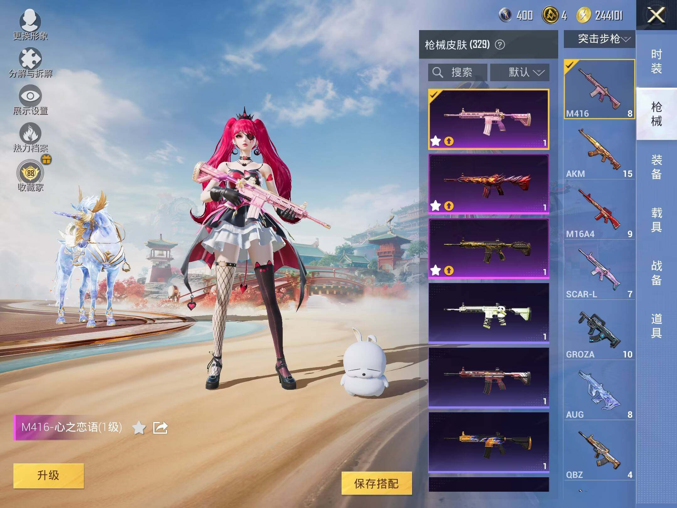 AKM-甜心宝贝,AKM-炫紫旋律,SCAR-L-梦幻火箭,M416-五爪金龙,M416-心之恋语,M416-风花雪月,AUG-星梦奇缘,M762-甜蜜誓约,M762-激战未来,UMP45-相思残雪,Kar98K-伏魔团,Kar98K-巳巳如意,M24-星之信仰,Mini14-龙虾霸霸,DP-28-扶摇飞仙