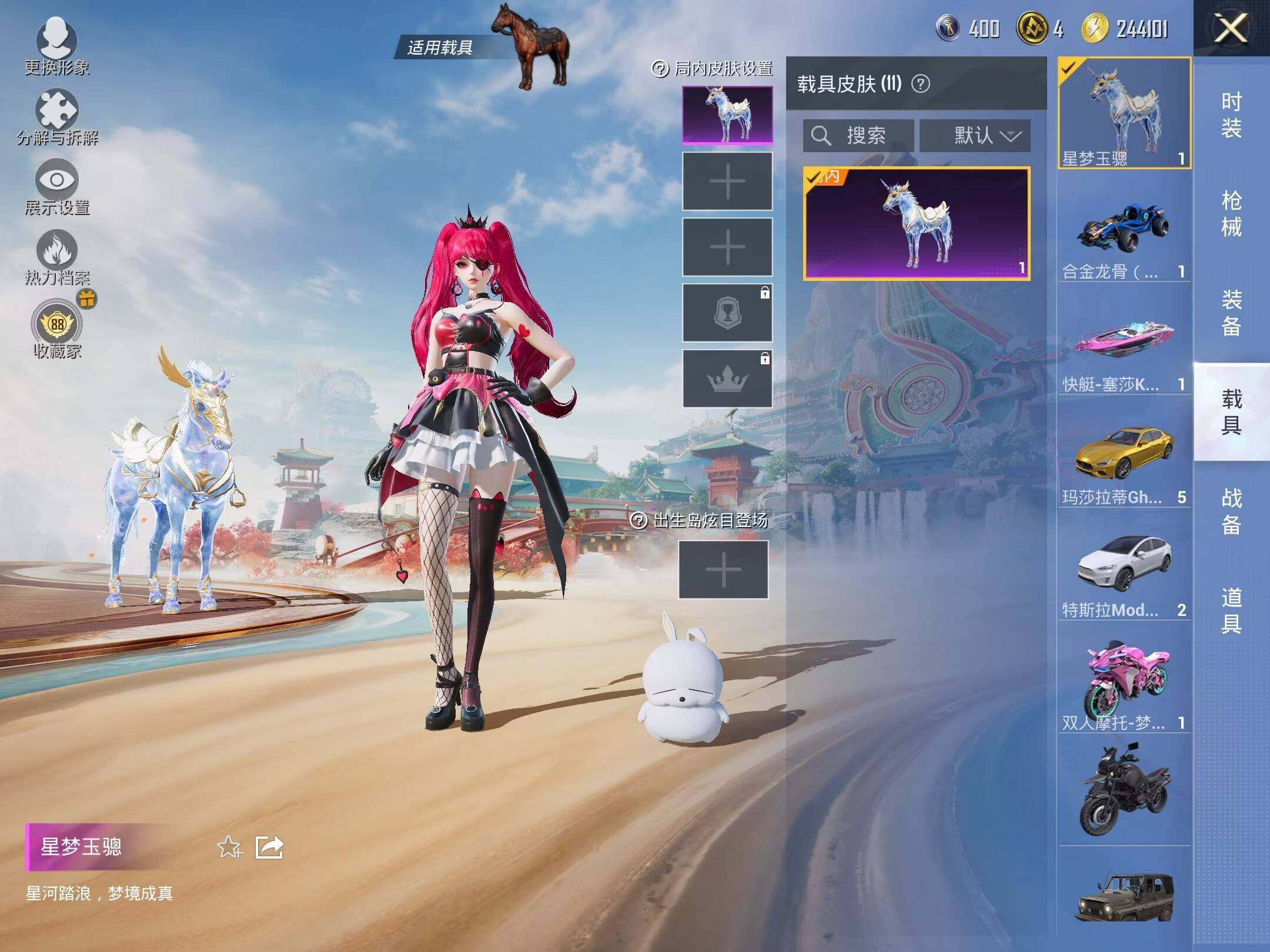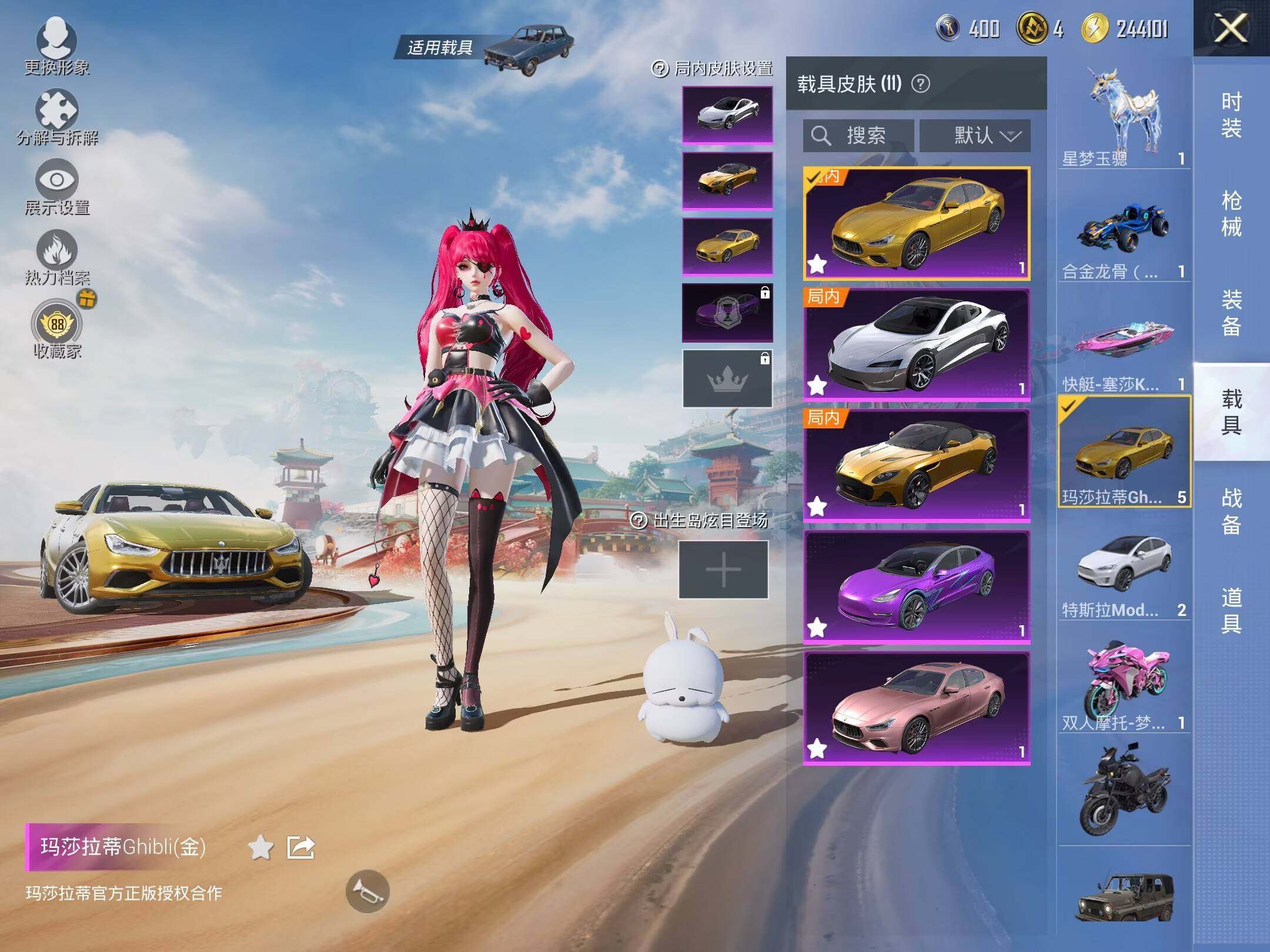 【粉色载具】:特斯拉Model 3(奇幻紫),特斯拉Model X(冷光银),特斯拉Model X(珍珠白),特斯拉Roadster(尊享铂),阿斯顿马丁DBS(金),玛莎拉蒂Ghibli(金),玛莎拉蒂Ghibli(粉),合金龙骨(蓝),双人摩托-梦幻火箭,快艇-塞莎KL27(霓虹粉),星梦玉骢