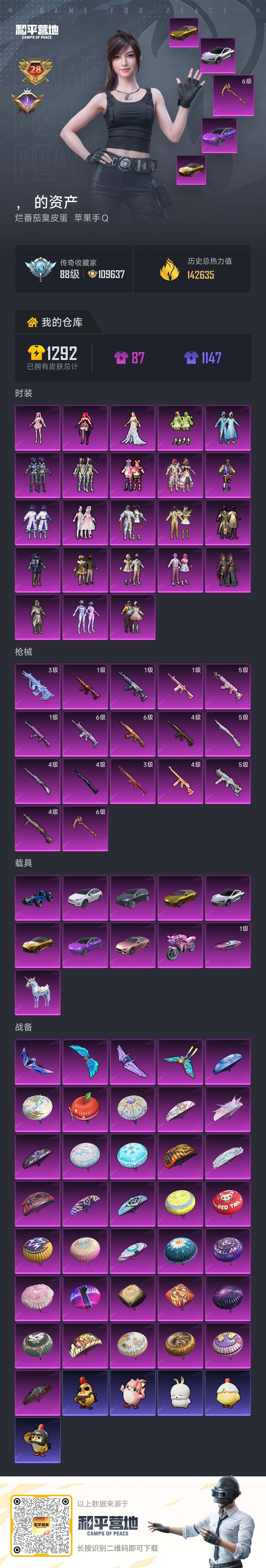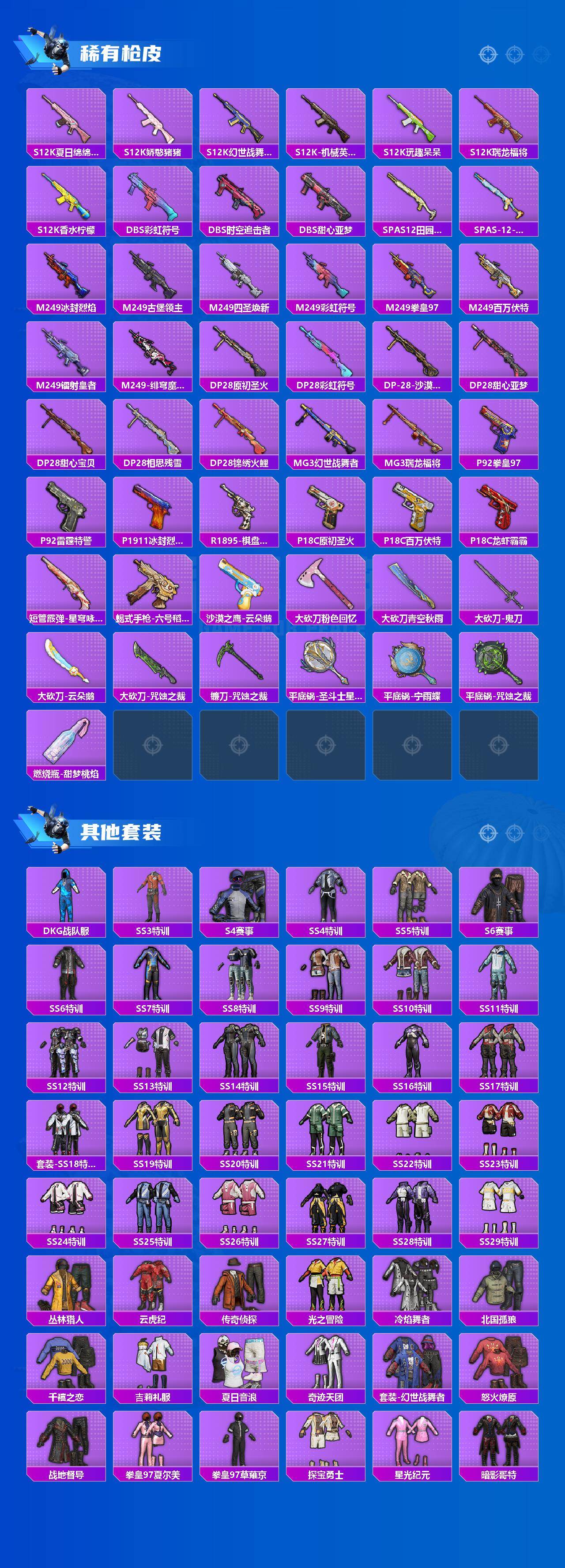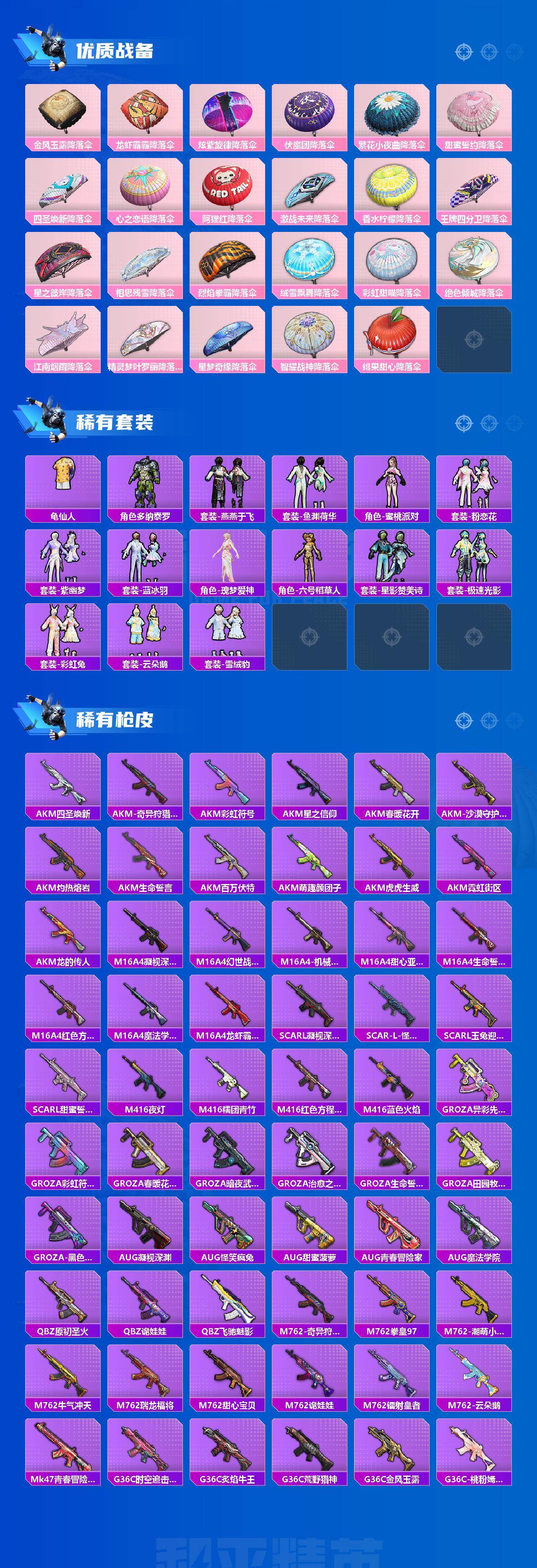 - [13303089]苹果 手Q-1粉装-5特效枪-2载具-0粉色飞行器-26156热力值-1王牌印记-56套装-82枪皮 【热门品类】:套装-龟仙人,角色-8号机 【粉色载具】:迈凯伦570S(旭日黄),双人摩托-梦幻火箭 【粉色套装】:角色-烟云彩露 【粉色枪皮等级】:SCAR-L-梦幻火箭(五级),AUG-星之彼岸(五级),Vector-绯穹魔姬(四级),Kar98K-巳巳如意(二级),DP-28-豹影疾电(二级) 【粉色枪皮】:SCAR-L-梦幻火箭,AUG-星之彼岸,Vector-绯穹魔姬,Kar98K-巳巳如意,DP-28-豹影疾电 【粉色降落伞】:梦之光华降落伞,暗夜鎏金降落伞,江南烟雨降落伞,精灵梦叶罗丽降落伞,喜羊羊与灰太狼降落伞,异瞳寒姬降落伞 【稀有套装】:套装-龟仙人,角色-绛羽幽主,套装-朱霞炽焰,套装-凌霄紫焰,玩偶服-懒羊羊,玩偶服-美羊羊 【稀有枪皮】:M416-糯团青竹,M416-绿野极光,GROZA-懵萌河马,AUG-天降萌叽,M762-天降萌叽,Mk47-妙红点点,G36C-懵萌河马,AC-VAL-天降萌叽,Famas-镜域双华,ACE32-钛晶裂爪,ARX-凌霄紫焰,UMP45-生命誓言,Vector-焰鹰斗篷,Vector-彩虹符号,汤姆逊-天降萌叽,汤姆逊-暗夜鎏金,JS9-凌霄紫焰,P90-巳巳如意,Kar98K-梦幻火箭,M24-影袭,AWM-焰鹰斗篷,AWM-胡桃卫兵,SKS-未来歌姬,Mini14-梦幻火箭,Mini14-炫彩节奏,Mini14-绯穹魔姬,SLR-彩虹符号,QBU-全功率超战,QBU-飒粉甜心,莫辛纳甘-懵萌河马,莫辛纳甘-蜜语绒猫,AMR-妙红点点,AMR-喜羊羊与灰太狼,M200-绿野极光,S1897-暗夜鎏金,S12K-音爆索尼克,DBS-焰鹰斗篷,M249-妙红点点,M249-彩虹符号,DP-28-焰鹰斗篷,DP-28-彩虹符号,MG3-妙红点点,MG3-幻世战舞者,PKM-小鹦鹉BEBE,PKM-懵萌河马,MG-36-凌霄紫焰,P92-凌霄紫焰,沙漠之鹰-全功率超战,TMP-9-江南烟雨,撬棍-咒蚀之裁,平底锅-凌霄紫焰 【其他套装】:套装-SS23特训,套装-SS27特训,套装-SS28特训,套装-SS29特训,套装-冷焰舞者,套装-吉莉礼服,套装-夏日倾情,套装-柠萌假日,套装-涂山之恋,套装-特训学院,
