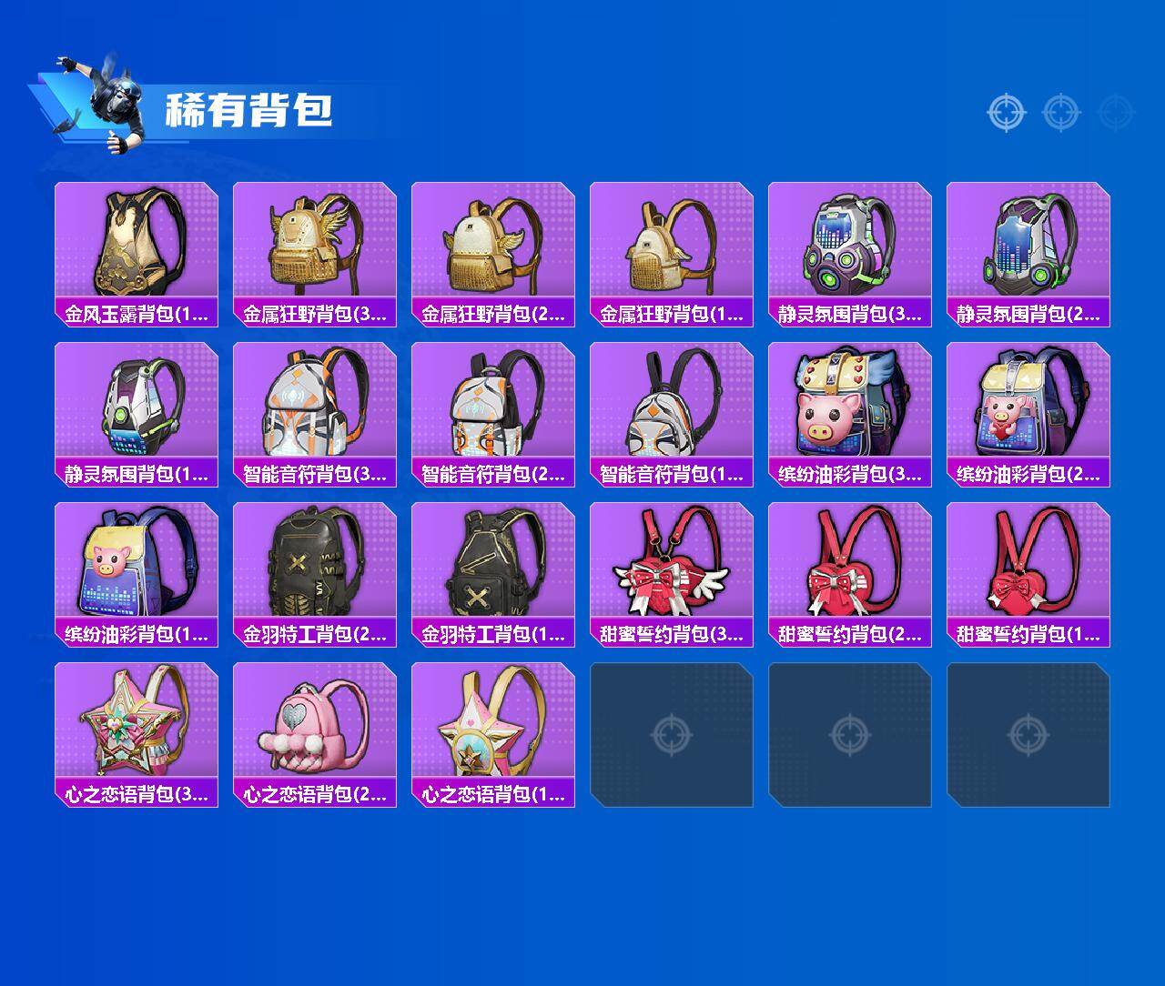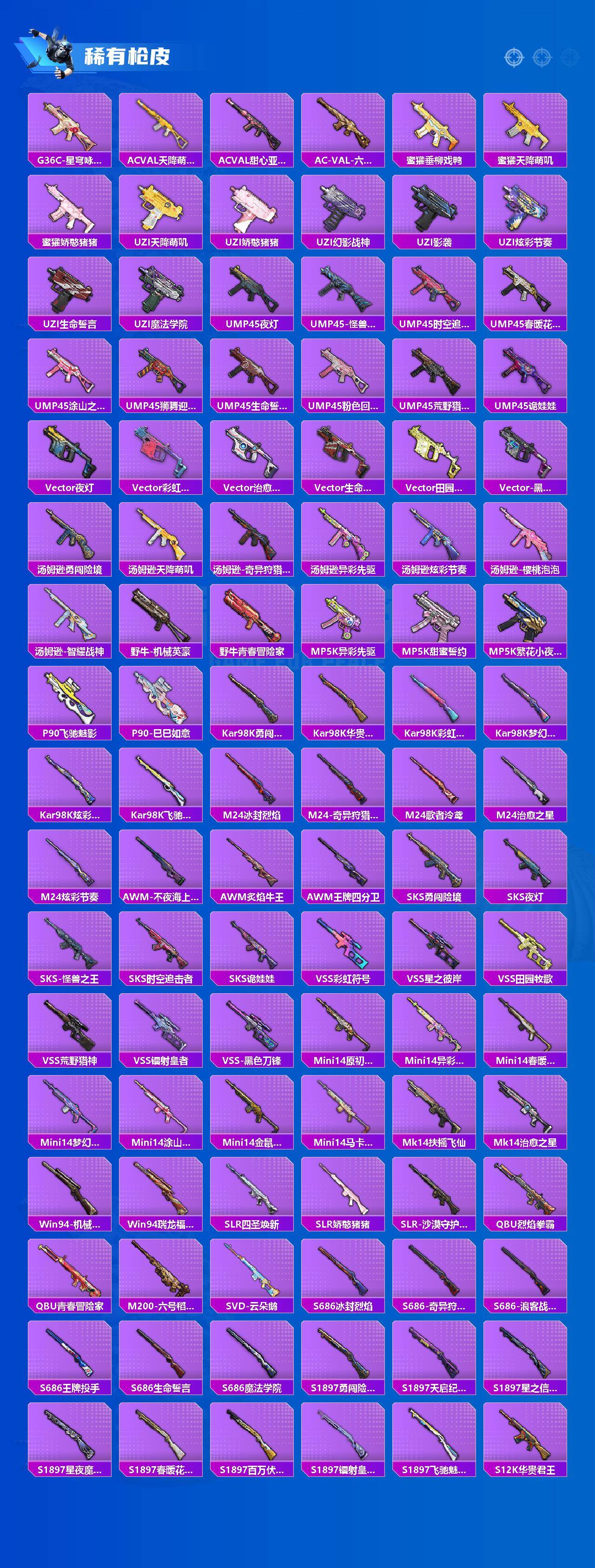 AKM-奇异狩猎者,AKM-百万伏特,AUG-魔法学院,M762-奇异狩猎者,M762-潮萌小黄鸭,M762-瑞龙福将,M24-奇异狩猎者,S686-奇异狩猎者,M249-古堡领主