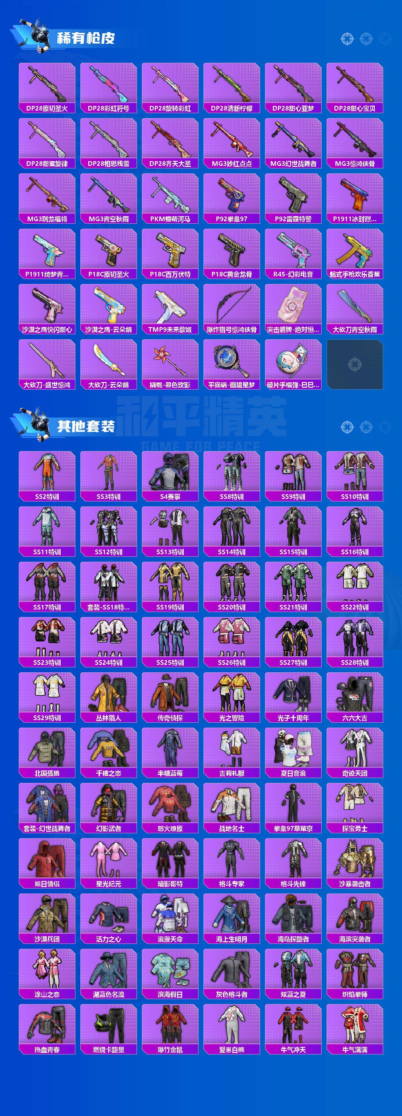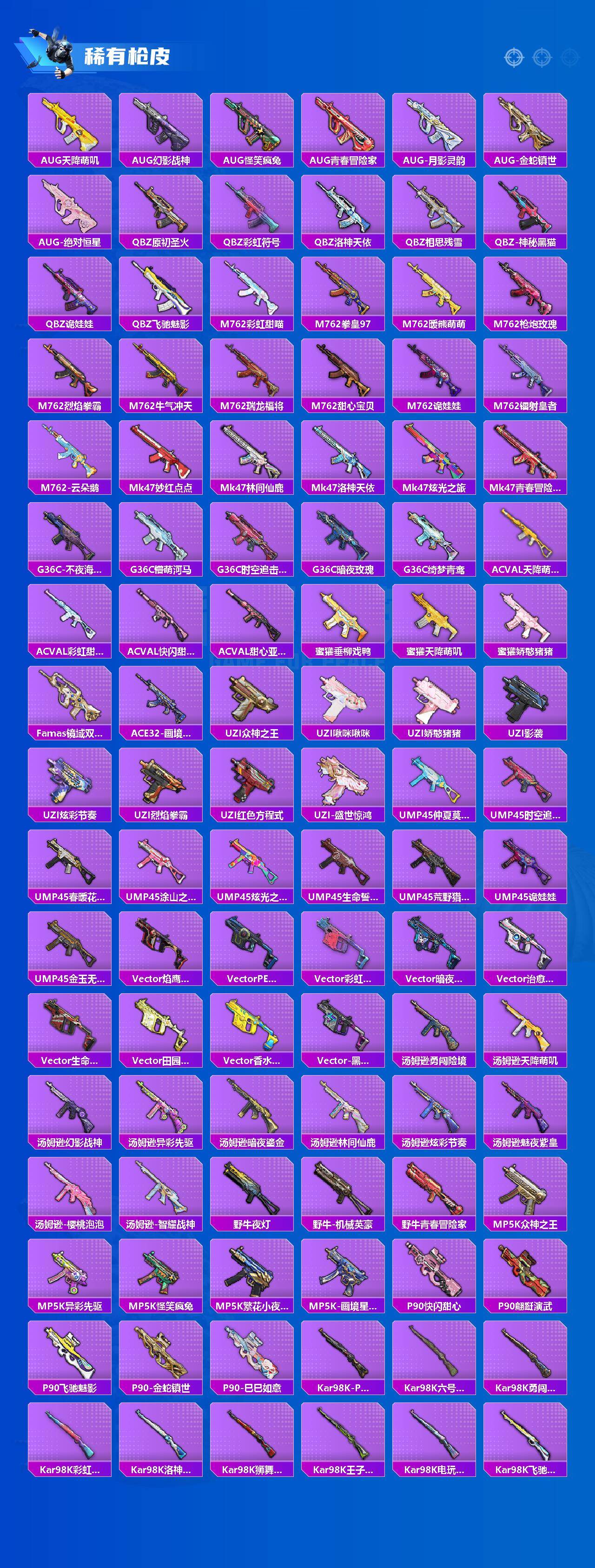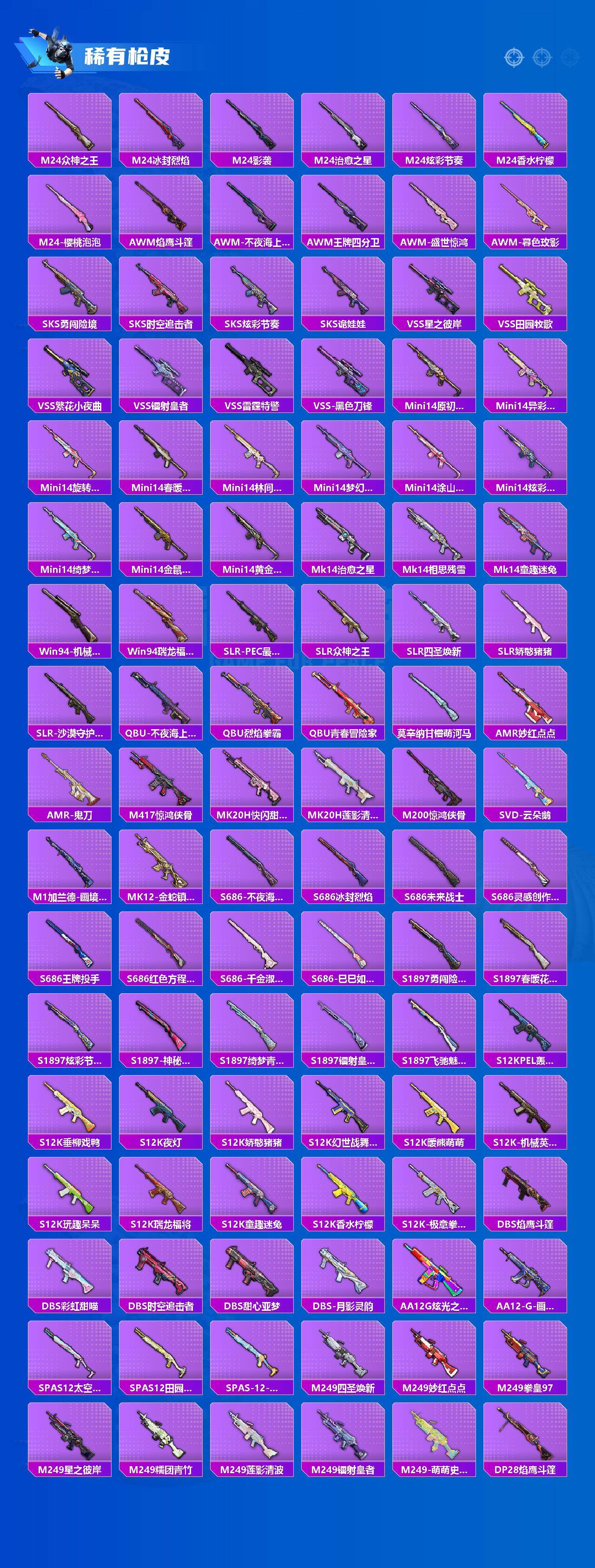 AKM-甜心宝贝,AKM-炫紫旋律,AKM-梦之光华,SCAR-L-童趣迷兔,SCAR-L-机甲封神,SCAR-L-金蛇镇世,M416-五爪金龙,M416-心之恋语,M416-风花雪月,GROZA-精灵之光,AUG-星之彼岸,AUG-暖羊咩咩,M762-激战未来,UMP45-相思残雪,Kar98K-巳巳如意,Kar98K-圣域龙灵,Mk14-盛世惊鸿,SLR-暗夜玫瑰,M249-彩虹甜喵,MG3-洛神天依,平底锅-林间仙鹿,平底锅-仲夏莫吉托
