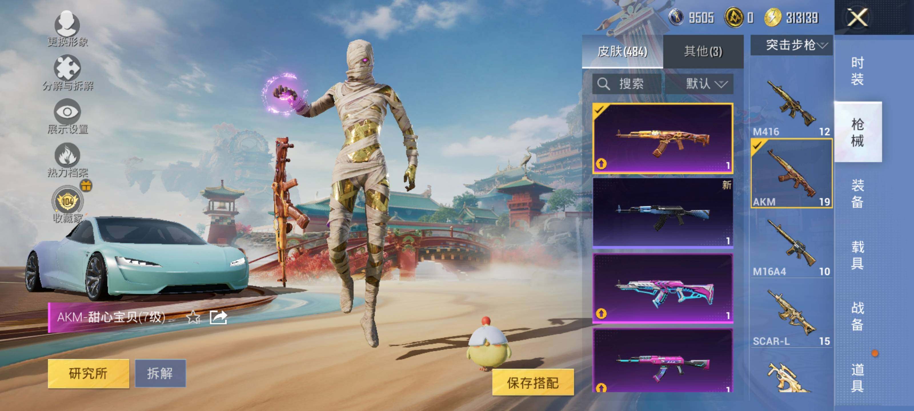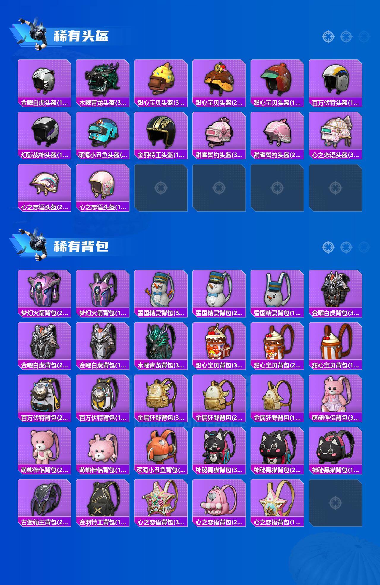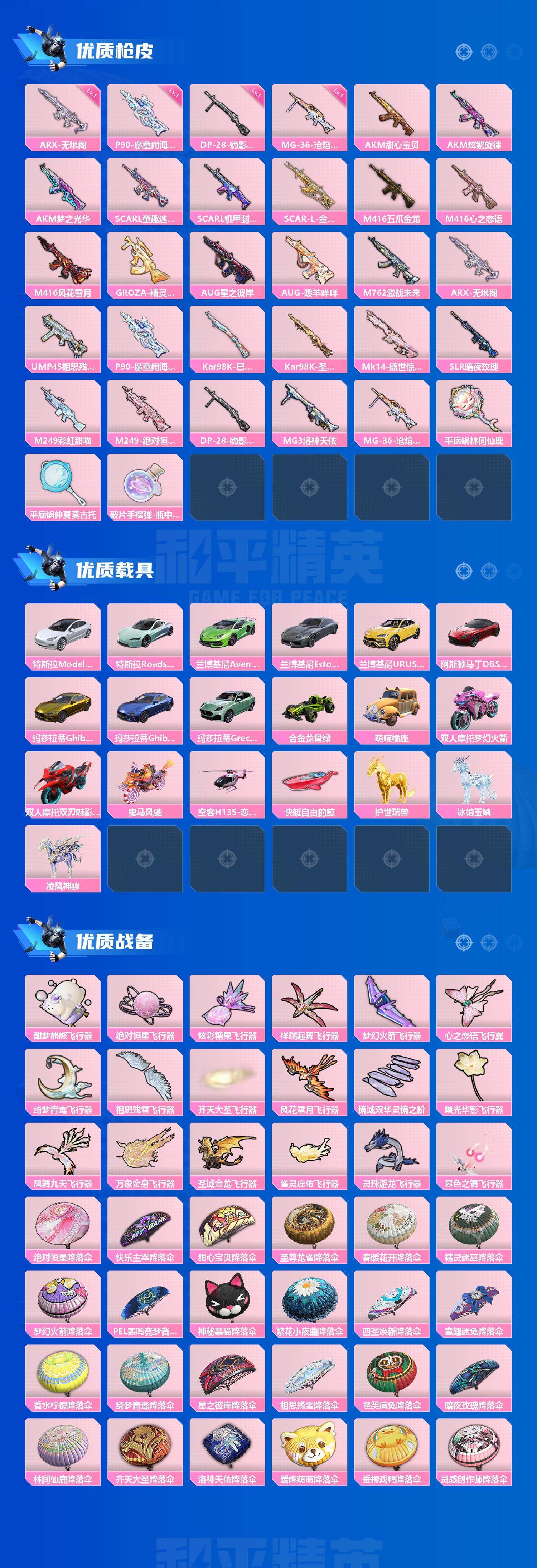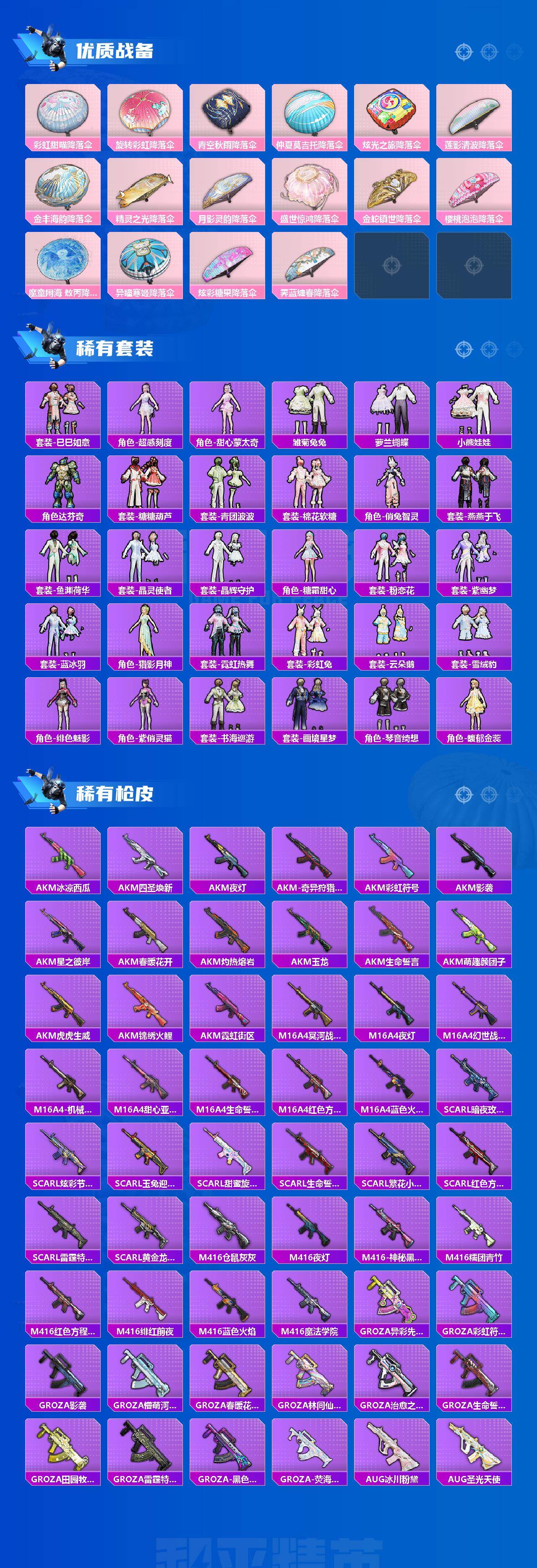 AKM-甜心宝贝,AKM-炫紫旋律,AKM-梦之光华,SCAR-L-童趣迷兔,SCAR-L-机甲封神,SCAR-L-金蛇镇世,M416-五爪金龙,M416-心之恋语,M416-风花雪月,GROZA-精灵之光,AUG-星之彼岸,AUG-暖羊咩咩,M762-激战未来,UMP45-相思残雪,Kar98K-巳巳如意,Kar98K-圣域龙灵,Mk14-盛世惊鸿,SLR-暗夜玫瑰,M249-彩虹甜喵,MG3-洛神天依,平底锅-林间仙鹿,平底锅-仲夏莫吉托