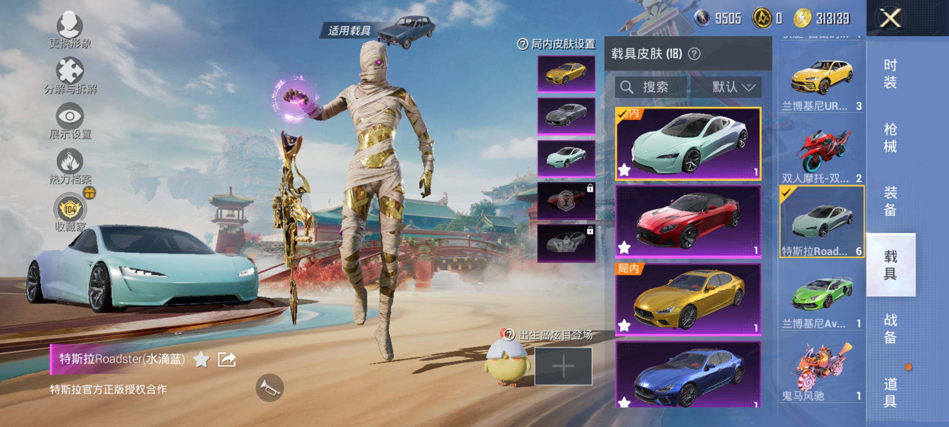 特斯拉Model_3(珍珠白),特斯拉Roadster(水滴蓝),兰博基尼Aventador_SVJ(翡翠绿),兰博基尼Estoque(银翼灰),兰博基尼URUS(明艳黄),阿斯顿·马丁DBS(红),玛莎拉蒂Ghibli(金),玛莎拉蒂Ghibli(蓝),玛莎拉蒂Grecale(薄荷绿),合金龙骨(绿),萌喵橘座,双人摩托-梦幻火箭,双人摩托-双刃魅影(红),鬼马风驰,空客H135-恋语之翼,快艇-自由的鲸,护世瑞兽