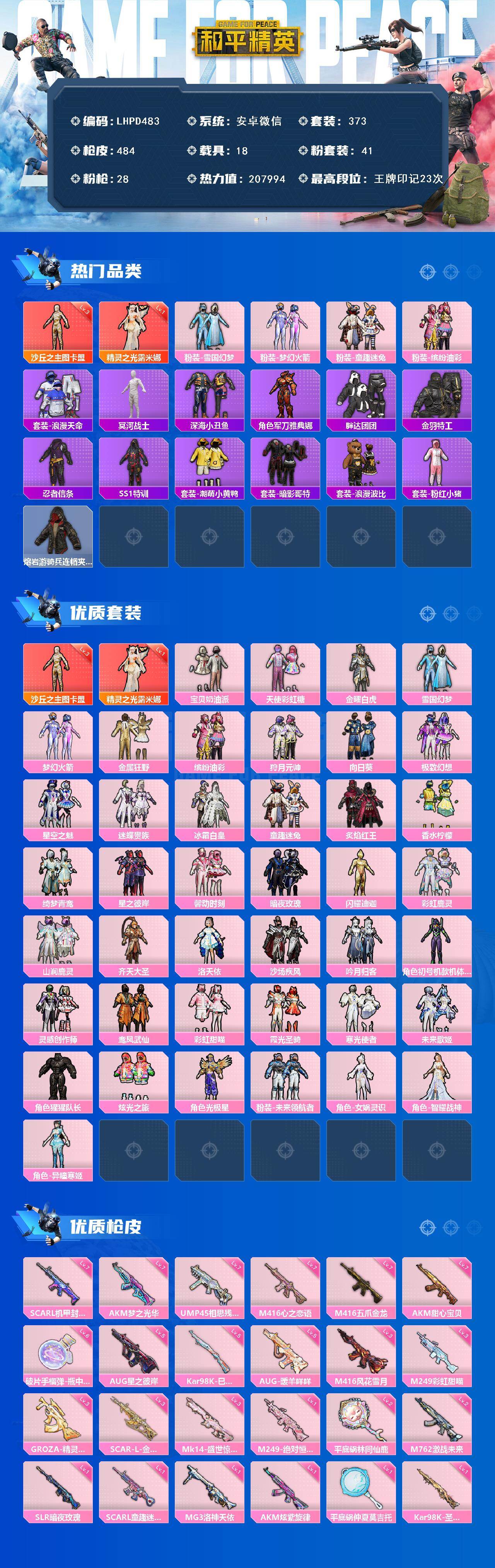 [17288341]【特价出售/店主推荐】安卓 微信-2神装-41粉装-28特效枪-18载具-18粉色飞行器-20w热力值-23王牌印记-373套装-484枪皮 【红色神装等级】:精灵之光-露米娜(一级),沙丘之主-图卡盟(三级) 【红色角色神装】:精灵之光-露米娜,沙丘之主-图卡盟 【热门品类】:粉装-雪国幻梦,粉装-梦幻火箭,粉装-童趣迷兔,粉装-缤纷油彩,套装-浪漫天命,套装-冥河战士,套装-深海小丑鱼,角色-军刀雅典娜,套装-胖达团团,套装-金羽特工,套装-忍者信条,套装-SS1特训,套装-潮萌小黄鸭,套装-暗影哥特,套装-浪漫波比,套装-粉红小猪,熔岩游骑兵连帽夹克 【粉色套装】:粉装-宝贝奶油派,粉装-天使彩虹糖,粉装-金曜白虎,粉装-雪国幻梦,粉装-梦幻火箭,粉装-金属狂野,粉装-缤纷油彩,粉装-狩月元帅,粉装-向日葵,粉装-极致幻想,粉装-星空之魅,粉装-迷蝶贵族,粉装-冰霜白皇,粉装-童趣迷兔,粉装-炙焰红王,粉装-香水柠檬,粉装-绮梦青鸾,粉装-星之彼岸,粉装-馨动时刻,粉装-暗夜玫瑰,角色-闪耀迪迦,粉装-彩虹鹿灵,粉装-山涧鹿灵,粉装-齐天大圣,角色-洛天依,粉装-沙场疾风,粉装-吟月归客,角色-初号机款机体服,粉装-灵感创作师,粉装-鸾凤武仙,粉装-彩虹甜喵,粉装-霞光圣骑,粉装-寒光使者,粉装-未来歌姬,角色-猩猩队长,粉装-炫光之旅,角色-光极星,粉装-未来领航者,角色-女娲灵识,角色-智耀战神,角色-异瞳寒姬 【粉色枪皮等级】:AKM-甜心宝贝(七级),AKM-炫紫旋律(一级),AKM-梦之光华(七级),SCAR-L-童趣迷兔(一级),SCAR-L-机甲封神(七级),SCAR-L-金蛇镇世(三级),M416-五爪金龙(七级),M416-心之恋语(七级),M416-风花雪月(三级),GROZA-精灵之光(三级),AUG-星之彼岸(五级),AUG-暖羊咩咩(五级),M762-激战未来(二级),ARX-无垠阁(一级),UMP45-相思残雪(七级),P90-魔童闹海 敖丙(一级),Kar98K-巳巳如意(五级),Kar98K-圣域龙灵(一级),Mk14-盛世惊鸿(三级),SLR-暗夜玫瑰(一级),M249-彩虹甜喵(三级),M249-绝对恒星(一级),DP-28-豹影疾电(一级),MG3-洛神天依(一级),MG-36-沧焰双生(一级),平底锅-林间仙鹿(二级)