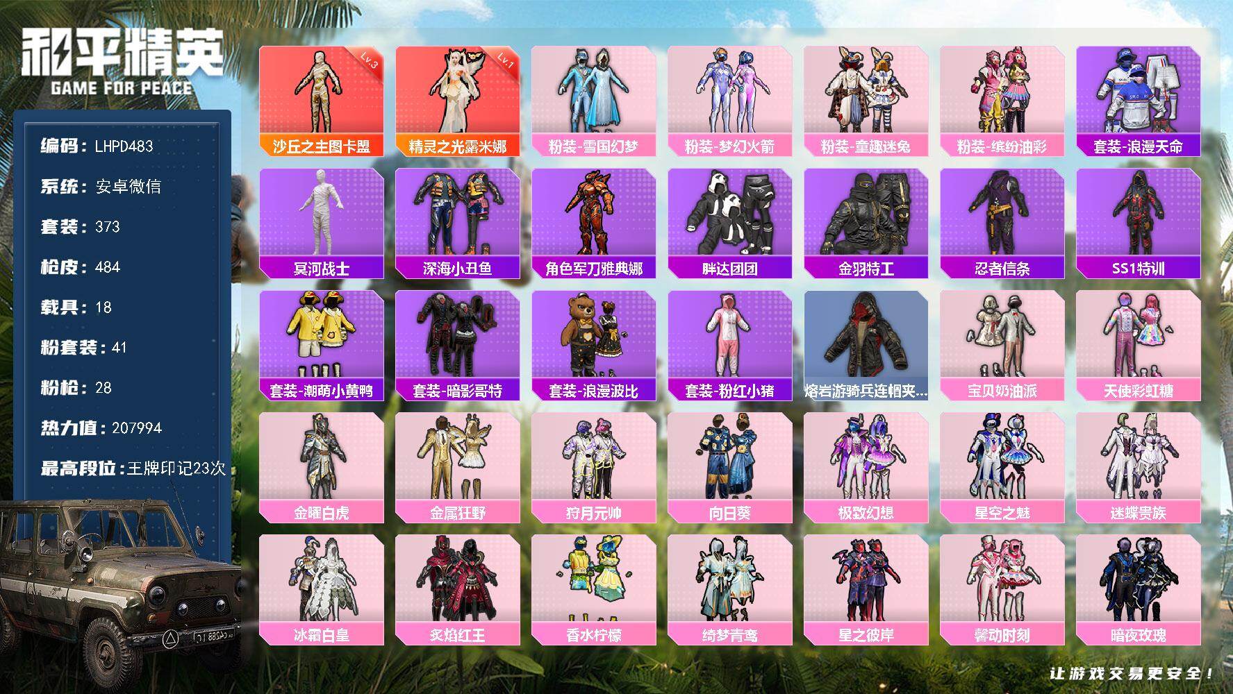 [17288341]【特价出售/店主推荐】安卓 微信-2神装-41粉装-28特效枪-18载具-18粉色飞行器-20w热力值-23王牌印记-373套装-484枪皮