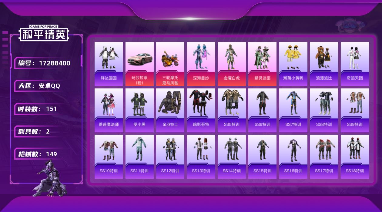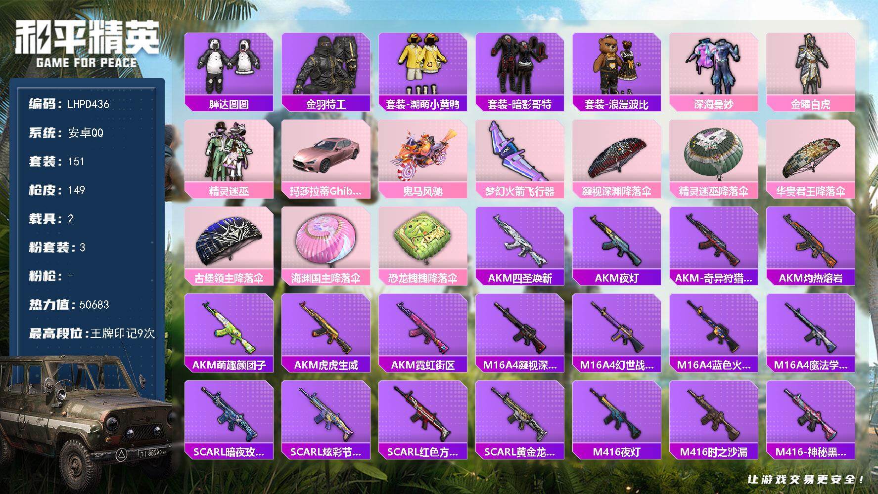 [17288400]【店主推荐捡漏号!可直接换绑】安卓 手Q-3粉装-0特效枪-2载具-1粉色飞行器-50683热力值-9王牌印记-151套装-149枪皮【热门品类】:套装-胖达圆圆,套装-金羽特工,套装-潮萌小黄鸭,套装-暗影哥特,套装-浪漫波比【粉色套装】:粉装-深海曼妙,粉装-金曜白虎,粉装-精灵迷巫【粉色载具】:玛莎拉蒂Ghibli(粉),鬼马风驰【粉色飞行器】:梦幻火箭飞行器