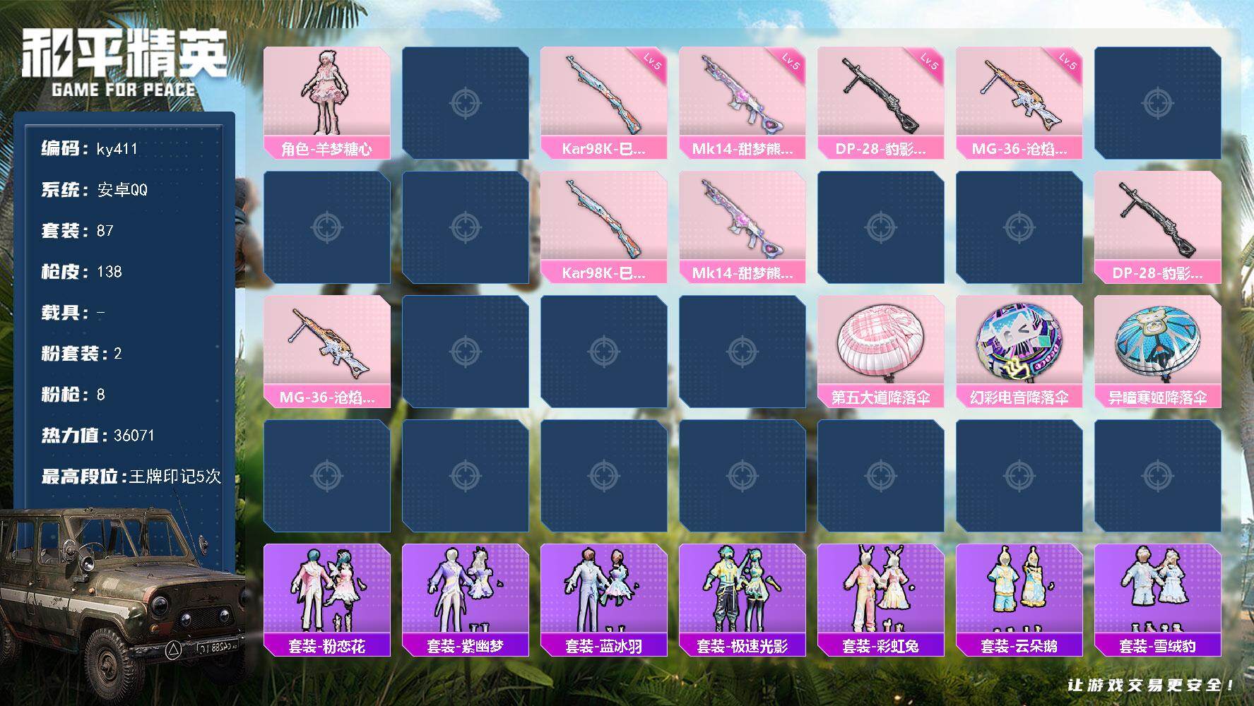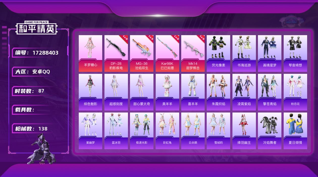 [17288403]安卓 手Q-2粉装-8特效枪-0载具-2粉色飞行器-36071热力值-5王牌印记-87套装-138枪皮 【粉色套装】:角色-羊梦糖心,角色-罪夜之冕 【粉色枪皮等级】:AKS-74U-森灵之息(五级),Kar98K-巳巳如意(五级),Mk14-甜梦熊击(五级),DP-28-豹影疾电(五级),MG-36-沧焰双生(五级) 【粉色枪皮】:UMP45-萌骑冒险,AKS-74U-森灵之息,Kar98K-巳巳如意,Mk14-甜梦熊击,Mk14-福马献瑞,AA12-G-萌骑幻想,DP-28-豹影疾电,MG-36-沧焰双生 【粉色飞行器】:绝对恒星飞行器,炫彩糖果飞行器 【粉色降落伞】:绝对恒星降落伞,第五大道降落伞,幻彩电音降落伞,异瞳寒姬降落伞,极意拳锋降落伞,炫彩糖果降落伞,辉云木星降落伞 【稀有套装】:角色-超感刻度,角色-甜心蒙太奇,套装-荧光像素,套装-雪国风尚,套装-炫彩糖果,套装-马上有钱,套装-粉恋花,套装-紫幽梦,套装-蓝冰羽,套装-极速光影,套装-彩虹兔,套装-云朵鹅,套装-雪绒豹,角色-绛羽幽主,套装-朱霞炽焰,套装-凌霄紫焰,套装-擎苍青焰,玩偶服-美羊羊,玩偶服-喜羊羊,角色-绯色魅影,套装-书海巡游,套装-画境星梦,套装-琴音绮想,套装-雨过天青,套装-红釉青花 【稀有枪皮】:AUG-冰晶雪宝,AKM-星之彼岸,AKM-破晓战魂,SCAR-L-夜灯,SCAR-L-炫彩节奏,M416-蓝色火焰,AUG-甜蜜菠萝,AUG-耀粉歌者,AUG-绝对恒星,M762-彩虹符号,M762-云朵鹅,M762-登顶巅峰,G36C-星穹咏叹调,蜜獾-天降萌叽,ACE32-画境星梦,ARX-凌霄紫焰,UZI-天降萌叽,UZI-幻影战神,UZI-影袭,UZI-红色方程式,UMP45-夜灯,UMP45-生命誓言,UMP45-圣穹绘梦,Vector-生命誓言,汤姆逊-炫彩节奏,MP5K-画境星梦,AKS-74U-荧光像素,JS9-凌霄紫焰,M24-炫彩节奏,SKS-迅猛狂鲨,Mini14-耀粉歌者,SVD-云朵鹅,M1加兰德-画境星梦,S686-彩虹符号,S12K-夜灯,AA12-G-画境星梦,SPAS-12-云朵鹅,M249-彩虹符号,M249-星之彼岸,M249-糯团青竹,M249-绯穹魔姬,DP-28-彩虹符号,PKM-荧光像素,MG-36-凌霄紫焰,P92-凌霄紫焰,