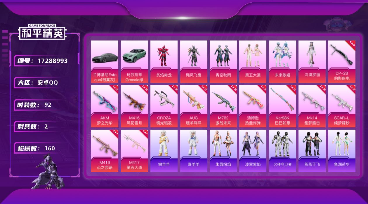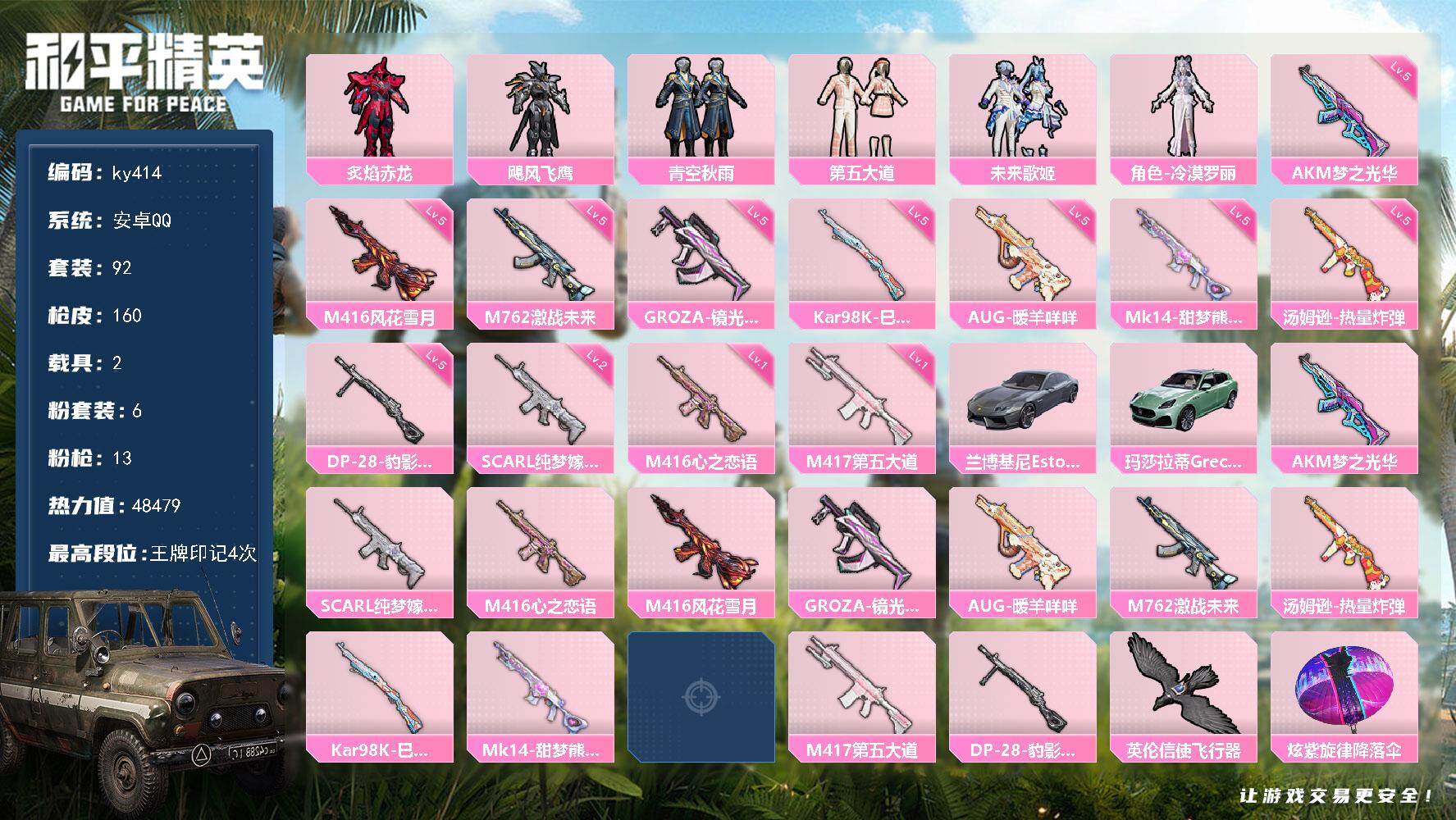 [17288993]安卓 手Q-6粉装-13特效枪-2载具-1粉色飞行器-48479热力值-4王牌印记-92套装-160枪皮 【粉色套装】:粉装-炙焰赤龙,粉装-飓风飞鹰,粉装-青空秋雨,粉装-第五大道,粉装-未来歌姬,角色-冷漠罗丽 【粉色枪皮等级】:AKM-梦之光华(五级),SCAR-L-纯梦嫁纱(二级),M416-心之恋语(一级),M416-风花雪月(五级),GROZA-镜光银凌(五级),AUG-暖羊咩咩(五级),M762-激战未来(五级),汤姆逊-热量炸弹(五级),Kar98K-巳巳如意(五级),Mk14-甜梦熊击(五级),M417-第五大道(一级),DP-28-豹影疾电(五级) 【粉色载具】:兰博基尼Estoque(银翼灰),玛莎拉蒂Grecale(薄荷绿) 【粉色枪皮】:AKM-梦之光华,SCAR-L-纯梦嫁纱,M416-心之恋语,M416-风花雪月,GROZA-镜光银凌,AUG-暖羊咩咩,M762-激战未来,汤姆逊-热量炸弹,Kar98K-巳巳如意,Mk14-甜梦熊击,Mk14-福马献瑞,M417-第五大道,DP-28-豹影疾电 【粉色飞行器】:英伦信使飞行器 【粉色降落伞】:炫紫旋律降落伞,风花雪月降落伞,焦糖拿铁降落伞,旋转彩虹降落伞,暗夜鎏金降落伞,音爆索尼克降落伞,第五大道降落伞,雪梅暗香降落伞,纯梦嫁纱降落伞,精灵梦叶罗丽降落伞,金丰海韵降落伞 【稀有套装】:套装-马上有钱,套装-火种守卫者,套装-燕燕于飞,套装-鱼渊荷华,套装-霓虹热舞,套装-彩虹兔,套装-云朵鹅,套装-雪绒豹,套装-朱霞炽焰,套装-凌霄紫焰,玩偶服-懒羊羊,玩偶服-喜羊羊,角色-霜刃之御,角色-孙斩天 【稀有枪皮】:AKM-彩虹符号,AKM-破晓战魂,AKM-龙的传人,M16A4-幻世战舞者,SCAR-L-夜灯,SCAR-L-玉兔迎春,M416-暗夜行者,M416-糯团青竹,M416-红色方程式,GROZA-懵萌河马,GROZA-田园牧歌,AUG-天降萌叽,AUG-纯梦嫁纱,AUG-耀粉歌者,QBZ-彩虹符号,QBZ-未来歌姬,M762-天星战神,M762-天降萌叽,M762-第五大道,M762-风花雪月,M762-云朵鹅,Mk47-妙红点点,G36C-懵萌河马,AC-VAL-天降萌叽,蜜獾-天降萌叽,ARX-凌霄紫焰,UZI-天降萌叽,UZI-影袭,UMP45-夜灯,Vector-彩虹符