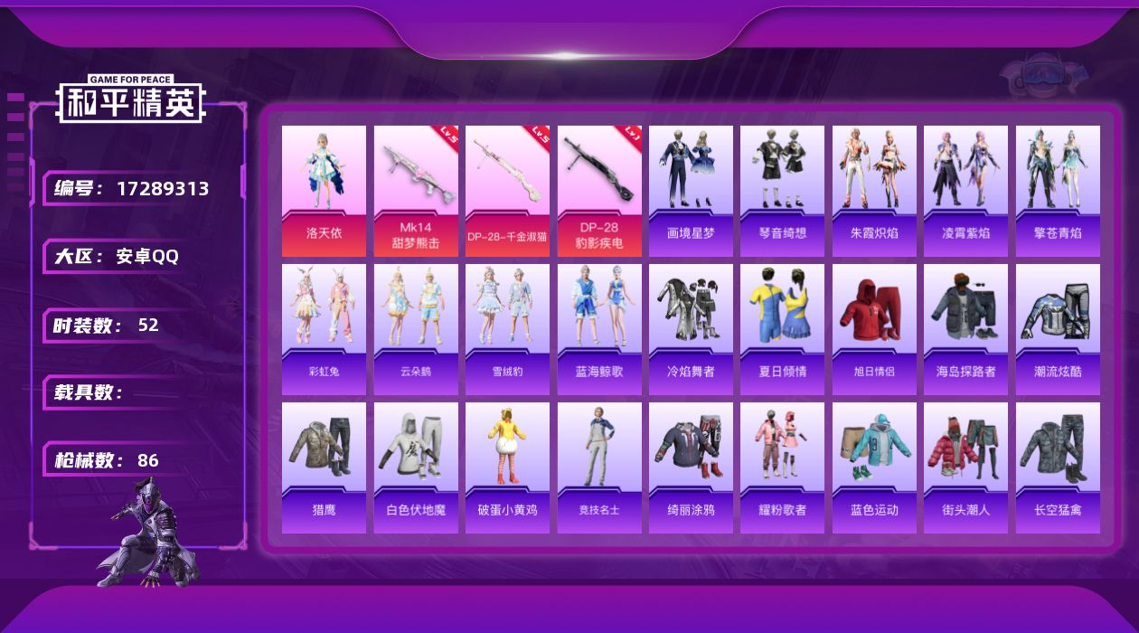 [17289313]安卓 手Q-1粉装-6特效枪-0载具-1粉色飞行器-21797热力值-1王牌印记-52套装-86枪皮 【粉色套装】:角色-洛天依 【粉色枪皮等级】:AKS-74U-森灵之息(五级),Mk14-甜梦熊击(五级),DP-28-千金淑猫(五级),DP-28-豹影疾电(一级) 【粉色枪皮】:UMP45-萌骑冒险,AKS-74U-森灵之息,Mk14-甜梦熊击,Mk14-福马献瑞,DP-28-千金淑猫,DP-28-豹影疾电 【粉色飞行器】:炫彩糖果飞行器 【粉色降落伞】:幻彩电音降落伞,冷漠罗丽降落伞,炫彩糖果降落伞,霁蓝缠春降落伞 【稀有套装】:套装-雪国风尚,套装-炫彩糖果,套装-彩虹兔,套装-云朵鹅,套装-雪绒豹,套装-蓝海鲸歌,套装-朱霞炽焰,套装-凌霄紫焰,套装-擎苍青焰,套装-画境星梦,套装-琴音绮想,角色-馥郁金蕊 【稀有枪皮】:SCAR-L-夜灯,SCAR-L-啾咪啾咪,M416-红色方程式,AUG-耀粉歌者,M762-云朵鹅,蜜獾-绯穹魔姬,ACE32-画境星梦,ARX-凌霄紫焰,UZI-啾咪啾咪,UMP45-夜灯,Vector-生命誓言,汤姆逊-炫彩节奏,MP5K-画境星梦,JS9-凌霄紫焰,Kar98K-洛神天依,VSS-彩虹符号,SVD-云朵鹅,M1加兰德-画境星梦,S1897-炫彩节奏,S12K-夜灯,AA12-G-画境星梦,SPAS-12-云朵鹅,M249-糯团青竹,MG3-幻世战舞者,MG-36-凌霄紫焰,P92-凌霄紫焰,沙漠之鹰-云朵鹅,大砍刀-云朵鹅,平底锅-凌霄紫焰,平底锅-画境星梦 【其他套装】:套装-冷焰舞者,套装-夏日倾情,套装-旭日情侣,套装-海岛探路者,套装-潮流炫酷,套装-猎鹰,套装-白色伏地魔,套装-破蛋小黄鸡,套装-竞技名士,套装-绮丽涂鸦,套装-耀粉歌者,套装-蓝色运动,套装-街头潮人,套装-长空猛禽,套装-魅力单车,套装-黑色伏地魔,套装-星梦畅游 【营地ID】:995125722