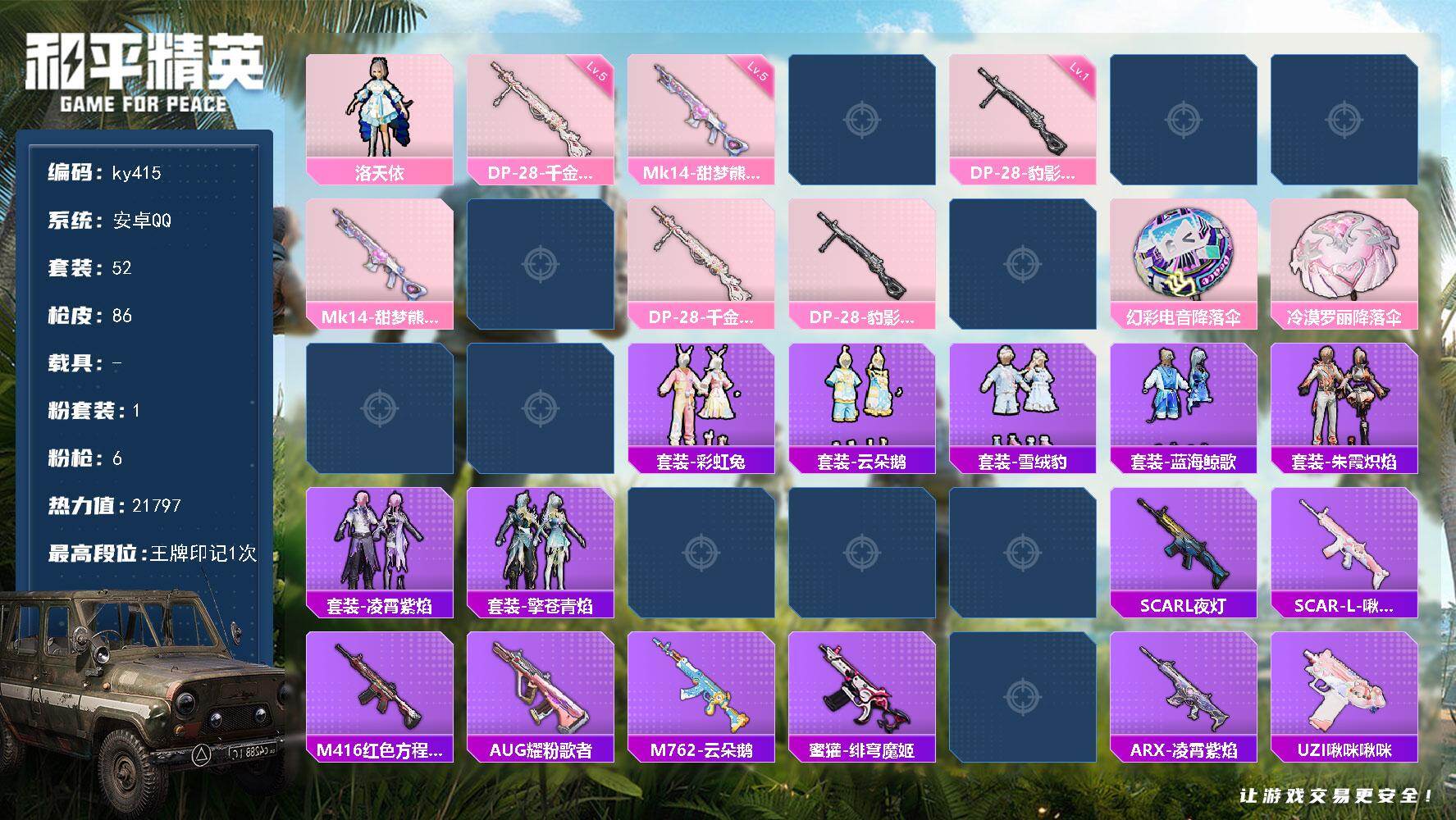 [17289313]安卓 手Q-1粉装-6特效枪-0载具-1粉色飞行器-21797热力值-1王牌印记-52套装-86枪皮