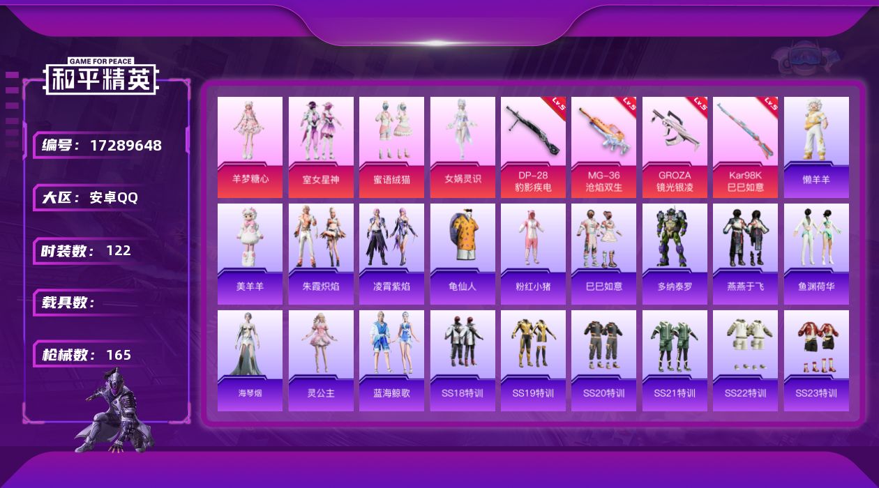 [17289648]安卓 手Q-4粉装-6特效枪-0载具-1粉色飞行器-43211热力值-3王牌印记-122套装-165枪皮