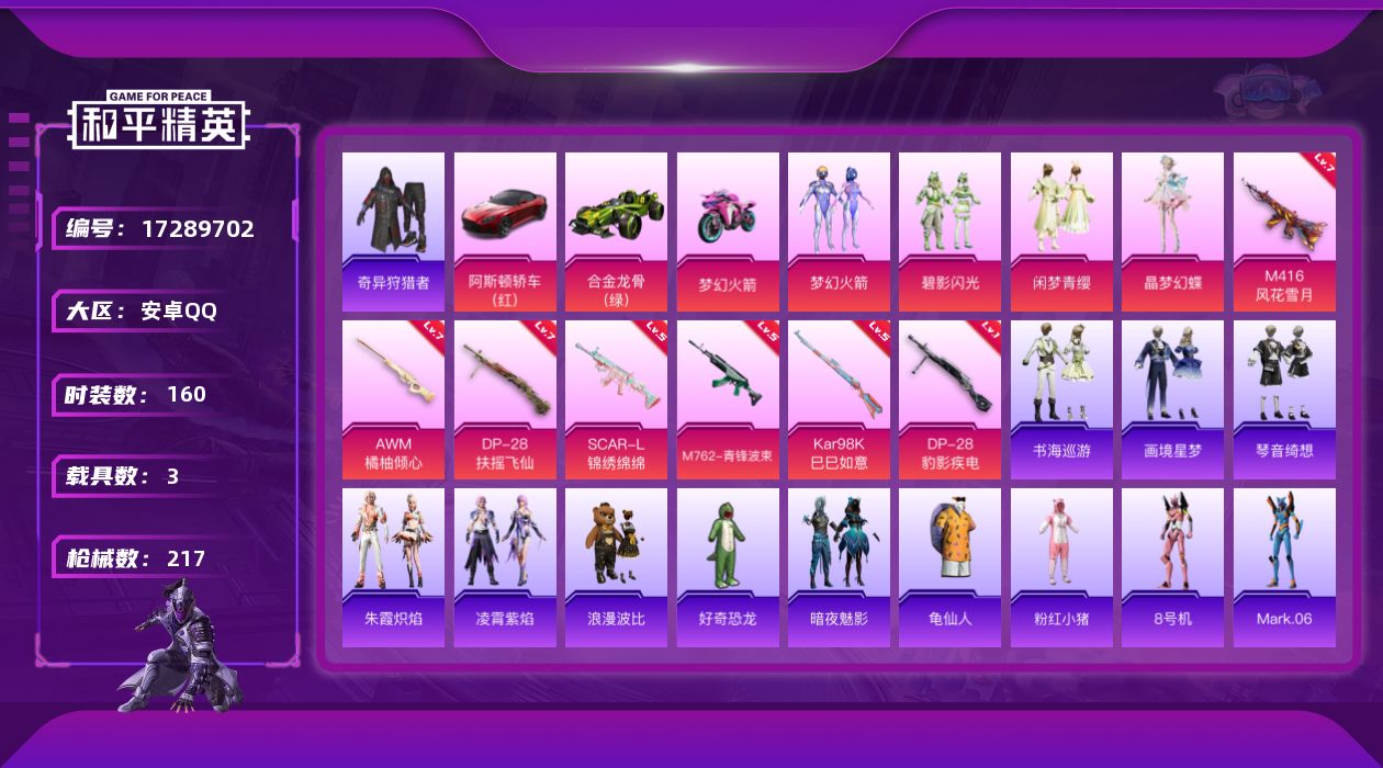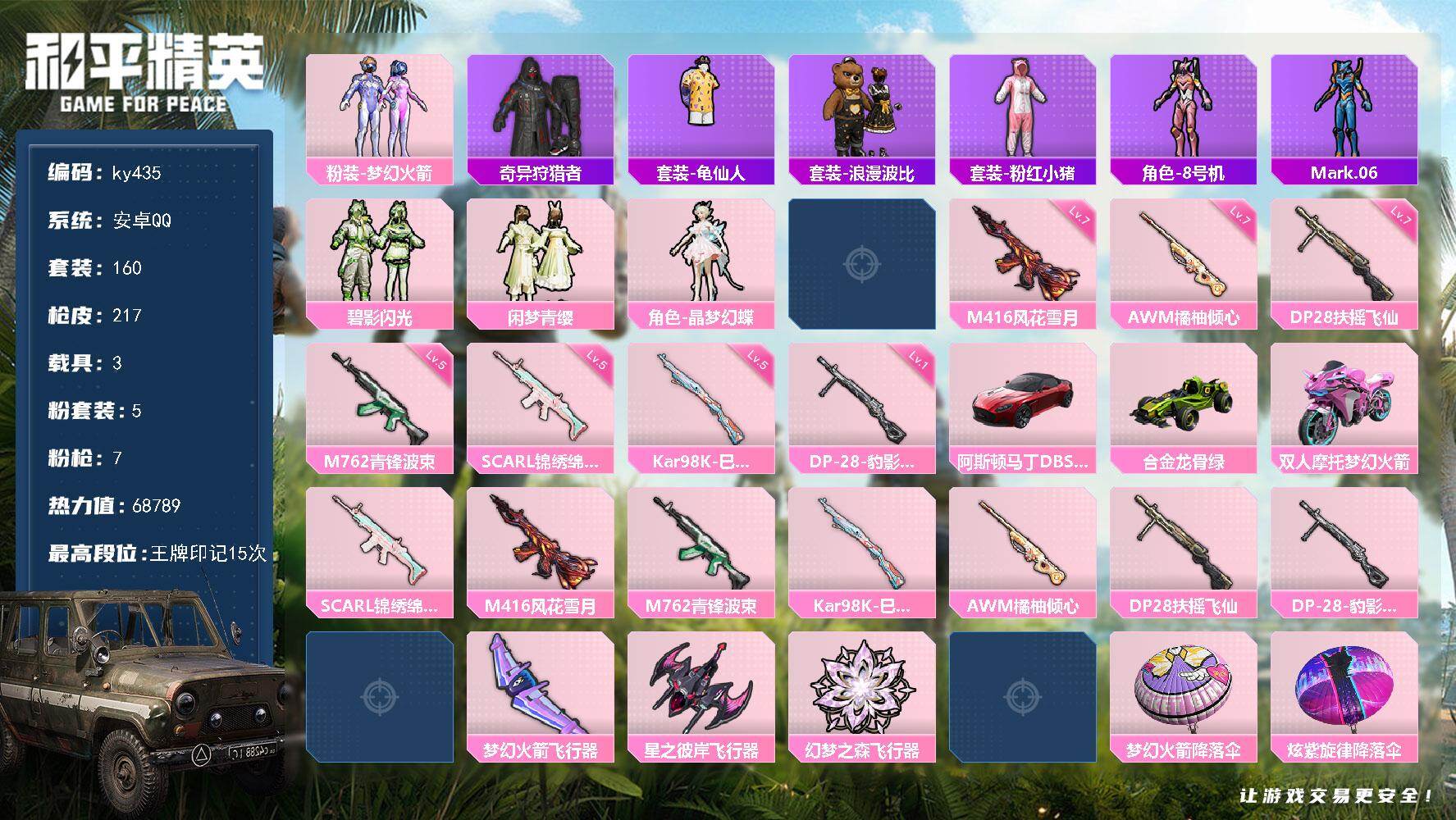 [17289702]安卓 手Q-5粉装-7特效枪-3载具-5粉色飞行器-68789热力值-15王牌印记-160套装-217枪皮