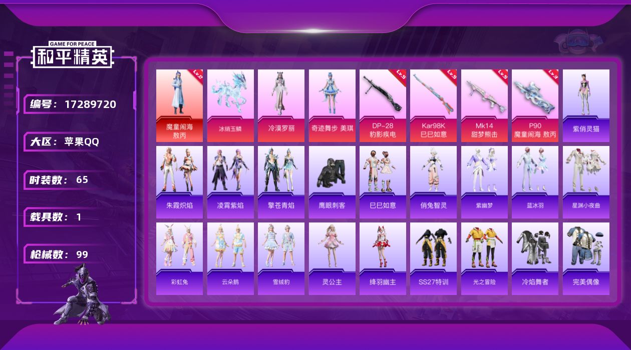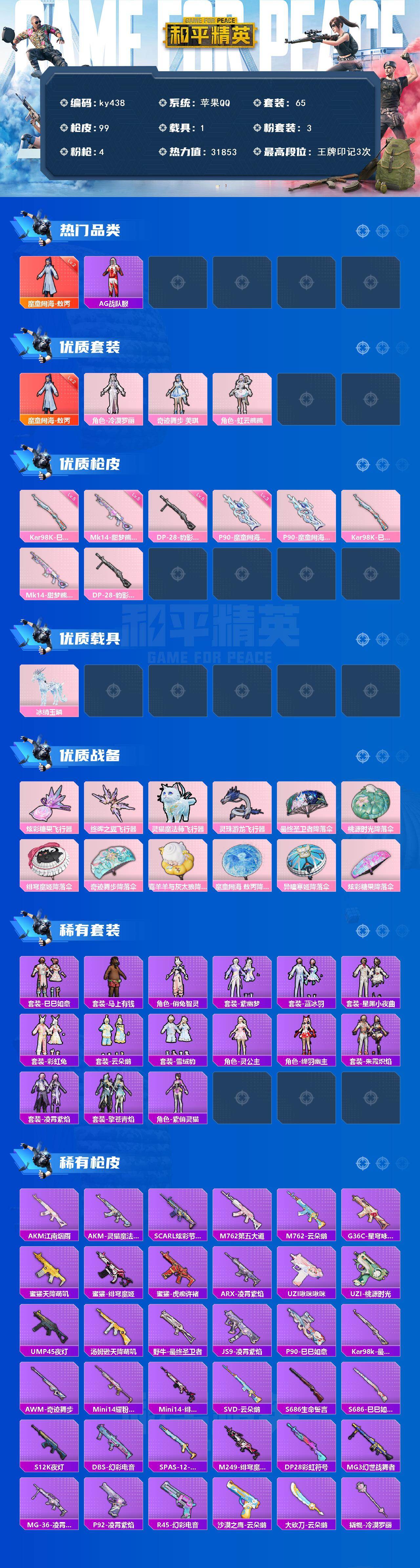 [17289720]苹果 手Q-1神装-3粉装-4特效枪-1载具-4粉色飞行器-31853热力值-3王牌印记-65套装-99枪皮 【红色神装等级】:魔童闹海-敖丙(二级) 【红色角色神装】:魔童闹海-敖丙 【热门品类】:套装-AG战队服 【粉色套装】:角色-冷漠罗丽,角色-奇迹舞步 美琪,角色-虹云熊熊 【粉色枪皮等级】:P90-魔童闹海 敖丙(三级),Kar98K-巳巳如意(五级),Mk14-甜梦熊击(五级),DP-28-豹影疾电(五级) 【粉色载具】:冰绡玉鳞 【粉色枪皮】:P90-魔童闹海 敖丙,Kar98K-巳巳如意,Mk14-甜梦熊击,DP-28-豹影疾电 【粉色飞行器】:炫彩糖果飞行器,终晖之翼飞行器,灵猫魔法师飞行器,灵珠游龙飞行器 【粉色降落伞】:最终圣卫者降落伞,桃源时光降落伞,绯穹魔姬降落伞,奇迹舞步降落伞,喜羊羊与灰太狼降落伞,魔童闹海 敖丙降落伞,异瞳寒姬降落伞,炫彩糖果降落伞 【稀有套装】:套装-巳巳如意,套装-马上有钱,角色-俏兔智灵,套装-紫幽梦,套装-蓝冰羽,套装-星渊小夜曲,套装-彩虹兔,套装-云朵鹅,套装-雪绒豹,角色-灵公主,角色-绛羽幽主,套装-朱霞炽焰,套装-凌霄紫焰,套装-擎苍青焰,角色-紫俏灵猫 【稀有枪皮】:AUG-冰晶雪宝,AKM-江南烟雨,AKM-灵猫魔法师,SCAR-L-炫彩节奏,M762-第五大道,M762-云朵鹅,G36C-星穹咏叹调,蜜獾-天降萌叽,蜜獾-虎痴许褚,蜜獾-绯穹魔姬,ARX-凌霄紫焰,UZI-啾咪啾咪,UZI-桃源时光,UMP45-夜灯,汤姆逊-天降萌叽,野牛-最终圣卫者,JS9-凌霄紫焰,P90-巳巳如意,Kar98k-最终圣卫者,AWM-奇迹舞步,Mini14-耀粉歌者,Mini14-绯穹魔姬,SVD-云朵鹅,S686-生命誓言,S686-巳巳如意,S12K-夜灯,DBS-幻彩电音,SPAS-12-云朵鹅,M249-绯穹魔姬,DP-28-彩虹符号,MG3-幻世战舞者,MG-36-凌霄紫焰,P92-凌霄紫焰,R45-幻彩电音,沙漠之鹰-云朵鹅,大砍刀-云朵鹅,撬棍-灵猫魔法师,撬棍-冷漠罗丽,平底锅-宁雨蝶,平底锅-凌霄紫焰,破片手榴弹-巳巳如意 【其他套装】:套装-SS27特训,套装-光之冒险,套装-冷焰舞者,套装-完美偶像,套装-极速红龙,套装-柠萌假日,套装-滨海厨神,套装-牛气满满,套装-疯狂小兔子,