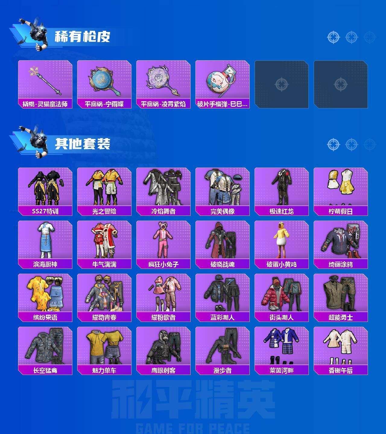 【稀有枪皮】:AUG-冰晶雪宝,AKM-江南烟雨,AKM-灵猫魔法师,SCAR-L-炫彩节奏,M762-第五大道,M762-云朵鹅,G36C-星穹咏叹调,蜜獾-天降萌叽,蜜獾-虎痴许褚,蜜獾-绯穹魔姬,ARX-凌霄紫焰,UZI-啾咪啾咪,UZI-桃源时光,UMP45-夜灯,汤姆逊-天降萌叽,野牛-最终圣卫者,JS9-凌霄紫焰,P90-巳巳如意,Kar98k-最终圣卫者,AWM-奇迹舞步,Mini14-耀粉歌者,Mini14-绯穹魔姬,SVD-云朵鹅,S686-生命誓言,S686-巳巳如意,S12K-夜灯,DBS-幻彩电音,SPAS-12-云朵鹅,M249-绯穹魔姬,DP-28-彩虹符号,MG3-幻世战舞者,MG-36-凌霄紫焰,P92-凌霄紫焰,R45-幻彩电音,沙漠之鹰-云朵鹅,大砍刀-云朵鹅,撬棍-灵猫魔法师,撬棍-冷漠罗丽,平底锅-宁雨蝶,平底锅-凌霄紫焰,破片手榴弹-巳巳如意
