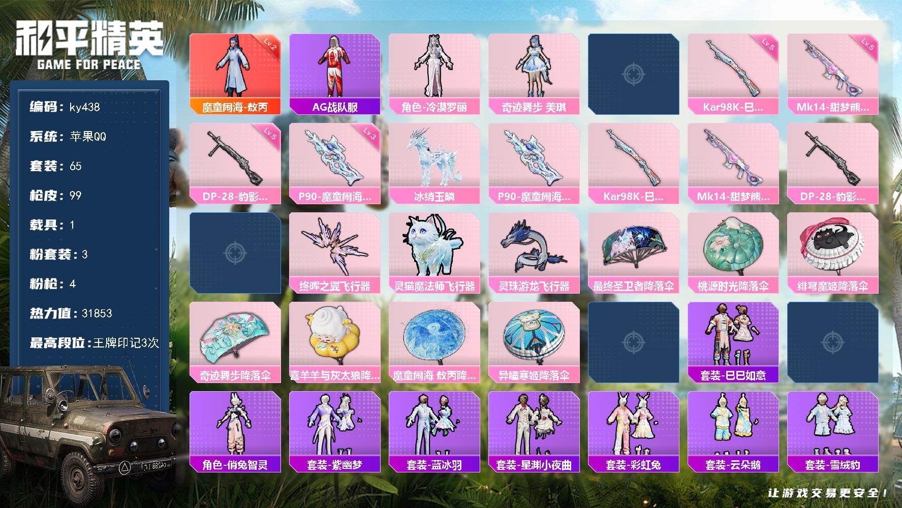 [17289720]苹果 手Q-1神装-3粉装-4特效枪-1载具-4粉色飞行器-31853热力值-3王牌印记-65套装-99枪皮