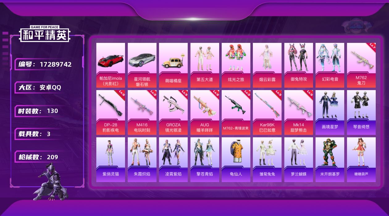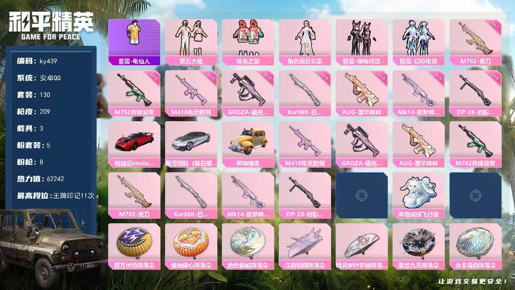 [17289742]安卓 手Q-5粉装-8特效枪-3载具-2粉色飞行器-62242热力值-11王牌印记-130套装-209枪皮