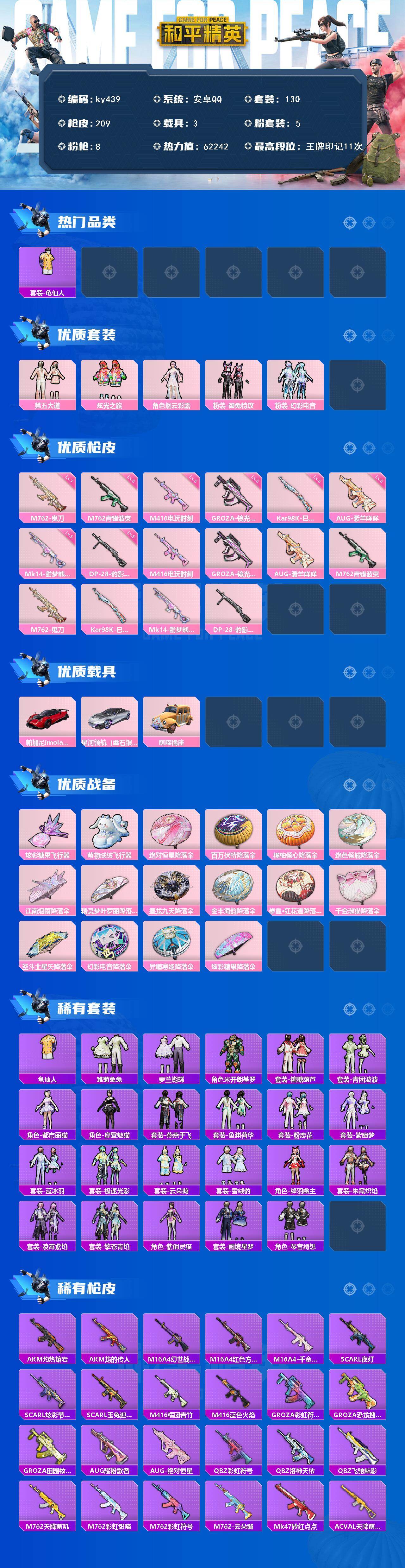 [17289742]安卓 手Q-5粉装-8特效枪-3载具-2粉色飞行器-62242热力值-11王牌印记-130套装-209枪皮 【热门品类】:套装-龟仙人 【粉色套装】:粉装-第五大道,粉装-炫光之旅,角色-烟云彩露,粉装-御兔特攻,粉装-幻彩电音 【粉色枪皮等级】:M416-电玩时刻(五级),GROZA-镜光银凌(五级),AUG-暖羊咩咩(五级),M762-青锋波束(五级),M762-鬼刀(七级),Kar98K-巳巳如意(五级),Mk14-甜梦熊击(五级),DP-28-豹影疾电(五级) 【粉色载具】:帕加尼imola(光影红),星河领航(磐石银),萌喵橘座 【粉色枪皮】:M416-电玩时刻,GROZA-镜光银凌,AUG-暖羊咩咩,M762-青锋波束,M762-鬼刀,Kar98K-巳巳如意,Mk14-甜梦熊击,DP-28-豹影疾电 【粉色飞行器】:炫彩糖果飞行器,萌物绒绒飞行器 【粉色降落伞】:绝对恒星降落伞,百万伏特降落伞,橘柚倾心降落伞,绝色倾城降落伞,江南烟雨降落伞,精灵梦叶罗丽降落伞,墨龙九天降落伞,金丰海韵降落伞,拳皇·狂花道降落伞,千金淑猫降落伞,圣斗士星矢降落伞,幻彩电音降落伞,异瞳寒姬降落伞,炫彩糖果降落伞 【稀有套装】:套装-龟仙人,套装-雪国风尚,套装-炫彩糖果,套装-雏菊兔兔,套装-萝兰蝴蝶,角色-米开朗基罗,套装-糖糖葫芦,套装-青团波波,角色-都市丽猫,角色-摩登魅猫,套装-燕燕于飞,套装-鱼渊荷华,套装-粉恋花,套装-紫幽梦,套装-蓝冰羽,套装-极速光影,套装-云朵鹅,套装-雪绒豹,角色-绛羽幽主,套装-朱霞炽焰,套装-凌霄紫焰,套装-擎苍青焰,角色-紫俏灵猫,套装-画境星梦,套装-琴音绮想 【稀有枪皮】:AKM-灼热熔岩,AKM-龙的传人,M16A4-幻世战舞者,M16A4-红色方程式,M16A4-千金淑猫,SCAR-L-夜灯,SCAR-L-炫彩节奏,SCAR-L-玉兔迎春,M416-糯团青竹,M416-蓝色火焰,GROZA-彩虹符号,GROZA-恐龙拽拽,GROZA-田园牧歌,AUG-耀粉歌者,AUG-绝对恒星,QBZ-彩虹符号,QBZ-洛神天依,QBZ-飞驰魅影,M762-天降萌叽,M762-彩虹甜喵,M762-彩虹符号,M762-云朵鹅,Mk47-妙红点点,AC-VAL-天降萌叽,蜜獾-天降萌叽,蜜獾-娇憨猪猪,蜜獾-虎痴许褚,ACE32-画境星梦