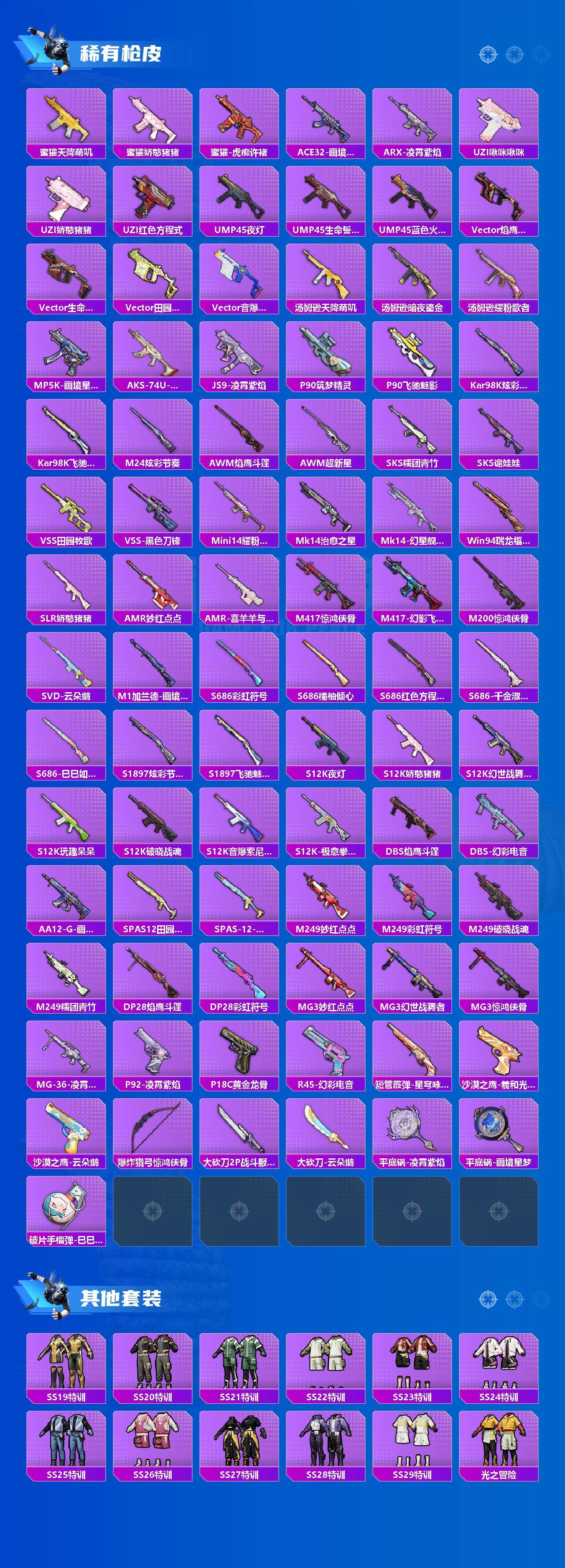 【稀有枪皮】:AKM-灼热熔岩,AKM-龙的传人,M16A4-幻世战舞者,M16A4-红色方程式,M16A4-千金淑猫,SCAR-L-夜灯,SCAR-L-炫彩节奏,SCAR-L-玉兔迎春,M416-糯团青竹,M416-蓝色火焰,GROZA-彩虹符号,GROZA-恐龙拽拽,GROZA-田园牧歌,AUG-耀粉歌者,AUG-绝对恒星,QBZ-彩虹符号,QBZ-洛神天依,QBZ-飞驰魅影,M762-天降萌叽,M762-彩虹甜喵,M762-彩虹符号,M762-云朵鹅,Mk47-妙红点点,AC-VAL-天降萌叽,蜜獾-天降萌叽,蜜獾-娇憨猪猪,蜜獾-虎痴许褚,ACE32-画境星梦