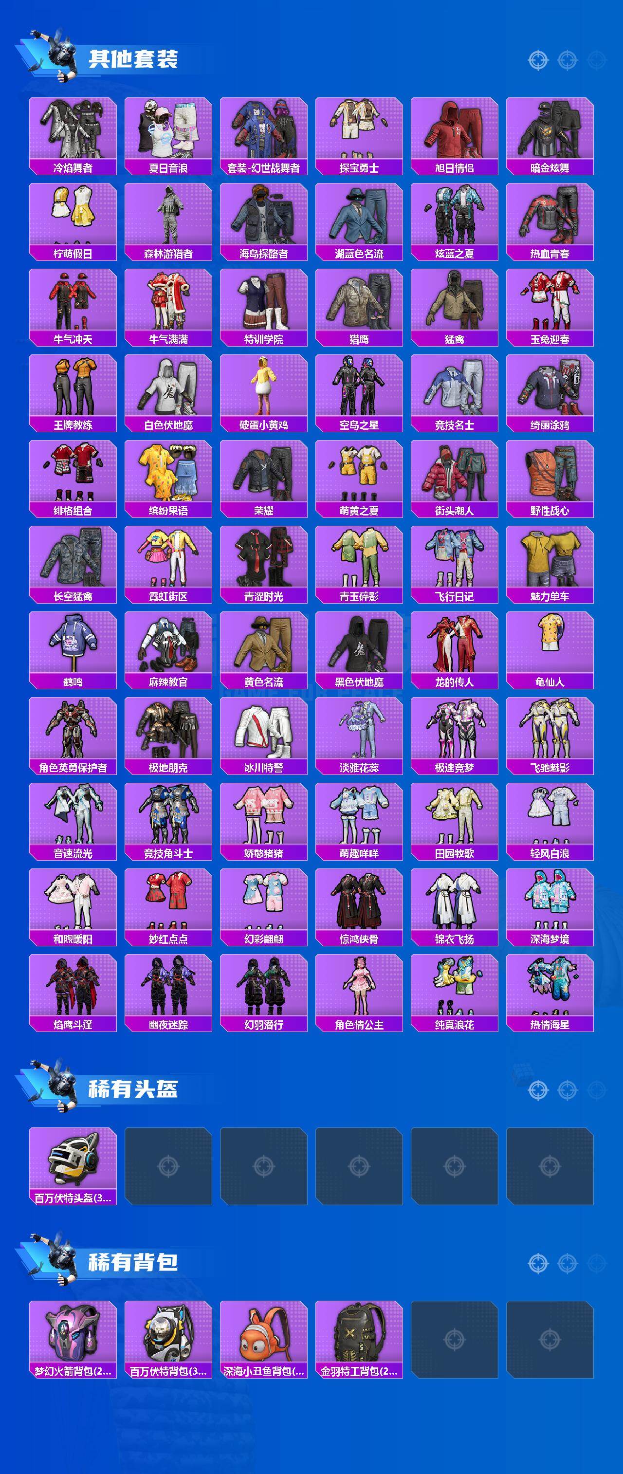 【稀有套装】:套装-龟仙人,套装-雪国风尚,套装-炫彩糖果,套装-雏菊兔兔,套装-萝兰蝴蝶,角色-米开朗基罗,套装-糖糖葫芦,套装-青团波波,角色-都市丽猫,角色-摩登魅猫,套装-燕燕于飞,套装-鱼渊荷华,套装-粉恋花,套装-紫幽梦,套装-蓝冰羽,套装-极速光影,套装-云朵鹅,套装-雪绒豹,角色-绛羽幽主,套装-朱霞炽焰,套装-凌霄紫焰,套装-擎苍青焰,角色-紫俏灵猫,套装-画境星梦,套装-琴音绮想