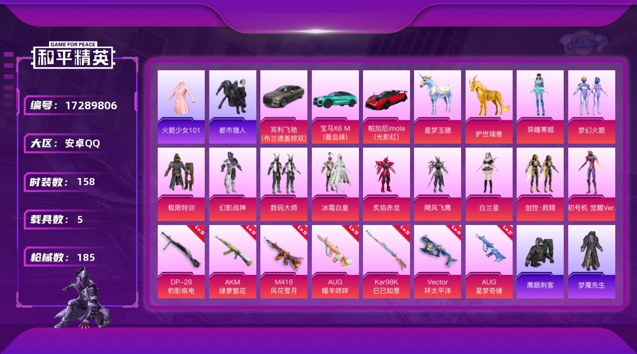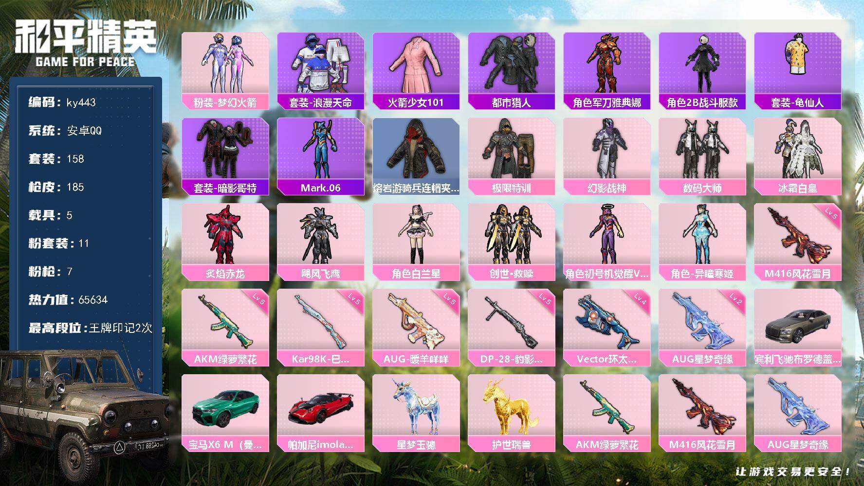 [17289806]安卓 手Q-11粉装-7特效枪-5载具-6粉色飞行器-65634热力值-2王牌印记-158套装-185枪皮