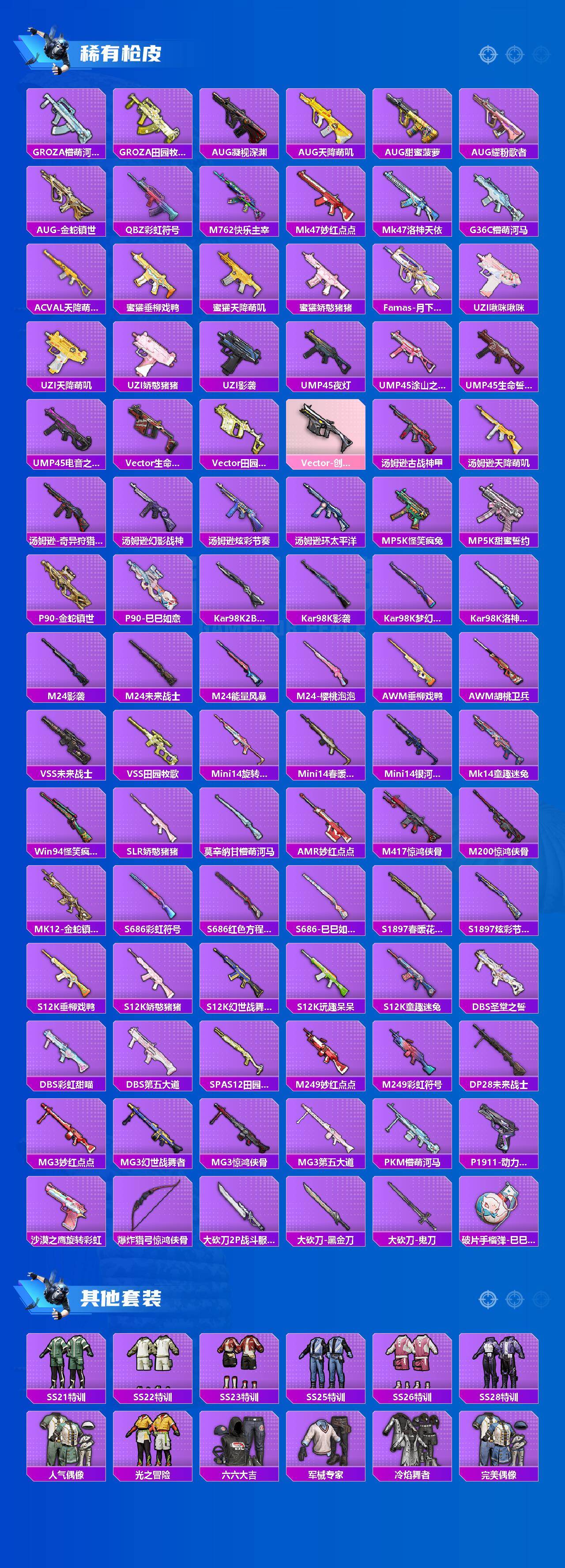 AKM-绿萝繁花,M416-风花雪月,AUG-星梦奇缘,AUG-暖羊咩咩,Vector-环太平洋,Kar98K-巳巳如意