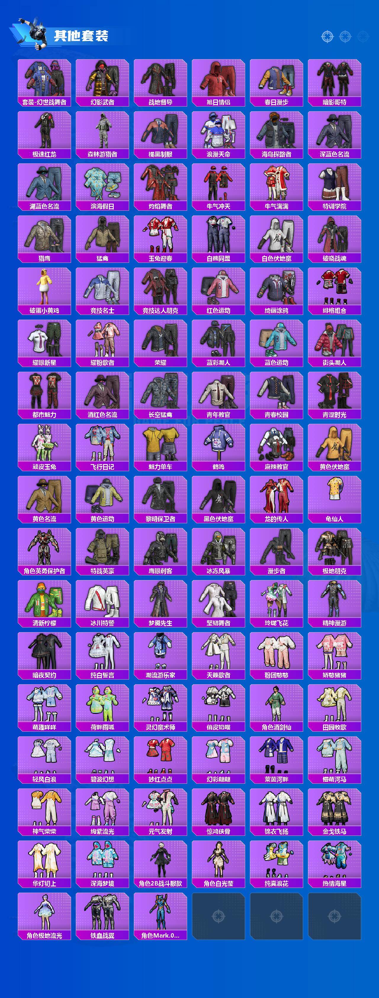 套装-浪漫天命,角色-军刀雅典娜,套装-龟仙人,套装-暗影哥特,角色-Mark.06,套装-极速红龙,套装-破蛋小黄鸡,角色-英勇保护者,套装-漫步者,套装-暗夜契约,套装-纯白誓言