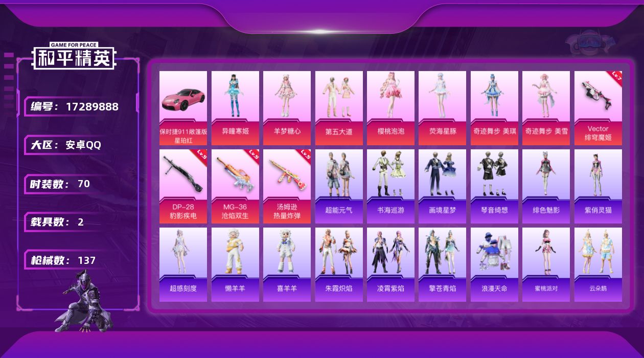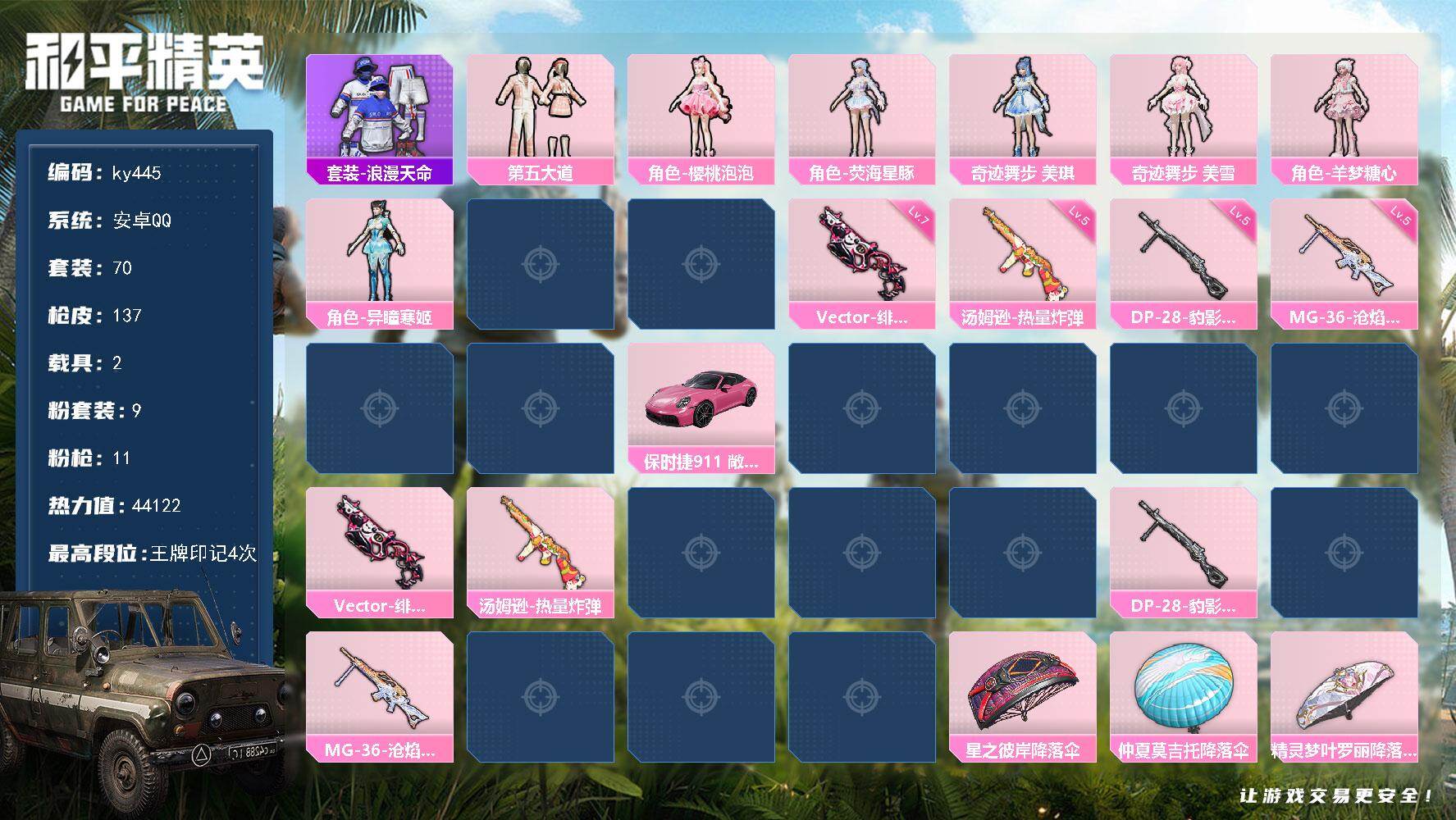 [17289888]安卓 手Q-9粉装-11特效枪-2载具-3粉色飞行器-44122热力值-4王牌印记-70套装-137枪皮