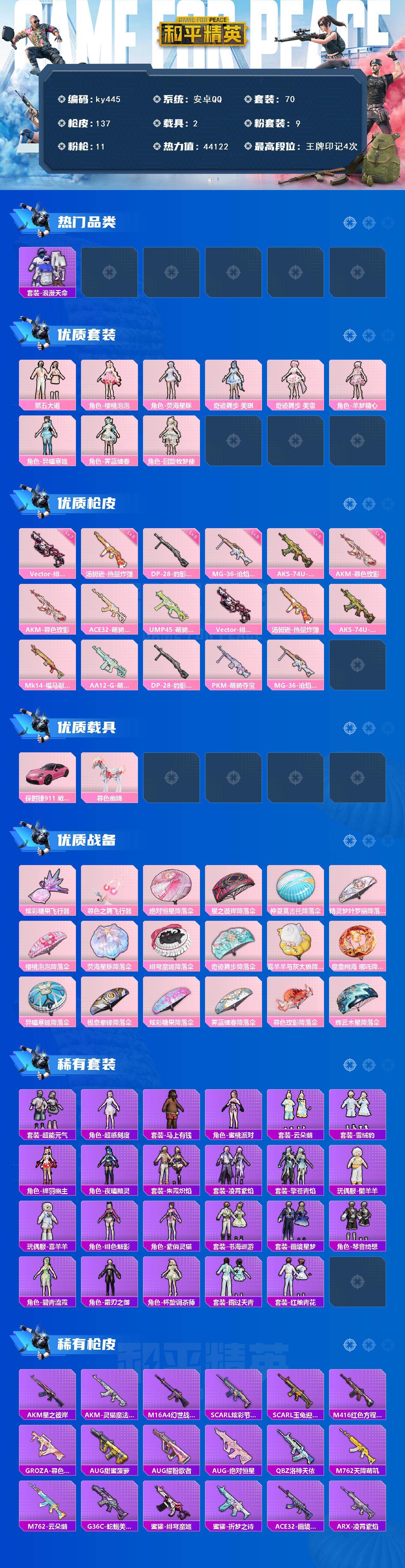 [17289888]安卓 手Q-9粉装-11特效枪-2载具-3粉色飞行器-44122热力值-4王牌印记-70套装-137枪皮 【热门品类】:套装-浪漫天命 【粉色套装】:粉装-第五大道,角色-樱桃泡泡,角色-荧海星豚,角色-奇迹舞步 美琪,角色-奇迹舞步 美雪,角色-羊梦糖心,角色-异瞳寒姬,角色-霁蓝缠春,角色-回旋牧梦使 【粉色枪皮等级】:AKM-暮色玫影(三级),Vector-绯穹魔姬(七级),汤姆逊-热量炸弹(五级),AKS-74U-森灵之息(五级),DP-28-豹影疾电(五级),MG-36-沧焰双生(五级) 【粉色载具】:保时捷911 敞篷版(星珀红),暮色幽蹄 【粉色枪皮】:AKM-暮色玫影,ACE32-萌骑漫游,UMP45-萌骑冒险,Vector-绯穹魔姬,汤姆逊-热量炸弹,AKS-74U-森灵之息,Mk14-福马献瑞,AA12-G-萌骑幻想,DP-28-豹影疾电,PKM-萌骑夺宝,MG-36-沧焰双生 【粉色飞行器】:炫彩糖果飞行器,暮色之舞飞行器 【粉色降落伞】:绝对恒星降落伞,星之彼岸降落伞,仲夏莫吉托降落伞,精灵梦叶罗丽降落伞,樱桃泡泡降落伞,荧海星豚降落伞,绯穹魔姬降落伞,奇迹舞步降落伞,喜羊羊与灰太狼降落伞,魔童闹海 哪吒降落伞,异瞳寒姬降落伞,极意拳锋降落伞,炫彩糖果降落伞,霁蓝缠春降落伞,暮色玫影降落伞,辉云木星降落伞 【稀有套装】:套装-超能元气,角色-超感刻度,套装-雪国风尚,套装-炫彩糖果,套装-马上有钱,角色-蜜桃派对,套装-云朵鹅,套装-雪绒豹,角色-绛羽幽主,角色-夜瞳黯灵,套装-朱霞炽焰,套装-凌霄紫焰,套装-擎苍青焰,玩偶服-懒羊羊,玩偶服-喜羊羊,角色-绯色魅影,角色-紫俏灵猫,套装-书海巡游,套装-画境星梦,套装-琴音绮想,角色-碧青流霞,角色-霜刃之御,角色-杯旋调茶师,套装-雨过天青,套装-红釉青花 【稀有枪皮】:M79短管榴弹-钛晶裂爪,AUG-冰晶雪宝,AKM-星之彼岸,AKM-灵猫魔法师,M16A4-幻世战舞者,SCAR-L-炫彩节奏,SCAR-L-玉兔迎春,M416-红色方程式,GROZA-暮色玫影,AUG-甜蜜菠萝,AUG-耀粉歌者,AUG-绝对恒星,QBZ-洛神天依,M762-天降萌叽,M762-云朵鹅,G36C-蛇蝎美人,蜜獾-绯穹魔姬,蜜獾-折梦之诗,ACE32-画境星梦,ARX-凌霄紫焰,UZI-啾咪啾咪,UZI