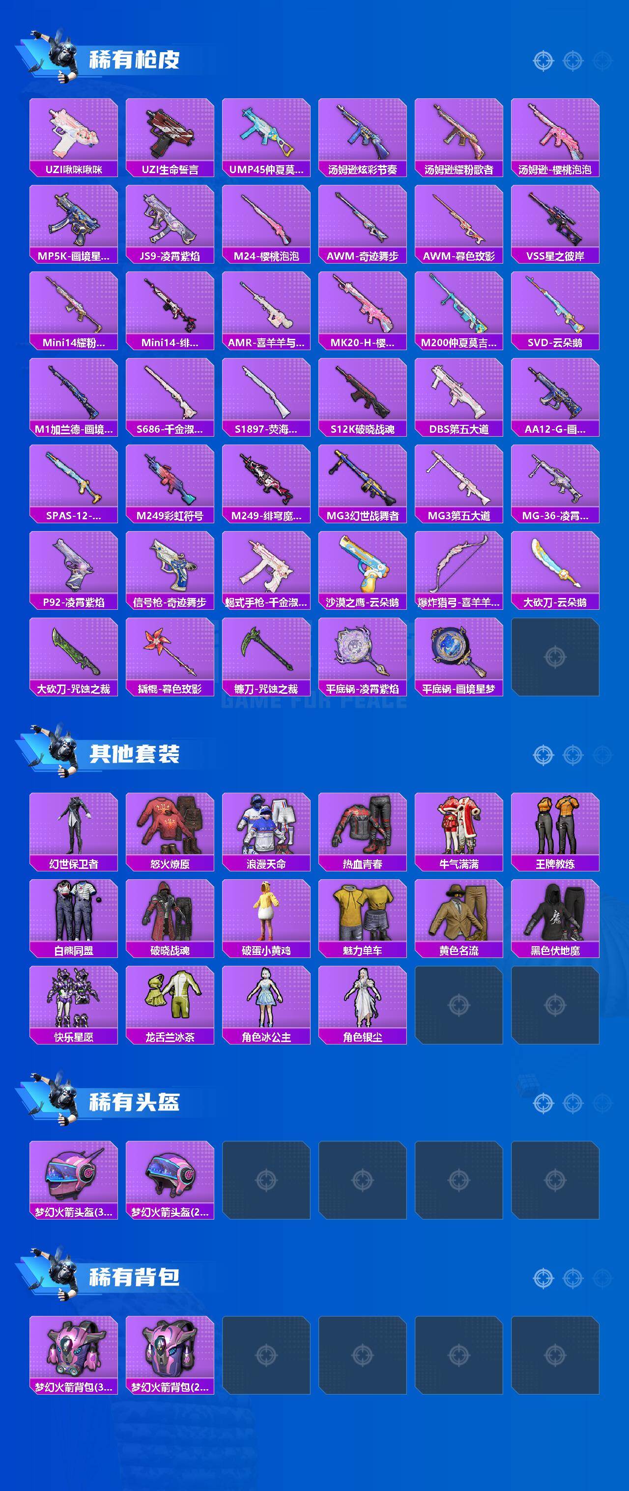 【稀有枪皮】:M79短管榴弹-钛晶裂爪,AUG-冰晶雪宝,AKM-星之彼岸,AKM-灵猫魔法师,M16A4-幻世战舞者,SCAR-L-炫彩节奏,SCAR-L-玉兔迎春,M416-红色方程式,GROZA-暮色玫影,AUG-甜蜜菠萝,AUG-耀粉歌者,AUG-绝对恒星,QBZ-洛神天依,M762-天降萌叽,M762-云朵鹅,G36C-蛇蝎美人,蜜獾-绯穹魔姬,蜜獾-折梦之诗,ACE32-画境星梦,ARX-凌霄紫焰,UZI-啾咪啾咪,UZI