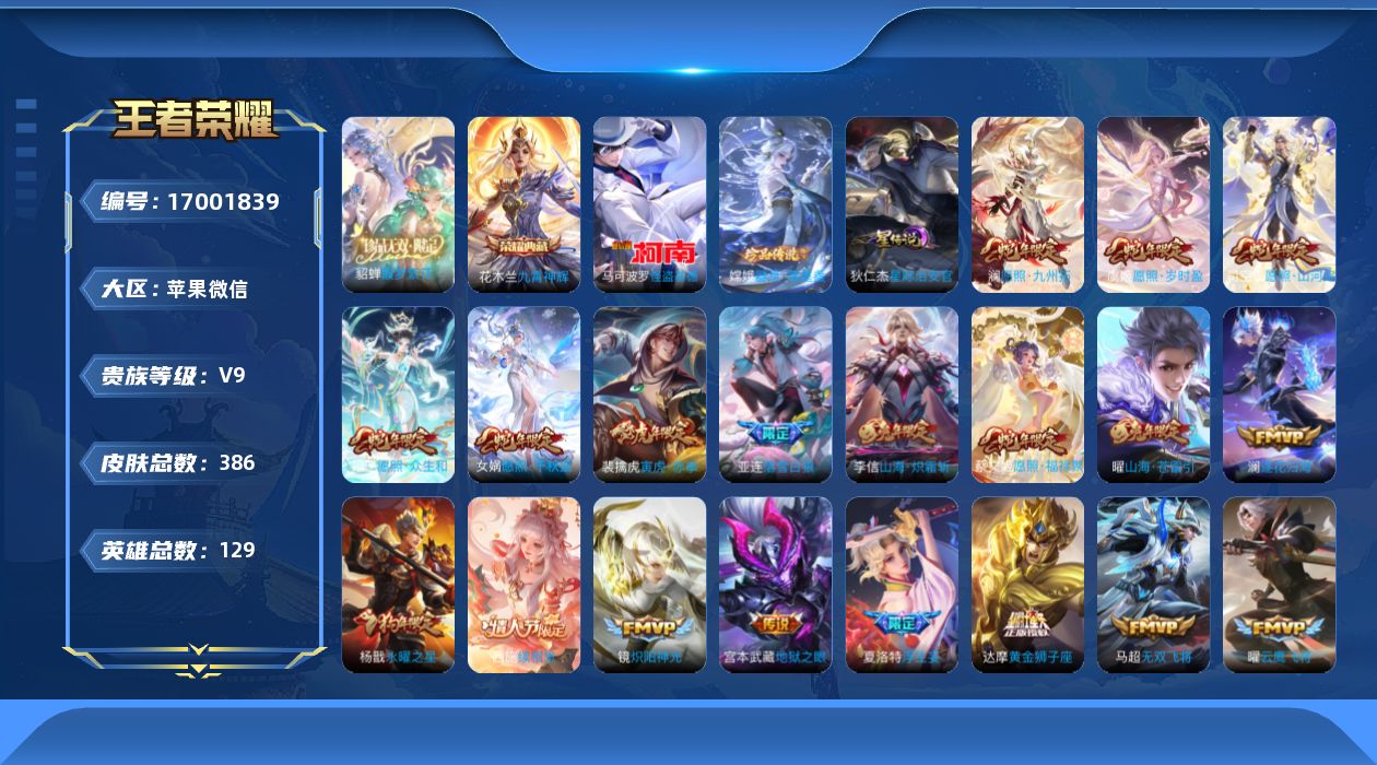 [17001839]苹果WX-128279积分!对抗55段!打野41段!11金标!V9-129英雄-386皮肤-1典藏皮肤-1典藏英雄-1珍品无双-2珍品传说-27传说-112史诗-1星元 【英雄全皮】:达摩全皮,孙权全皮,橘右京全皮,猪八戒全皮,敖隐全皮,蒙恬全皮,夏洛特全皮,司空震全皮,影全皮 【荣耀典藏】:武则天英雄,花木兰九霄神辉 【珍品无双】:貂蝉馥梦繁花 【珍品传说】:马可波罗怪盗基德,嫦娥器灵落星盏 【传说皮肤】:西施续相思,杨玉环星之鸣奏,司空震愿照山河定,女娲愿照千秋盛,妲己愿照众生和,澜愿照九州拓,蔡文姬愿照福禄聚,虞姬愿照岁时盈,亚连落雪白狼,澜逐花归海,夏洛特浮生妄,小乔山海琳琅生,曜山海苍雷引,李信山海炽霜斩,李白诗剑行,橘右京枫霜尽,马超无双飞将,裴擒虎寅虎赤拳,孙尚香异界灵契,镜炽阳神光,虞姬启明星使,曜云鹰飞将,干将莫邪久胜战神,达摩黄金狮子座,杨戬永曜之星,宫本武藏地狱之眼,狄仁杰超时空战士 【限定皮肤】:大乔绒语心约,姜子牙天穹之誓,狄仁杰阴阳师,小乔山海琳琅生,赵云皇家上将,墨子神迹守卫,孙尚香异界灵契,庄周高山流水,高渐离玩趣恶龙,钟无艳超时空战士,扁鹊奇幻香踪,白起夜都怪侠,芈月白晶晶,芈月幻夜卜梦,吕布御风骁将,元歌云间偶戏,元歌无心,甄姬女儿国国王,甄姬落雪兰心,马可波罗暗影游猎,马可波罗山海玄木吟,狄仁杰魔术师,狄仁杰万华元夜,达摩星际陆战队,达摩沙漠行僧,项羽海滩派对,老夫子醍醐杖,老夫子航海奇遇记,关羽冰锋战神,程咬金演武夺筹,王昭君午后时光,兰陵王金庭之子,花木兰青春决赛季,花木兰默契交锋,橘右京枫霜尽,亚瑟潮玩骑士王,孙悟空至尊宝,孙悟空孙行者,后羿圣弓游侠,张飞虎魄,李元芳银河之约,李元芳云中旅人,虞姬启明星使,钟馗驱傩正仪,杨玉环寅虎心曲,杨戬永曜之星,杨戬潮玩骑兵,女娲朔望之晖,干将莫邪真爱魔法,雅典娜黎明之约,蔡文姬繁星吟游,鬼谷子原初探秘者,鬼谷子五谷丰年,黄忠火炮绅士,苏烈千军破阵,百里玄策原初追逐者,弈星混沌棋,梦奇顽趣,沈梦溪星空之诺,沈梦溪大漠名商,明世隐疑决卦,明世隐吟游魔法,裴擒虎天狼狩猎者,裴擒虎李小龙,裴擒虎寅虎赤拳,裴擒虎擒涛扼浪,狂铁电玩高手,米莱狄胡桃异想国,瑶山海碧波行,云中君纤云弄巧,李信山海炽霜斩,猪八戒西部大镖客,猪八戒猪悟能,嫦娥拒霜思,嫦娥暖冬兔眠,曜山海苍雷引,西施玲珑珍味,鲁班大师