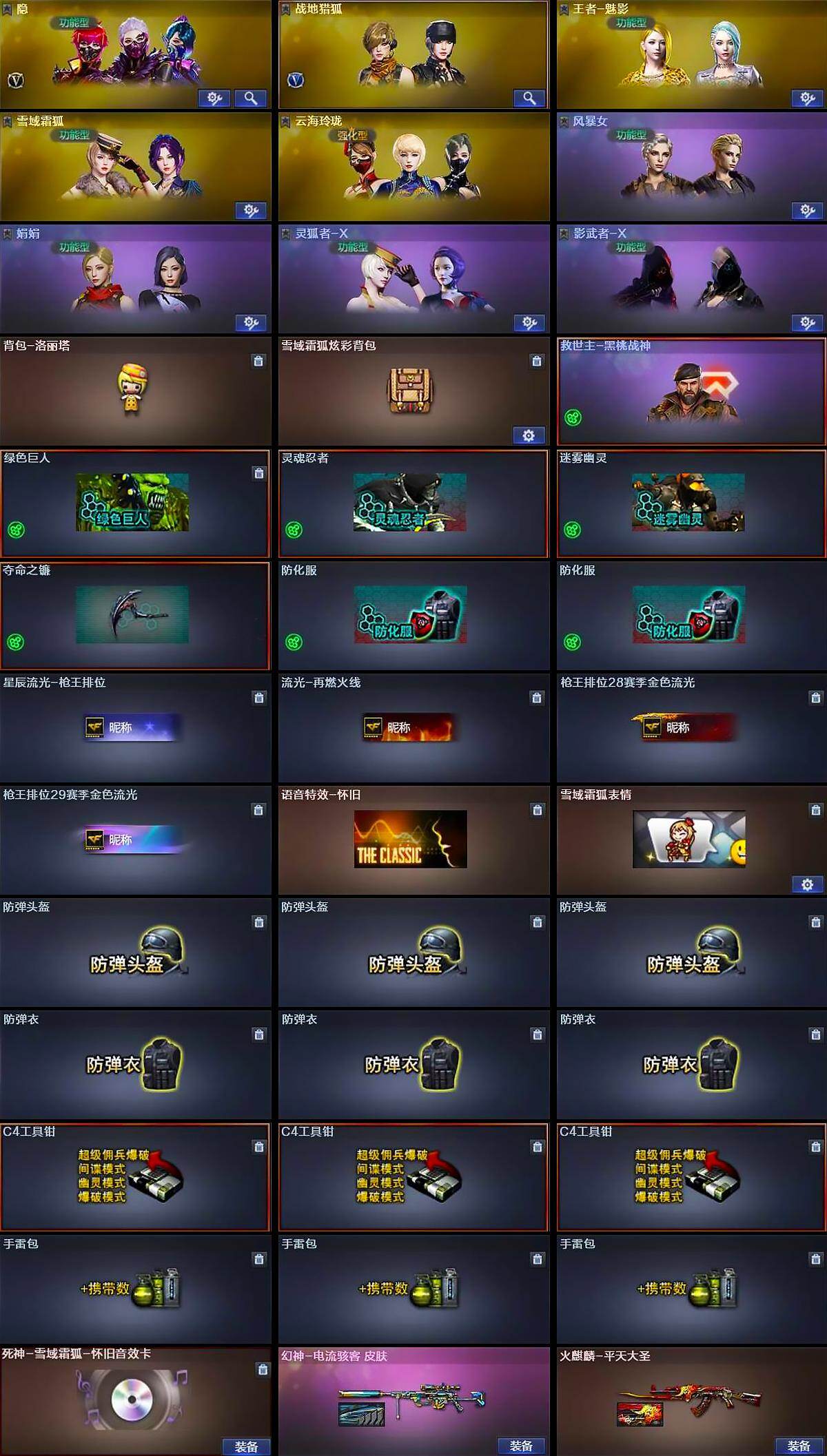 【道具】:背包-洛丽塔,雪域霜狐炫彩背包,救世主-黑桃战神,绿色巨人,灵魂忍者,迷雾幽灵,夺命之镰,防化服*2,星辰流光-枪王排位,流光-再燃火线,枪王排位28赛季金色流光,枪王排位29赛季金色流光,语音特效-怀旧,雪域霜狐表情,防弹头盔*3,防弹衣*3,C4工具钳*3,手雷包*3