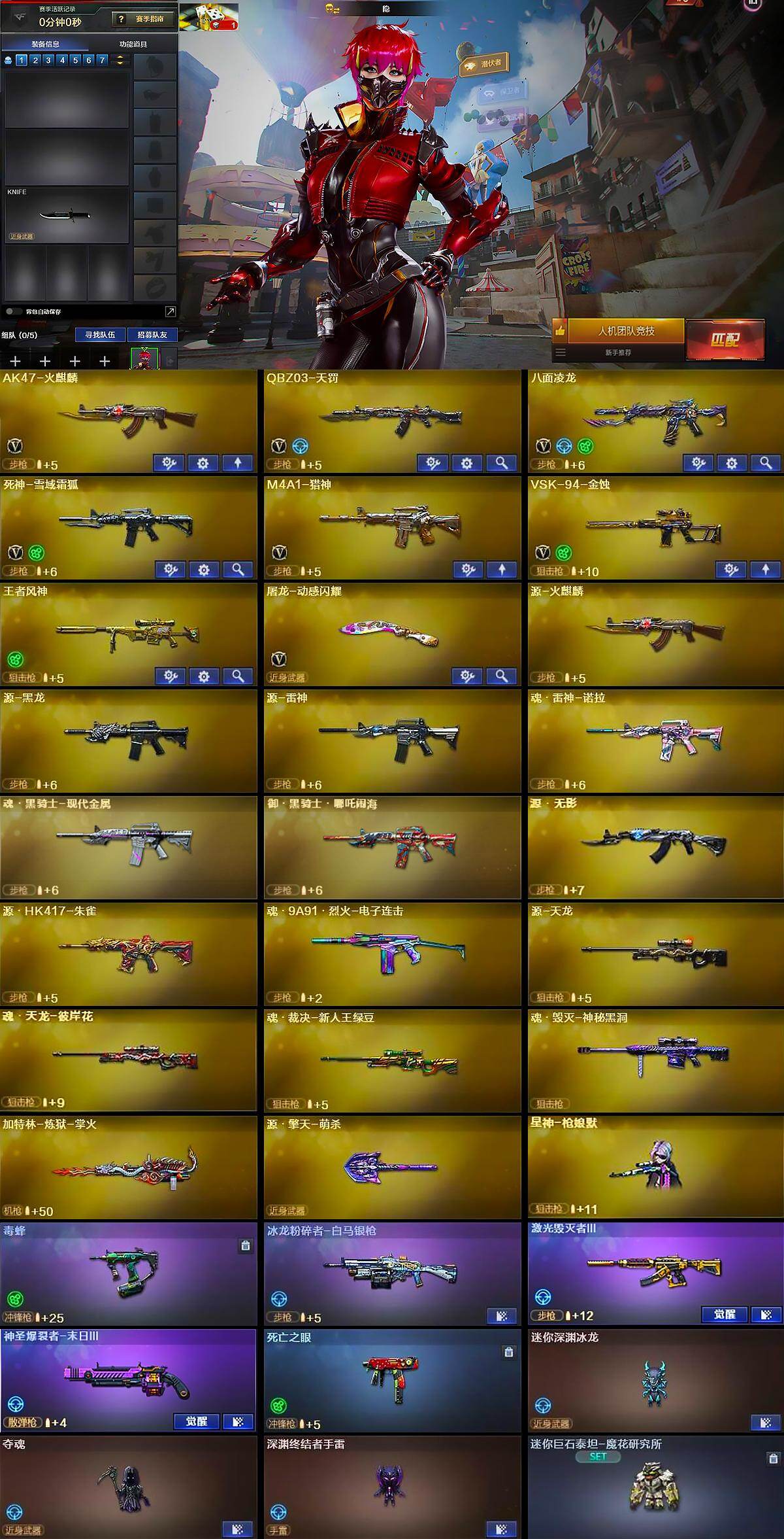 【英雄级武器】:AK47-火麒麟,QBZ03-天罚,八面凌龙,死神-雪域霜狐,M4A1-猎神,VSK-94-金蚀,屠龙-动感闪耀