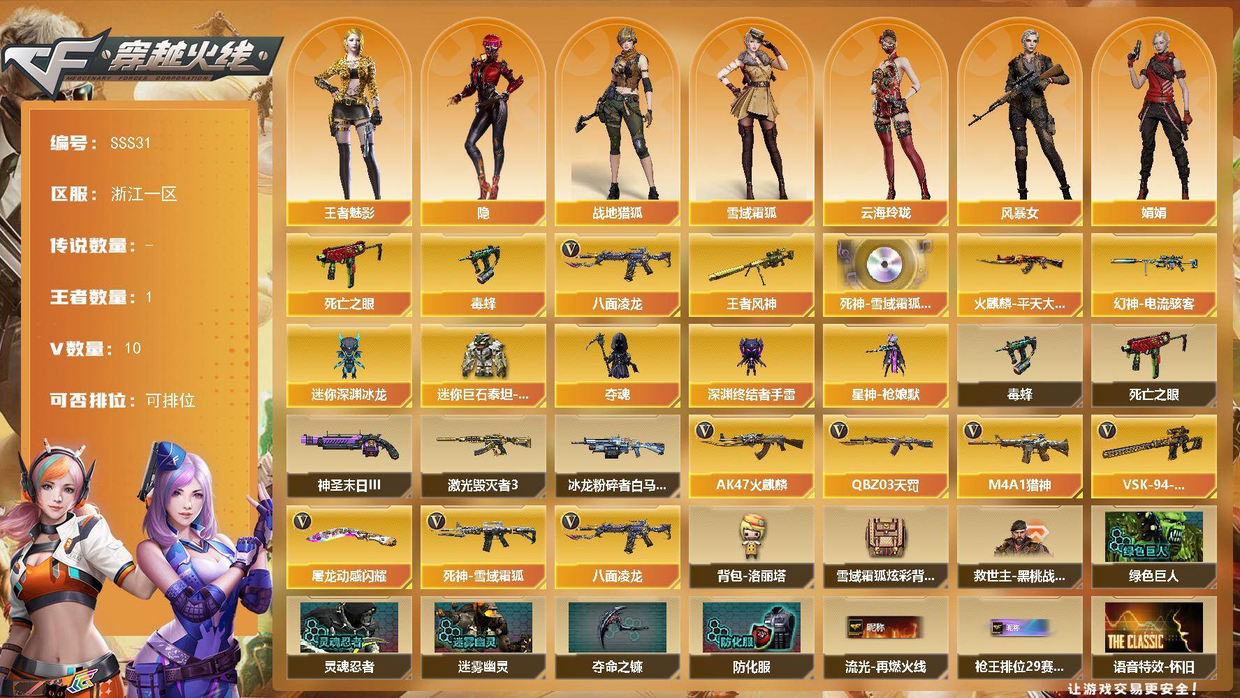 [17290465]浙江一区-9V-1王者武器数-0炫金武器数 【热门武器】:八面凌龙,死亡之眼,毒蜂 【王者炫金武器】:王者风神 【音效卡】:死神-雪域霜狐-怀旧音效卡 【皮肤】:幻神-电流骇客 皮肤,火麒麟-平天大圣 【角色】:隐,战地猎狐,王者-魅影,雪域霜狐,云海玲珑,风暴女,娟娟,灵狐者-X,影武者-X 【人偶武器】:星神-枪娘默,迷你深渊冰龙,夺魂,深渊终结者手雷,迷你巨石泰坦-魔花研究所 【暴走生化】:毒蜂,死亡之眼 【挑战大师】:冰龙粉碎者-白马银枪,激光毁灭者III,神圣爆裂者-末日III 【英雄级武器】:AK47-火麒麟,QBZ03-天罚,八面凌龙,死神-雪域霜狐,M4A1-猎神,VSK-94-金蚀,屠龙-动感闪耀 【道具】:背包-洛丽塔,雪域霜狐炫彩背包,救世主-黑桃战神,绿色巨人,灵魂忍者,迷雾幽灵,夺命之镰,防化服*2,星辰流光-枪王排位,流光-再燃火线,枪王排位28赛季金色流光,枪王排位29赛季金色流光,语音特效-怀旧,雪域霜狐表情,防弹头盔*3,防弹衣*3,C4工具钳*3,手雷包*3 【特殊枪械】:
