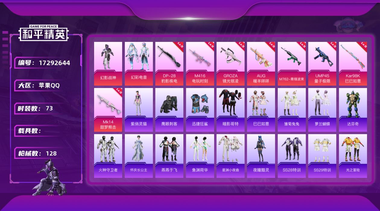 [17292644]苹果 手Q-2粉装-11特效枪-0载具-0粉色飞行器-35146热力值-2王牌印记-73套装-128枪皮