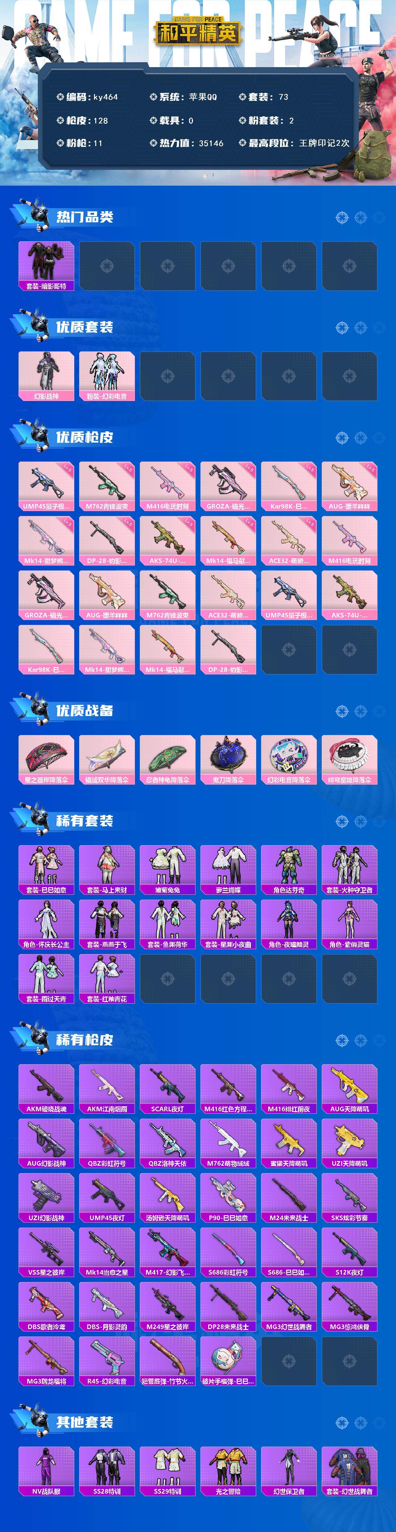 [17292644]苹果 手Q-2粉装-11特效枪-0载具-0粉色飞行器-35146热力值-2王牌印记-73套装-128枪皮 【热门品类】:套装-暗影哥特 【粉色套装】:粉装-幻影战神,粉装-幻彩电音 【粉色枪皮等级】:M416-电玩时刻(五级),GROZA-镜光银凌(五级),AUG-暖羊咩咩(五级),M762-青锋波束(五级),ACE32-萌骑漫游(五级),UMP45-量子极限(五级),AKS-74U-森灵之息(五级),Kar98K-巳巳如意(五级),Mk14-甜梦熊击(五级),Mk14-福马献瑞(五级),DP-28-豹影疾电(五级) 【粉色枪皮】:M416-电玩时刻,GROZA-镜光银凌,AUG-暖羊咩咩,M762-青锋波束,ACE32-萌骑漫游,UMP45-量子极限,AKS-74U-森灵之息,Kar98K-巳巳如意,Mk14-甜梦熊击,Mk14-福马献瑞,DP-28-豹影疾电 【粉色降落伞】:星之彼岸降落伞,镜域双华降落伞,忍者神龟降落伞,鬼刀降落伞,幻彩电音降落伞,绯穹魔姬降落伞 【稀有套装】:套装-巳巳如意,套装-马上来财,套装-雏菊兔兔,套装-萝兰蝴蝶,角色-达芬奇,套装-火种守卫者,角色-怀庆长公主,套装-燕燕于飞,套装-鱼渊荷华,套装-星渊小夜曲,角色-夜瞳黯灵,角色-紫俏灵猫,套装-雨过天青,套装-红釉青花 【稀有枪皮】:AKM-江南烟雨,AKM-破晓战魂,SCAR-L-夜灯,M416-红色方程式,M416-绯红前夜,AUG-天降萌叽,AUG-幻影战神,QBZ-彩虹符号,QBZ-洛神天依,M762-萌物绒绒,蜜獾-天降萌叽,UZI-天降萌叽,UZI-幻影战神,UMP45-夜灯,汤姆逊-天降萌叽,P90-巳巳如意,M24-未来战士,SKS-炫彩节奏,VSS-星之彼岸,Mk14-治愈之星,M417-幻影飞狐,S686-彩虹符号,S686-巳巳如意,S12K-夜灯,DBS-歌者泠鸢,DBS-月影灵韵,M249-星之彼岸,DP-28-未来战士,MG3-幻世战舞者,MG3-惊鸿侠骨,MG3-瑞龙福将,R45-幻彩电音,短管霰弹-竹节火铳,破片手榴弹-巳巳如意 【其他套装】:套装-NV战队服,套装-SS28特训,套装-SS29特训,套装-光之冒险,套装-幻世保卫者,套装-幻世战舞者,套装-探宝勇士,套装-旭日情侣,套装-暗影哥特,套装-极速红龙,套装-森林游猎者,套装-海岛探路