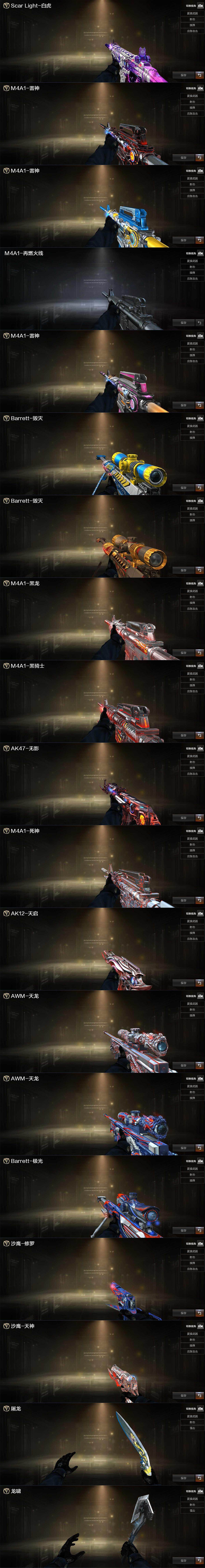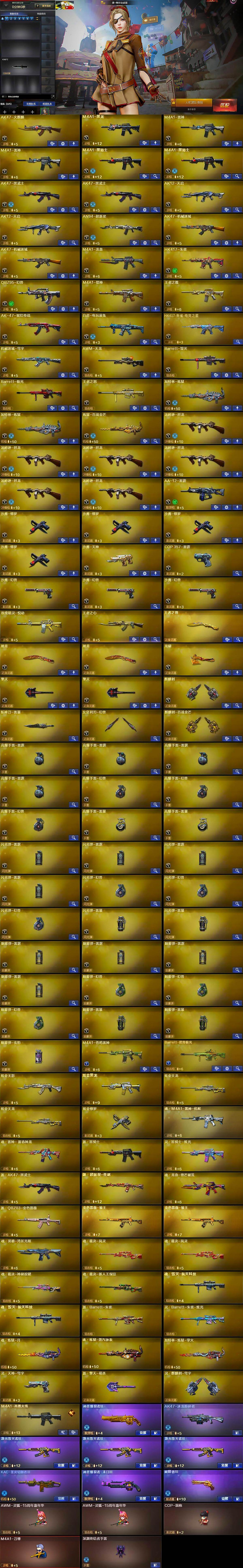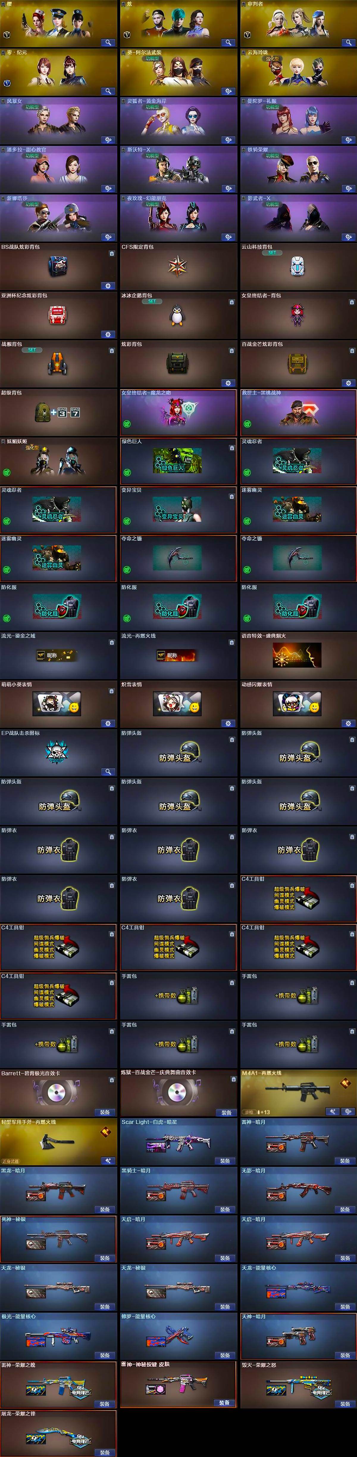 【英雄级武器】:AK47-火麒麟,M4A1-黑龙,M4A1-雷神*2,M4A1-黑骑士*2,AK47-黑武士*2,AK12-天启*2,AN94-超新星,AK47-机械迷城*2,M4A1-龙血,HK417-朱雀,QBZ95-幻兽,M4A1-猎神,王者之魄-觉醒版,AK-47-猩红传说,白虎-电玩蓝兔,HK417-朱雀-电竞之星,机械迷城-穹宇,AWM-天龙,Barrett-毁灭,Barrett-极光,王者之怒-觉醒版,加特林-炼狱*2,炼狱-百战金芒,汤姆逊-烈龙*6,AA-12-雷霆,沙鹰-修罗*4,沙鹰-天神,COP-雷霆,沙鹰-幻兽*3,屠龙*2,龙啸,擎天*2,麒麟刺,斩神刀-雷暴,女皇利刃-幻兽,麒麟刺-百战金芒,高爆手雷-雷霆*4,高爆手雷-幻兽*3,高爆手雷-雷暴*2,闪光弹-雷霆*4,闪光弹-幻兽*3,闪光弹-雷暴*2,烟雾弹-雷霆*4,烟雾弹-幻兽*3,烟雾弹-雷暴*2,烟雾弹-玄豹,M4A1-苍鸣雷神,Barrett-碧霄极光