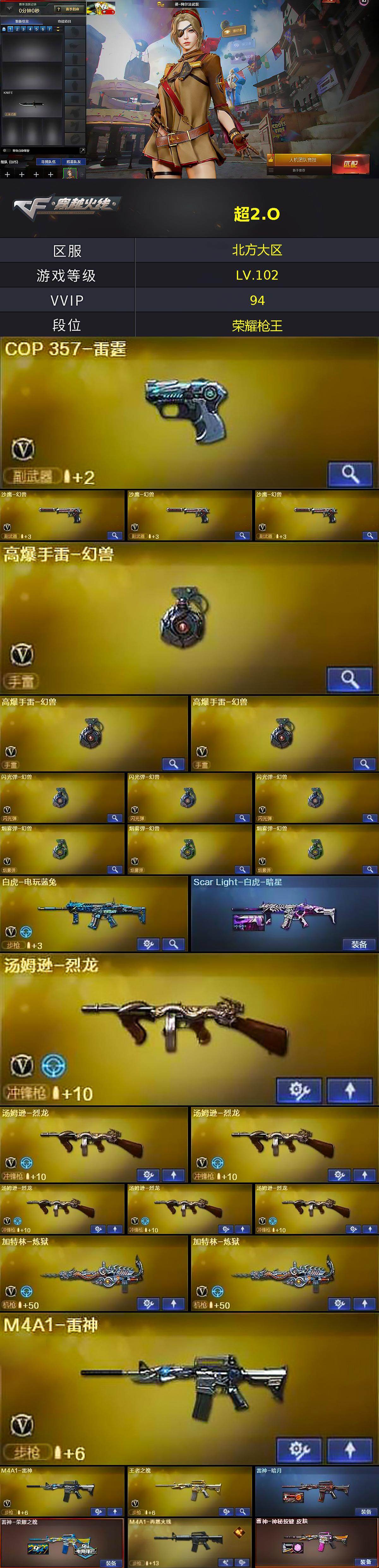 [17292939]北方大区-101V-5王者武器数-5炫金武器数 【热门武器】:HK417-朱雀,白虎-电玩蓝兔,M4A1-黑骑士*2,汤姆逊-烈龙*6,加特林-炼狱*2,沙鹰-修罗*4,高爆手雷-幻兽*3 【王者炫金武器】:玫瑰精灵-悦动,王者之心,王者之锋,炫金无影,炫金黑龙,炫金天龙*2,炫金修罗 【音效卡】:Barrett-碧霄极光音效卡,炼狱-百战金芒-庆典舞曲音效卡 【皮肤】:Scar Light-白虎-暗星,雷神-暗月,雷神-荣耀之魄,M4A1-再燃火线,雷神-神秘按键 皮肤,毁灭-荣耀之怒,毁灭-英雄计划 皮肤,黑龙-暗月,黑骑士-暗月,无影-暗月,死神-秘银,天启-暗月*2,天龙-秘银*2,天龙-能量核心,极光-能量核心,修罗-能量核心,天神-暗月,屠龙-荣耀之锋,轻型军用手斧-再燃火线 【角色】:樱,炫,审判者,零·纪元,云海玲珑,葵-阿尔法武装,风暴女,灵狐者-黄金海岸,曼陀罗-礼服,潘多拉-甜心教官,斯沃特-X,铁骑荣耀,新娜塔莎,夜玫瑰-幻能朋克,影武者-X 【人偶武器】:AWM-灵狐-15周年嘉年华*2,COP-旗袍,M4A1-刀锋,深渊终结者手雷 【挑战大师】:神圣爆裂者III,AK47-冰龙粉碎者,激光毁灭者III*3,KAC-圣炎切割者III,神圣爆裂者-末日III,阐释者III 【英雄级武器】:AK47-火麒麟,M4A1-黑龙,M4A1-雷神*2,M4A1-黑骑士*2,AK47-黑武士*2,AK12-天启*2,AN94-超新星,AK47-机械迷城*2,M4A1-龙血,HK417-朱雀,QBZ95-幻兽,M4A1-猎神,王者之魄-觉醒版,AK-47-猩红传说,白虎-电玩蓝兔,HK417-朱雀-电竞之星,机械迷城-穹宇,AWM-天龙,Barrett-毁灭,Barrett-极光,王者之怒-觉醒版,加特林-炼狱*2,炼狱-百战金芒,汤姆逊-烈龙*6,AA-12-雷霆,沙鹰-修罗*4,沙鹰-天神,COP-雷霆,沙鹰-幻兽*3,屠龙*2,龙啸,擎天*2,麒麟刺,斩神刀-雷暴,女皇利刃-幻兽,麒麟刺-百战金芒,高爆手雷-雷霆*4,高爆手雷-幻兽*3,高爆手雷-雷暴*2,闪光弹-雷霆*4,闪光弹-幻兽*3,闪光弹-雷暴*2,烟雾弹-雷霆*4,烟雾弹-幻兽*3,烟雾弹-雷暴*2,烟雾弹-玄豹,M4A1-苍鸣雷神,Barrett-碧霄极光 【道具】:BS战队炫彩背包