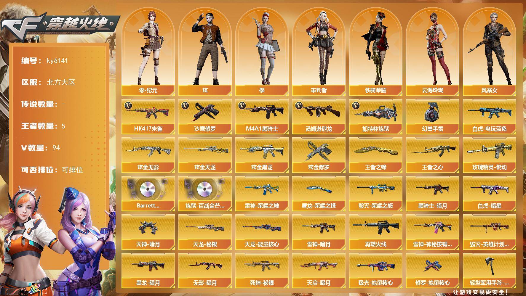 - [14305763]河南一区-34V-6王者-0炫金 【热门武器】:M14EBR-玄武,死亡之眼,M4A1-黑骑士,汤姆逊-烈龙*4,RPK-盘龙*5,加特林-炼狱 【王者炫金武器】:王者之城 【音效卡】:AK47-火麒麟音效卡,M4A1-雷神音效卡,Barrett-毁灭音效卡,死神-雪域霜狐-怀旧音效卡 【皮肤】:雷神-机甲刑天皮肤,雷神-宇航兔皮肤,火麒麟-平天大圣*2,火麒麟-心动糖果,毁灭-风暴,M4A1-千变-孔明皮肤,黑骑士-战神马超,轻型军用手斧-再燃火线 【角色】:战地猎狐,王者潘多拉,雪域霜狐,云海玲珑,暗夜-X,北极狐-X,初恋灵狐,电竞少女,芳心审判者,飞虎队-X,风暴女,嘉年华灵狐,兰妹妹,灵动武士,灵狐者-X,灵狐者-七夕宝贝,曼陀罗-X,曼陀罗-礼服,潘多拉-甜心教官,青霞仙子,斯沃特-X,铁骑荣耀,兔囡囡,雪莉杨-摸金校尉,夜玫瑰-幻能朋克,樱-战斗天使,游珑儿 【人偶武器】:天龙-曼陀罗,加特林-机械猎手,AWM-灵狐-15周年嘉年华,迷你裂空之翼,迷你生化手雷*3,生化手雷-机甲核心*2 【暴走生化】:异变清道夫,双面神,死亡之眼,超级对讲机 【挑战大师】:激光毁灭者III*4,神圣爆裂者-末日III*2 【英雄级武器】:AK47-火麒麟,M4A1-雷神,M4A1-黑骑士,M4A1-死神,M14EBR-玄武,无影-神兵利器,黑武士-锦绣游龙,死神-雪域霜狐,王者芳薇-觉醒版,AWM-天龙,Barrett-毁灭,AWM-裁决,王者风神-觉醒版,RPK-盘龙*5,加特林-炼狱,汤姆逊-烈龙*4,烈龙-云海游龙,王者之灵-觉醒版,幻灵之锋,擎天-云海游龙,高爆手雷-幻灵*2,手雷-云海游龙,闪光弹-幻灵*3,烟雾弹-幻灵*2 【道具】:CFS限定背包,云山科技背包,云海游龙炫彩背包,全能枪王背包,女皇终结者-背包,炫彩背包,背包-洛丽塔,雪域霜狐炫彩背包,圣拳猎手-炽雪,女皇终结者-魔龙之吻,救世主-黑桃战神,绿色巨人,灵魂忍者*2,变异宝贝,迷雾幽灵*2,生化弹匣,夺命之镰,防化服*3,金色流光-枪王排位*2,星辰流光-枪王排位,枪王排位28赛季金色流光,语音特效-怀旧,雪域霜狐表情,斯沃特表情,云海游龙表情,防弹头盔*5,防弹衣*5,C4工具钳*5,手雷包*5 【特殊枪械】:1黑骑士,4烈龙,5盘龙,1炼狱