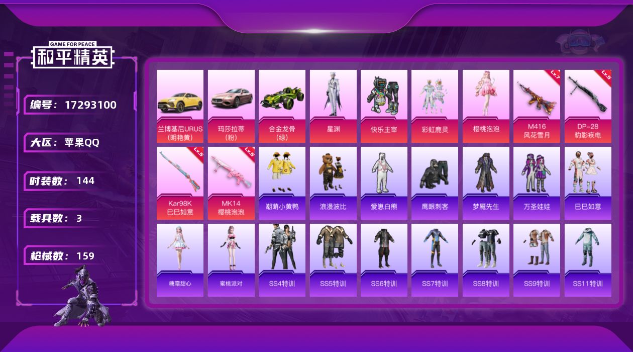 [17293100]苹果 手Q-4粉装-7特效枪-3载具-1粉色飞行器-53109热力值-8王牌印记-144套装-159枪皮 【热门品类】:套装-潮萌小黄鸭,套装-浪漫波比 【粉色套装】:粉装-快乐主宰,粉装-彩虹鹿灵,角色-樱桃泡泡,角色-星渊 【粉色枪皮等级】:M416-风花雪月(七级),ACE32-萌骑漫游(三级),AKS-74U-森灵之息(三级),Kar98K-巳巳如意(五级),Mk14-樱桃泡泡(五级),Mk14-福马献瑞(五级),DP-28-豹影疾电(五级) 【粉色载具】:兰博基尼URUS(明艳黄),玛莎拉蒂Ghibli(粉),合金龙骨(绿) 【粉色枪皮】:M416-风花雪月,ACE32-萌骑漫游,AKS-74U-森灵之息,Kar98K-巳巳如意,Mk14-樱桃泡泡,Mk14-福马献瑞,DP-28-豹影疾电 【粉色飞行器】:星夜魔法师飞行翼 【粉色降落伞】:马卡龙降落伞,夏日绵绵冰降落伞,橘柚倾心降落伞,彩虹独角兽降落伞,樱桃泡泡降落伞,炫彩糖果降落伞,虎痴许褚降落伞 【稀有套装】:套装-巳巳如意,套装-马上有钱,角色-糖霜甜心,角色-蜜桃派对,套装-雨过天青,套装-红釉青花 【稀有枪皮】:AKM-夜灯,AKM-彩虹符号,AKM-生命誓言,AKM-破晓战魂,AKM-霓虹街区,M16A4-凝视深渊,M16A4-幻世战舞者,M16A4-生命誓言,M16A4-红色方程式,M16A4-魔法学院,SCAR-L-炫彩节奏,SCAR-L-红色方程式,M416-生命誓言,M416-红色方程式,M416-蓝色火焰,GROZA-彩虹符号,GROZA-黑色刀锋,AUG-魔法学院,QBZ-原初圣火,QBZ-彩虹符号,QBZ-洛神天依,QBZ-诡娃娃,QBZ-飞驰魅影,M762-天降萌叽,M762-拳皇97,M762-烈焰拳霸,M762-牛气冲天,M762-诡娃娃,M762-镭射皇者,M762-魅夜紫皇,Mk47-粉色回忆,AC-VAL-天降萌叽,AC-VAL-彩虹甜喵,Famas-镜中幻,UZI-红色方程式,UMP45-春暖花开,UMP45-生命誓言,UMP45-荒野猎神,UMP45-蓝色火焰,UMP45-诡娃娃,Vector-南瓜骑士,Vector-彩虹符号,Vector-生命誓言,Vector-黑色刀锋,汤姆逊-耀粉歌者,汤姆逊-樱桃泡泡,P90-飞驰魅影,Kar98K-彩虹符号,Kar98