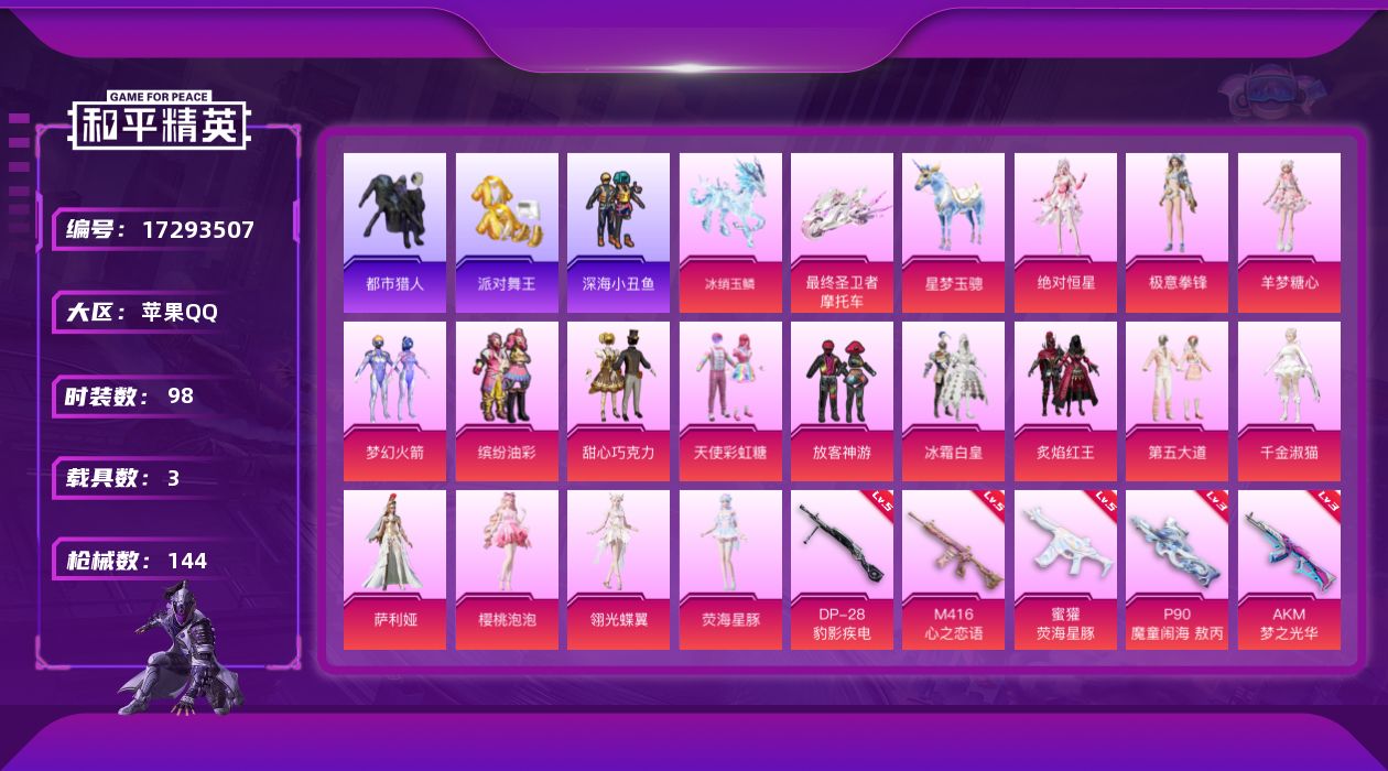 [17293507]苹果 手Q-1神装-17粉装-12特效枪-3载具-10粉色飞行器-59718热力值-5王牌印记-98套装-144枪皮