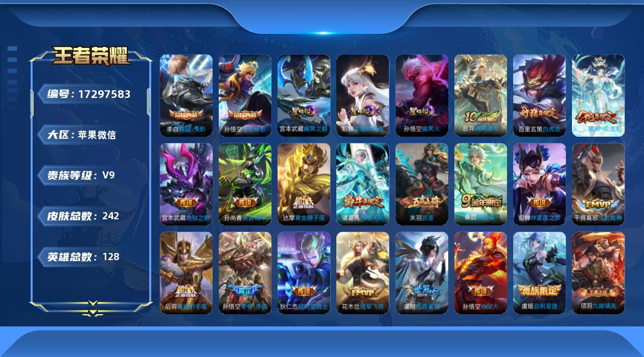 [17297583]苹果WX-122688积分!V9-至尊星耀I段位-128英雄-242皮肤-2典藏皮肤-18传说-75史诗-3星元 【荣耀典藏】:孙悟空全息碎影,李白鸣剑曳影 【传说皮肤】:后羿神树通天,妲己愿照众生和,桑启鸣野蒿,诸葛亮时雨天司,虞姬启明星使,孙悟空零号赤焰,关羽武圣,干将莫邪久胜战神,虞姬云霓雀翎,达摩黄金狮子座,百里玄策白虎志,花木兰冠军飞将,后羿黄金射手座,貂蝉仲夏夜之梦,孙尚香末日机甲,宫本武藏地狱之眼,孙悟空地狱火,狄仁杰超时空战士 【限定皮肤】:蒙犽顽岩魄,姜子牙天穹之誓,狄仁杰阴阳师,赵云皇家上将,妲己时之彼端,孙尚香蔷薇恋人,鲁班七号狮舞东方,阿轲迷踪丽影,周瑜赤莲之焰,元歌云间偶戏,元歌无心,夏侯惇朔风刀,曹操天狼征服者,典韦蓝屏警告,马可波罗暗影游猎,狄仁杰魔术师,狄仁杰万华元夜,项羽海滩派对,老夫子醍醐杖,关羽武圣,程咬金演武夺筹,刘邦夺宝奇兵,韩信飞衡,兰陵王驯魔猎人,亚瑟潮玩骑士王,孙悟空至尊宝,孙悟空大圣娶亲,孙悟空零号赤焰,牛魔御旌,后羿辉光之辰,李元芳银河之约,虞姬启明星使,钟馗神迹守卫,钟馗驱傩正仪,女娲朔望之晖,干将莫邪冰霜恋舞曲,雅典娜单词大作战,雅典娜黎明之约,蔡文姬繁星吟游,鬼谷子原初探秘者,诸葛亮时雨天司,铠青龙志,百里玄策白虎志,百里玄策原初追逐者,弈星混沌棋,沈梦溪星空之诺,明世隐疑决卦,裴擒虎李小龙,米莱狄御霄,云中君纤云弄巧,盾山御銮,猪八戒西部大镖客,上官婉儿梁祝,蒙犽狂想玩偶喵,鬼谷子天穹祈灯,姬小满妄想食味,沈梦溪龙舞盛年,刘邦剑破天穹,周瑜熔金海岸 【年限皮肤】:后羿辉光之辰,百里玄策白虎志,铠青龙志,韩信飞衡,诸葛亮时雨天司,妲己愿照众生和 【赛季限定】:米莱狄御霄,牛魔御旌,盾山御銮,夏侯惇朔风刀,弈星混沌棋,明世隐疑决卦,老夫子醍醐杖,鬼谷子原初探秘者,狄仁杰万华元夜,程咬金演武夺筹,钟馗驱傩正仪,鬼谷子天穹祈灯,刘邦剑破天穹,姜子牙天穹之誓,东皇太一噬灭天穹,太乙真人谧流熔炉,钟馗虚灵犬护,甄姬逆浪荇歌,亚瑟荣光之誓,百里玄策原初追逐者,雅典娜黎明之约,项羽九幽镇关 【战令限定】:典韦蓝屏警告,女娲朔望之晖,鲁班七号狮舞东方,钟馗神迹守卫,兰陵王驯魔猎人,周瑜赤莲之焰,李元芳银河之约,沈梦溪星空之诺,阿轲迷踪丽影,刘邦夺宝奇兵,马可波罗暗影游猎,猪八戒西部大镖客,蒙犽狂想玩偶喵,雅典娜单词大作战,